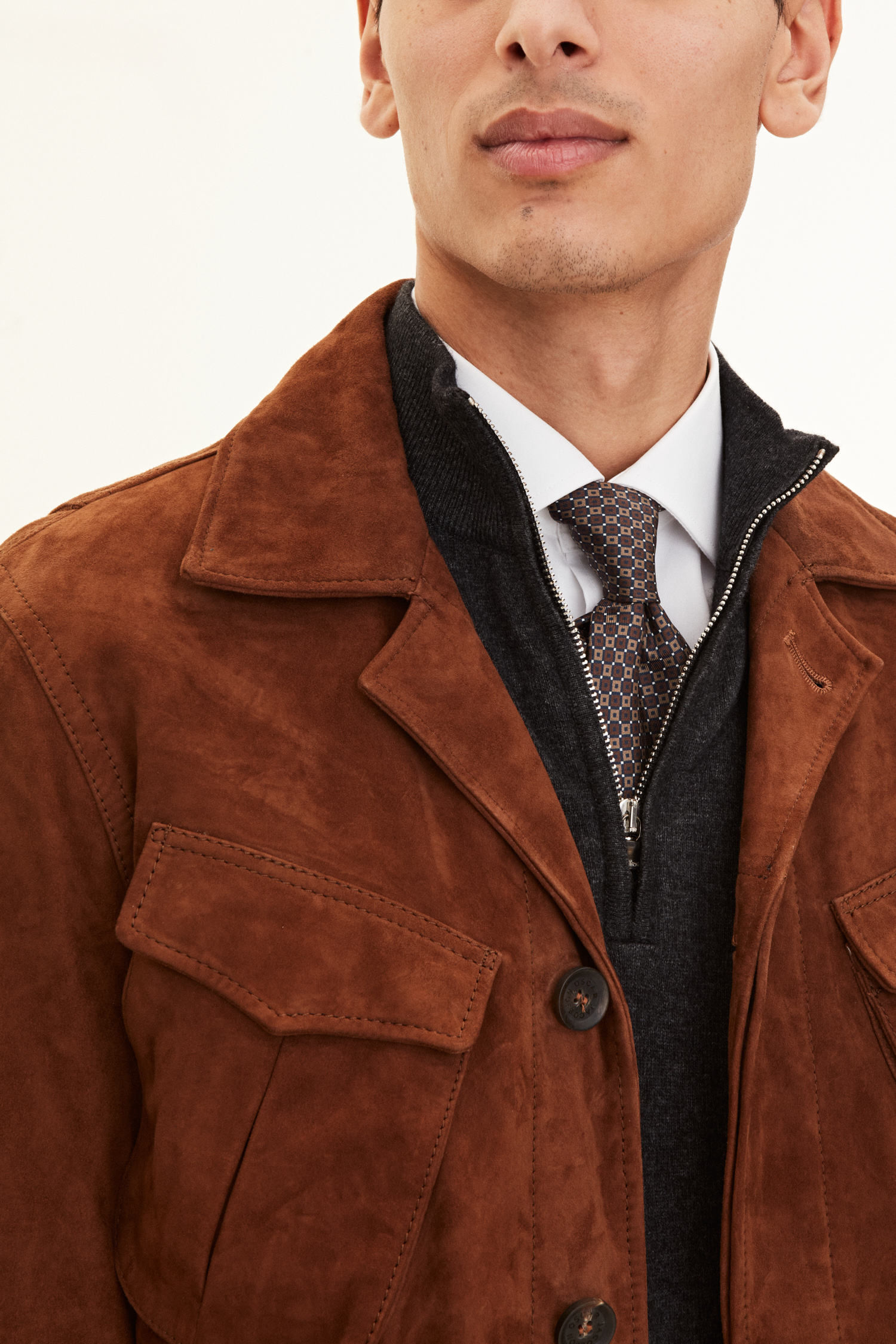 Jakke i safarimodel med detaljer inspireret af arbejdstøj. Jakken er lavet med dobbelt talje og brystlommer samt forsynet med skjult knaplukning. Vi anbefaler at vælge en størrelse mindre, da jakken er lidt stor i størrelsen.