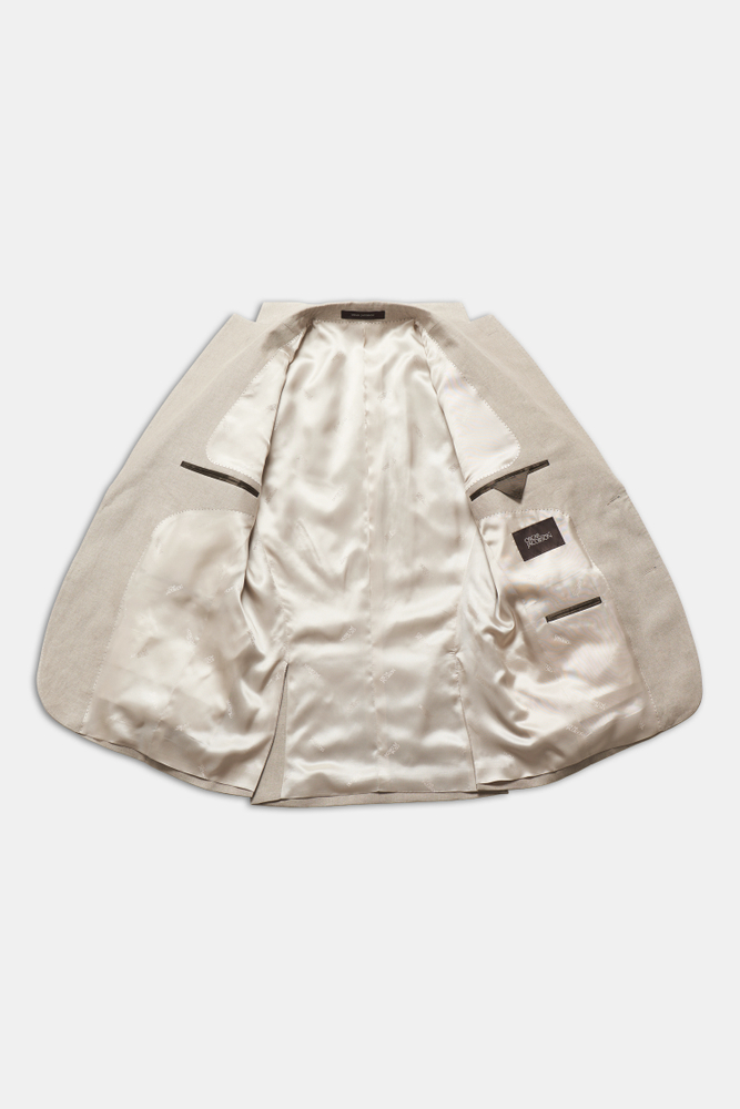 Klubtøj i mørkeblåt uldgarn med struktur fra det italienske væveri Marzotto. En blød konstruktion, hvor mellemlag og skulderopbygning er næsten ikke-eksisterende. Jakken er foret og har lommer med lommeklap. De tilhørende bukser har en klassisk, let tilspidset pasform og en normaltalje.