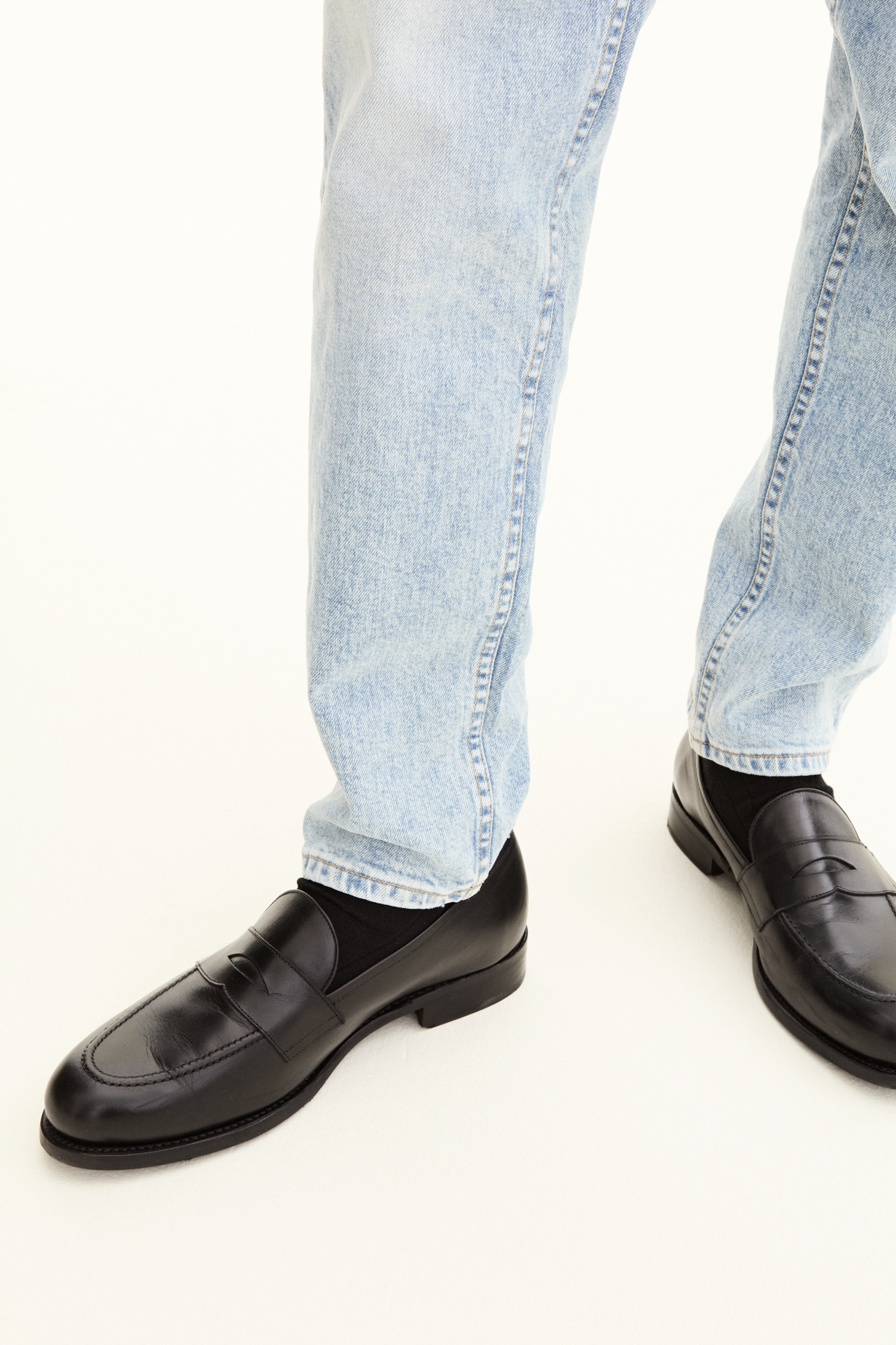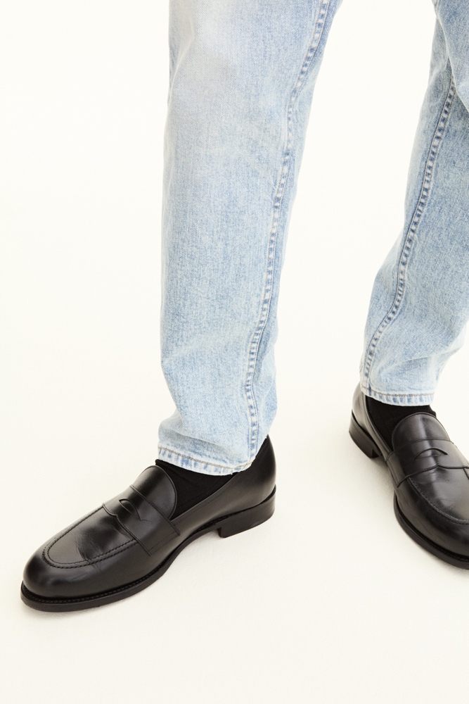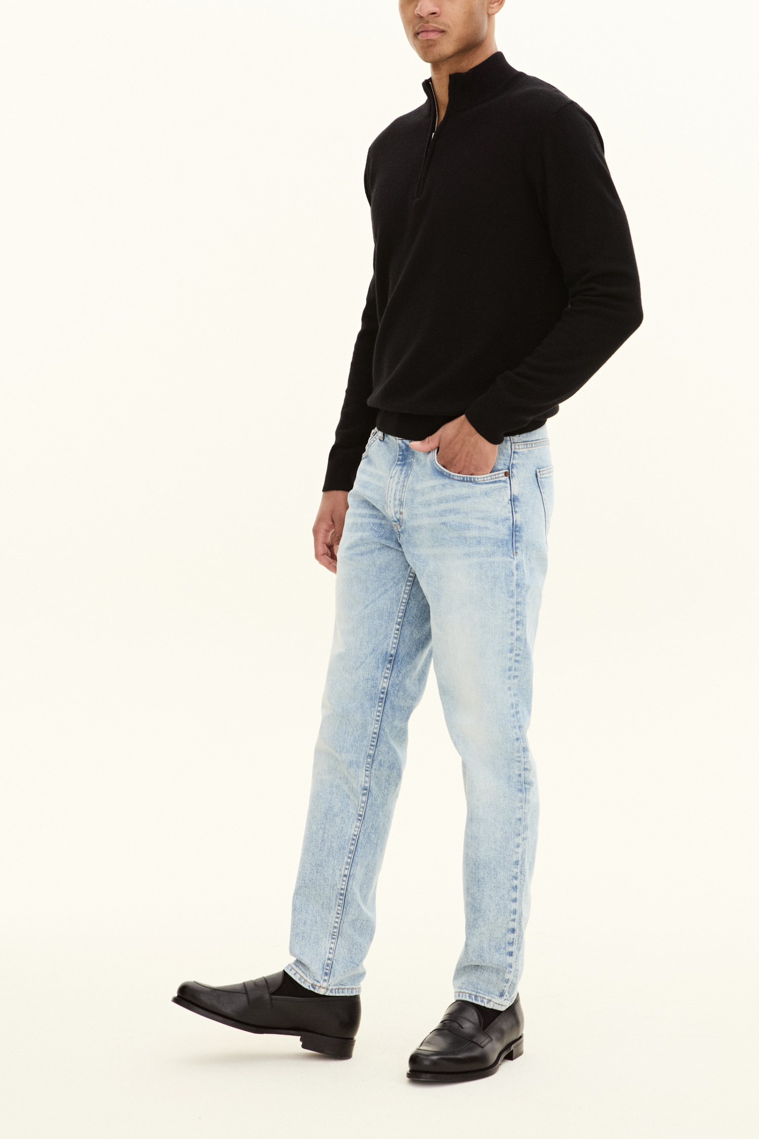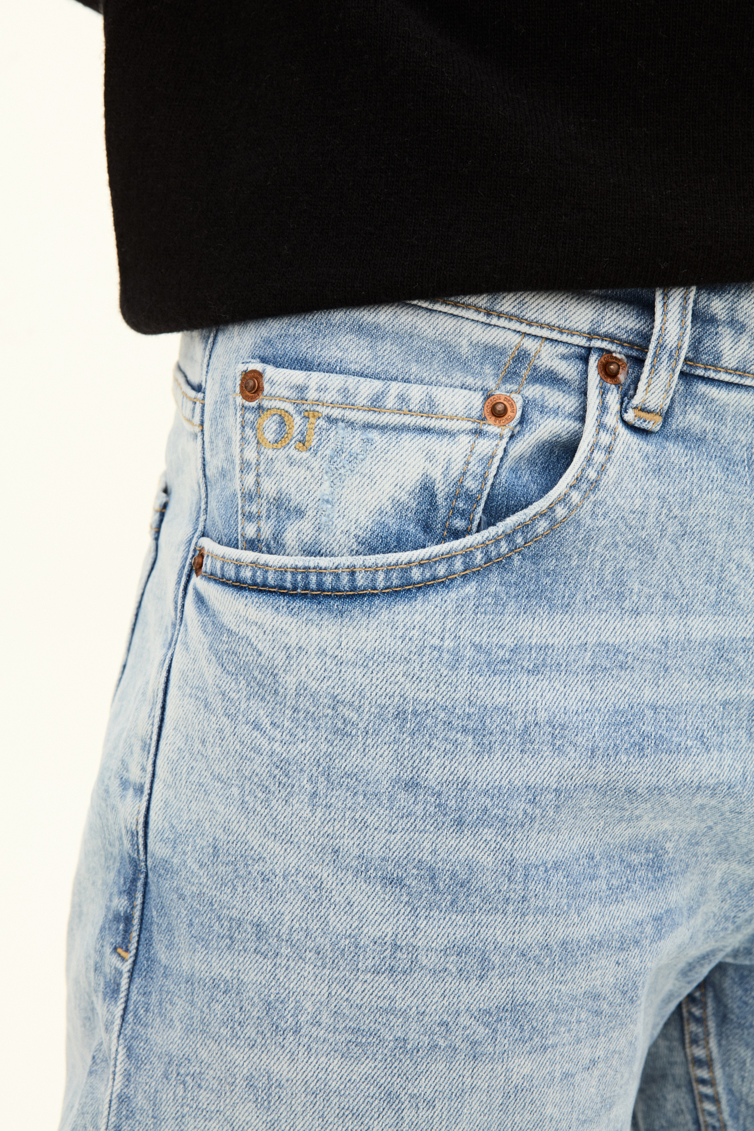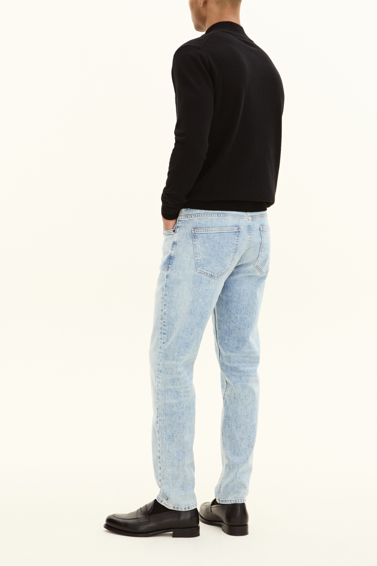 Pasformen er løs ved lår og knæ med indsnævrede ben, taljen er høj til normal. Lavet af denim med stretch fra Candiani i Italien, som er vævet på gamle, brugte væve fra Levis med knapper og nitter fra Italien og Borås. Jeansene er lavet af 100 % bæredygtigt dyrket bomuld.