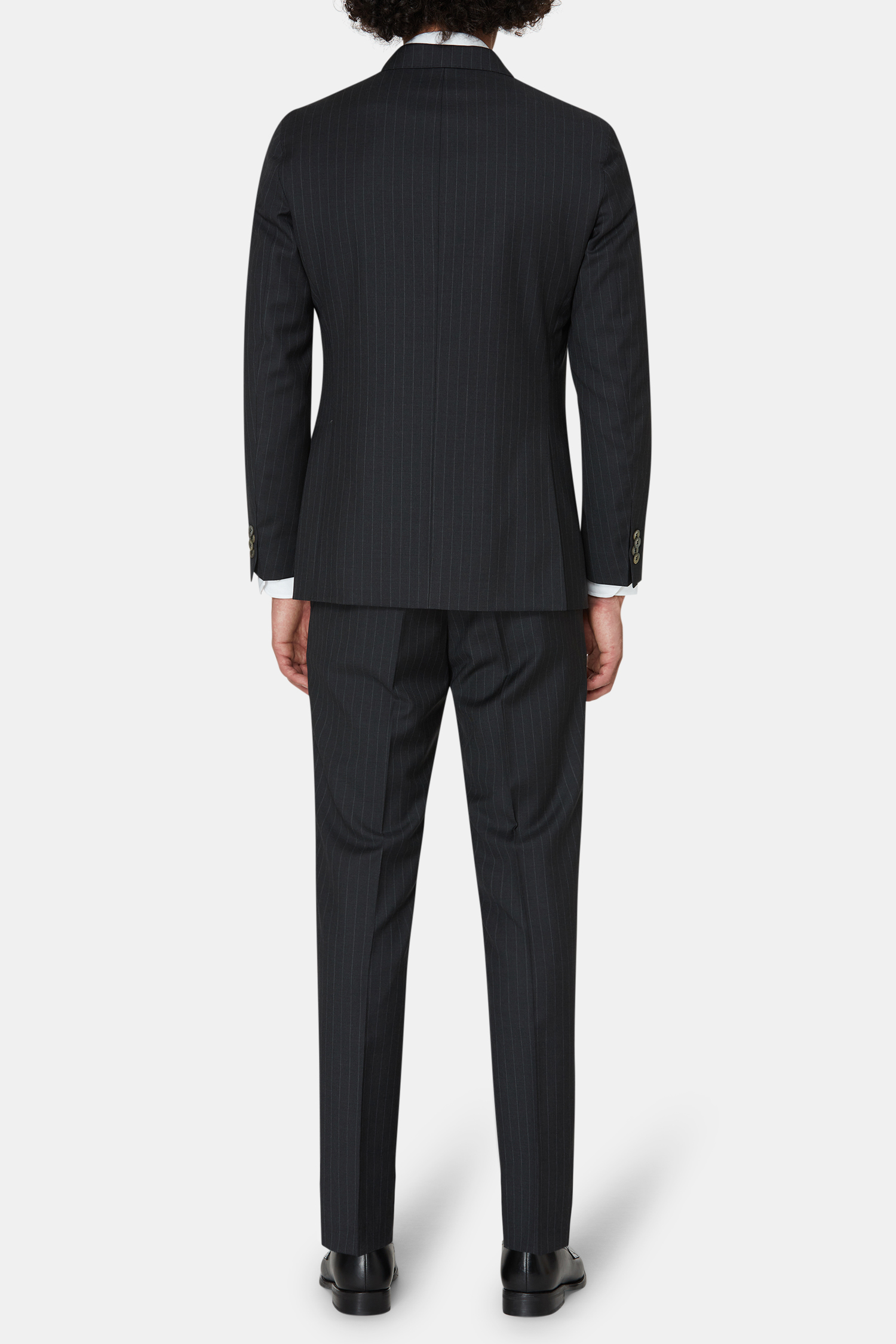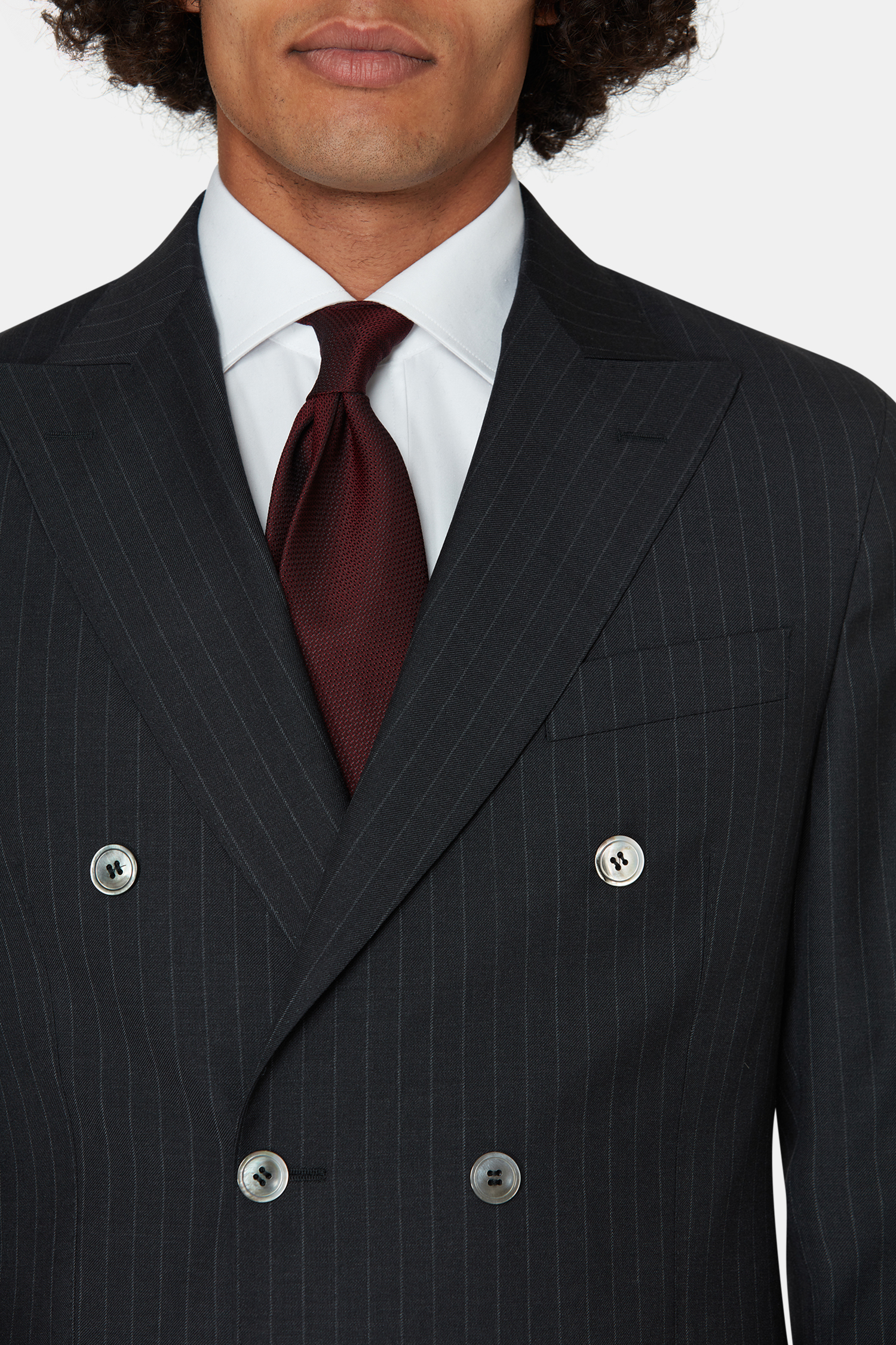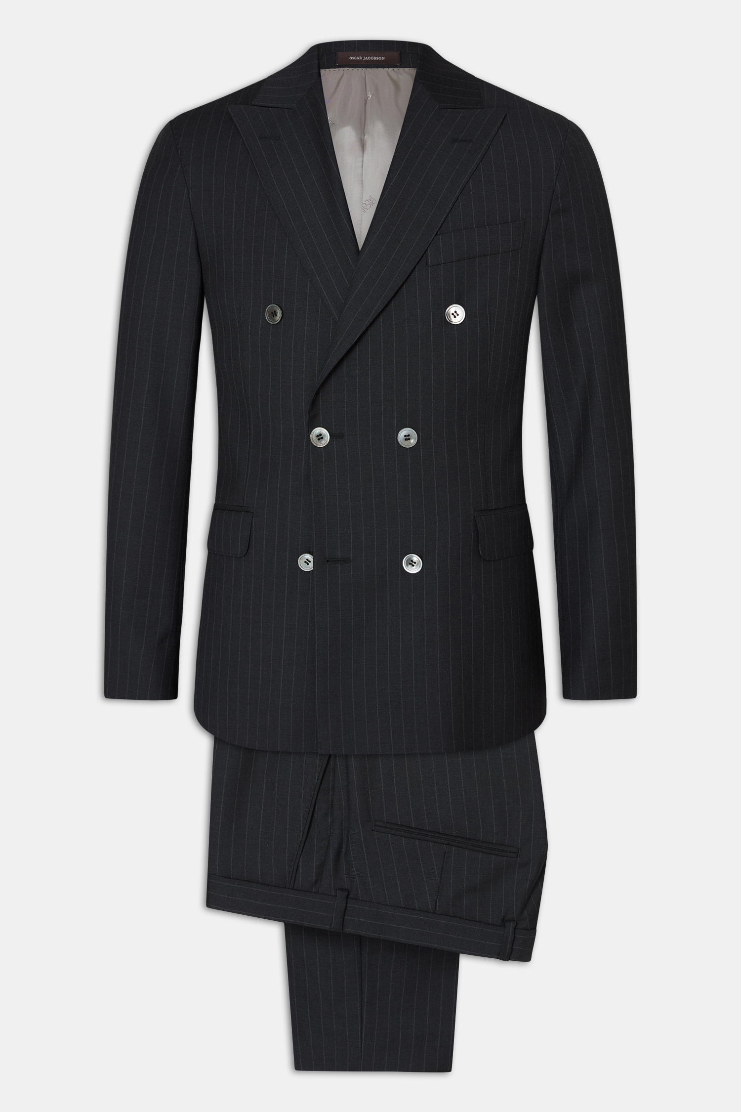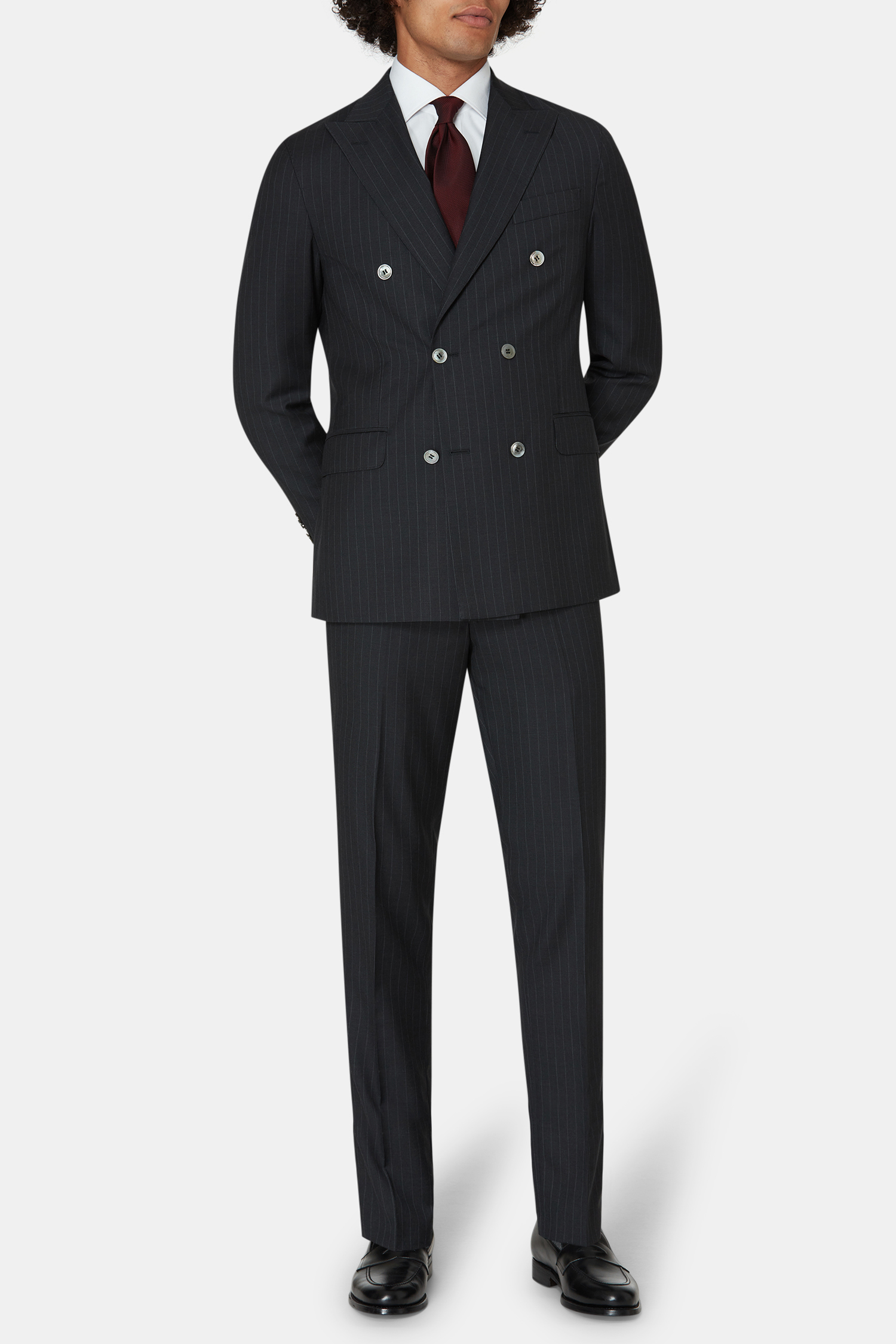Tidløst dobbeltradet jakkesæt lavet af 100% uld. Tilbyder både komfort og stil og er perfekt til enhver formel lejlighed.