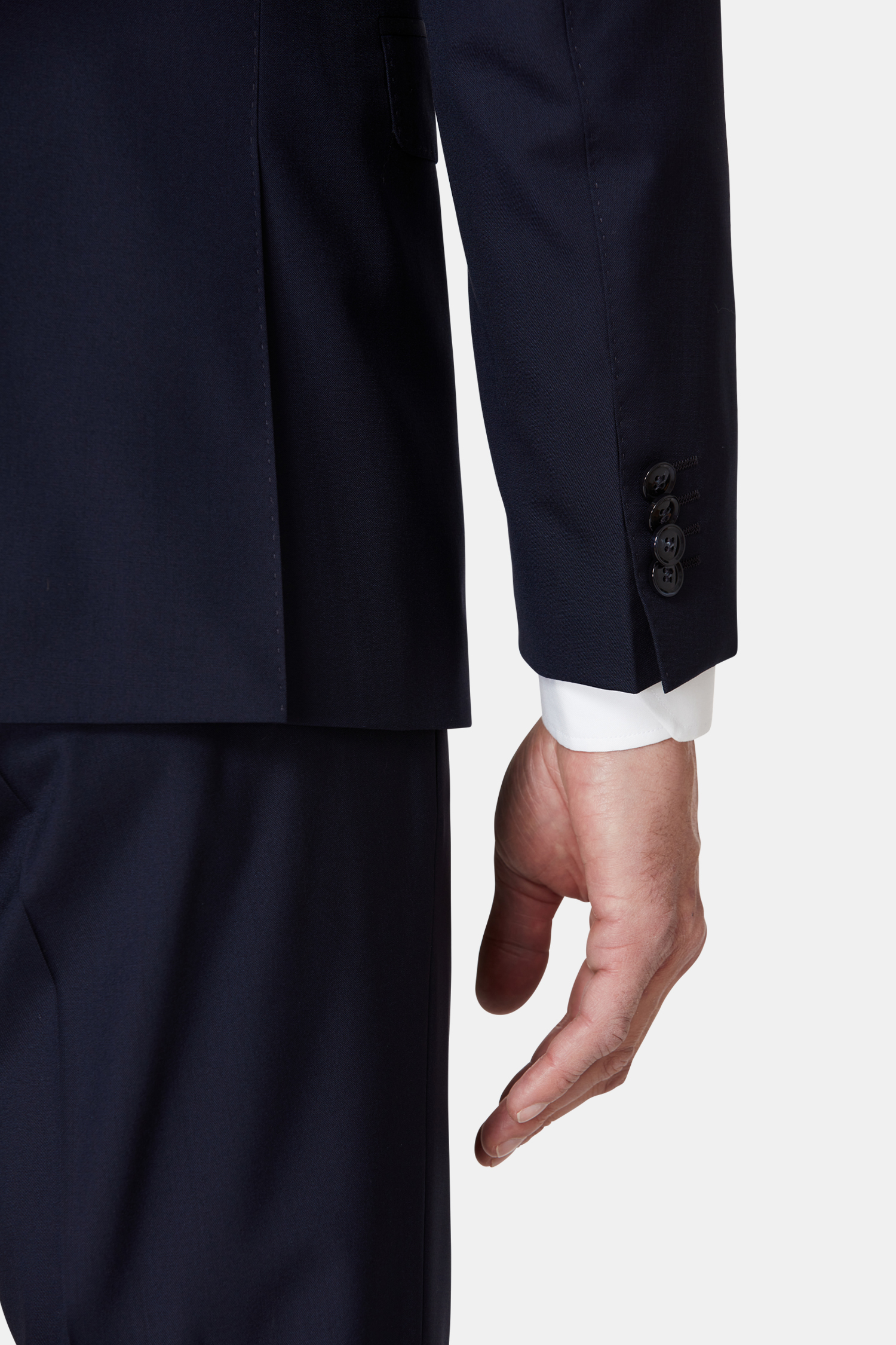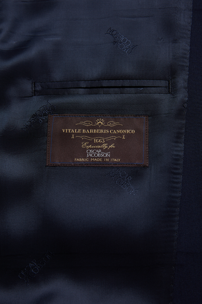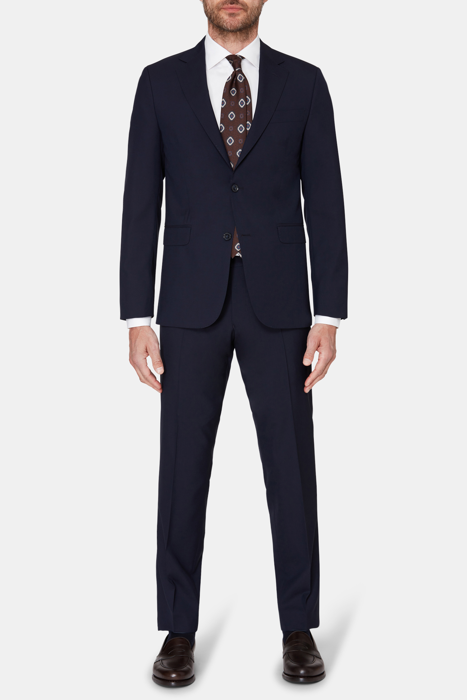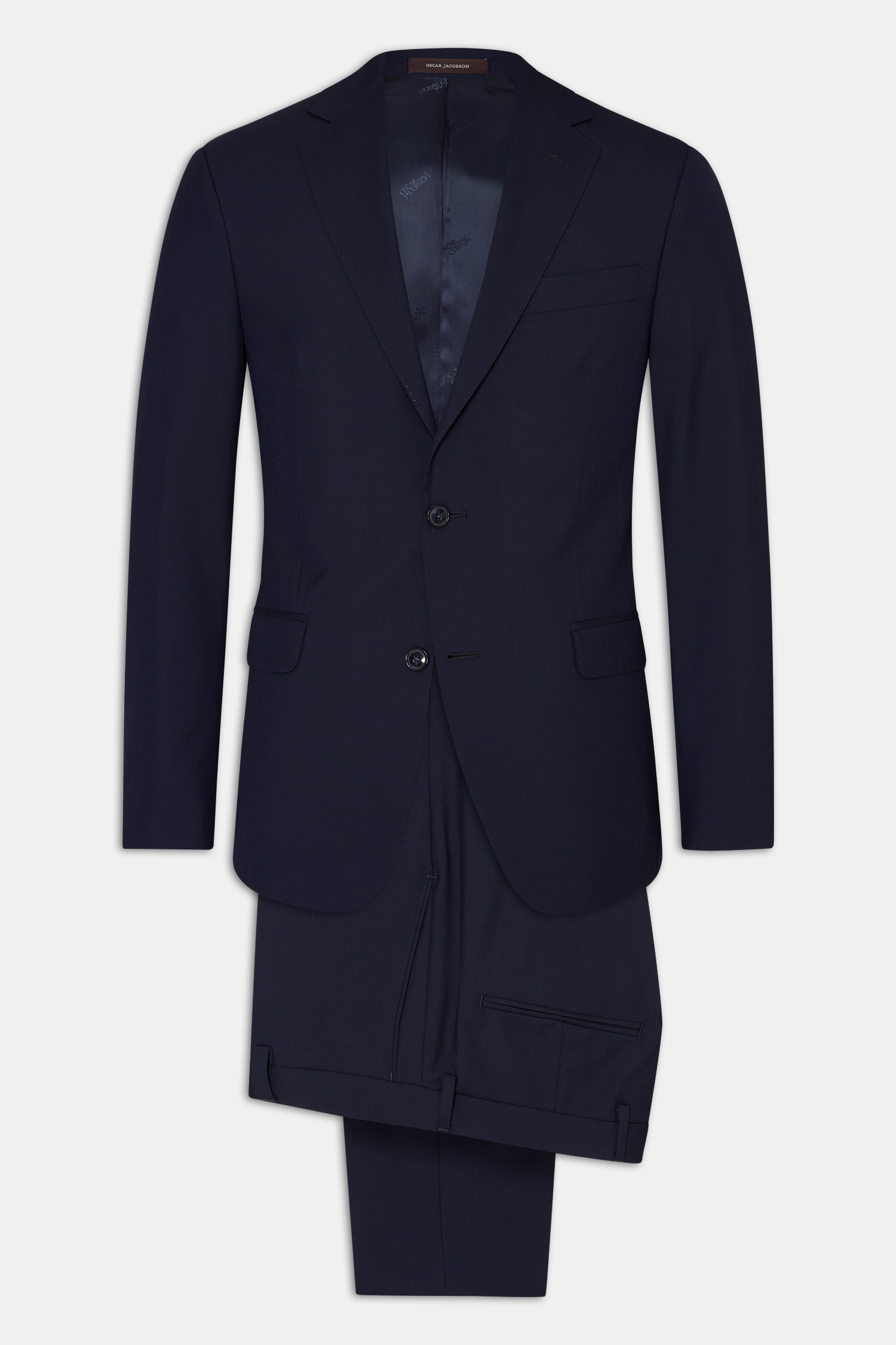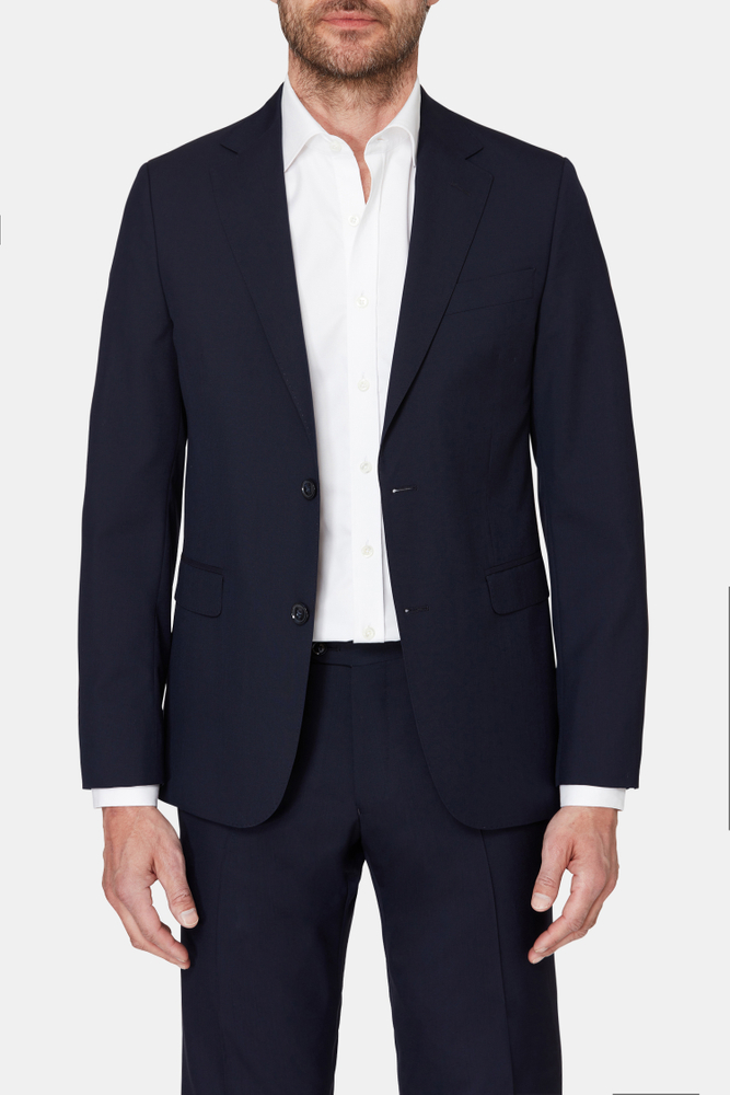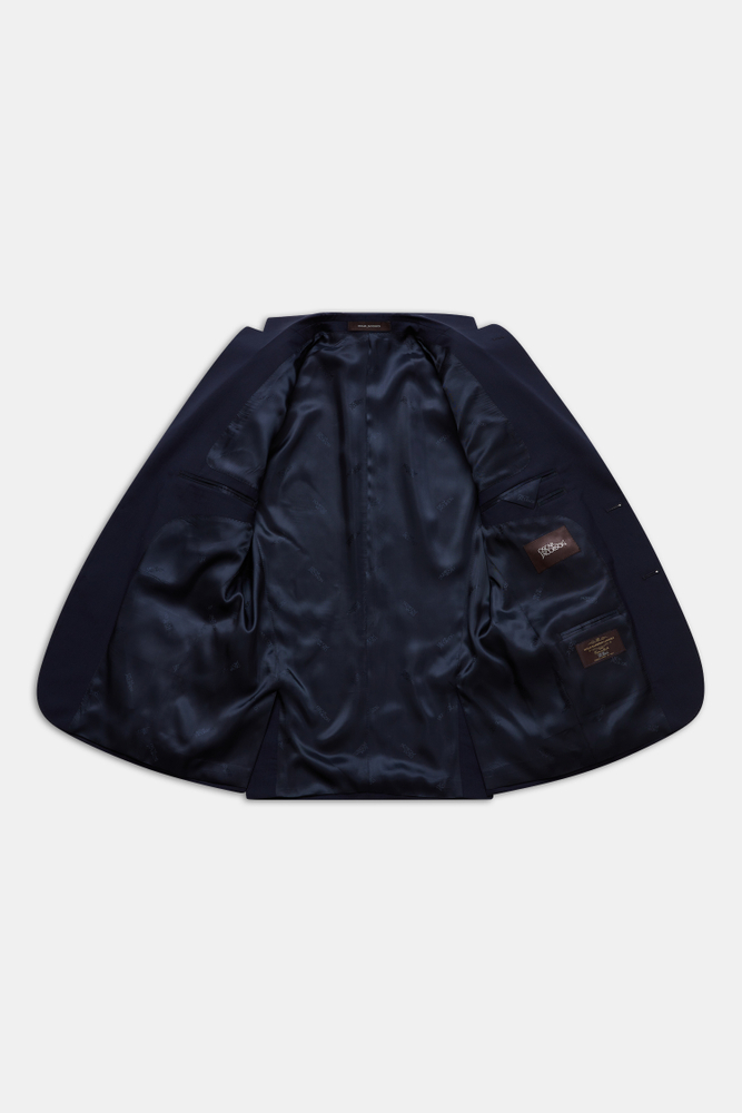 Klubtøj i mørkeblåt uldgarn med struktur fra det italienske væveri Marzotto. En blød konstruktion, hvor mellemlag og skulderopbygning er næsten ikke-eksisterende. Jakken er foret og har lommer med lommeklap. De tilhørende bukser har en klassisk, let tilspidset pasform og en normaltalje.