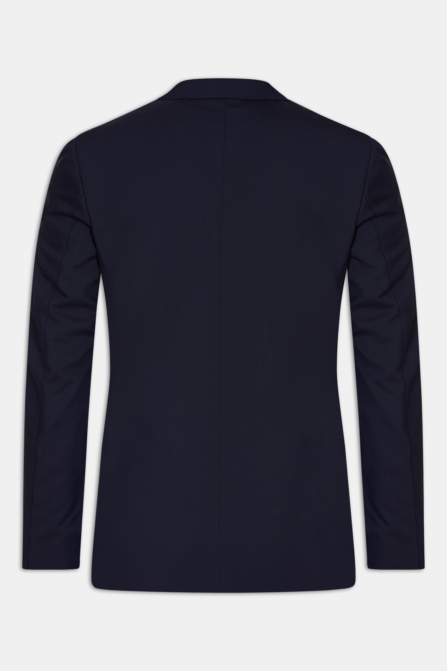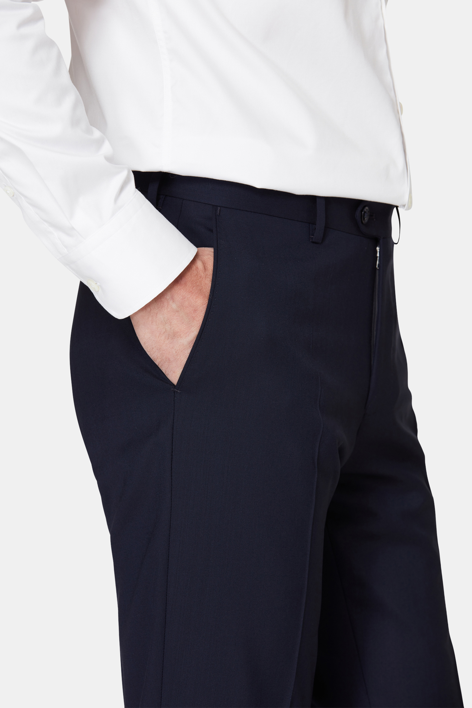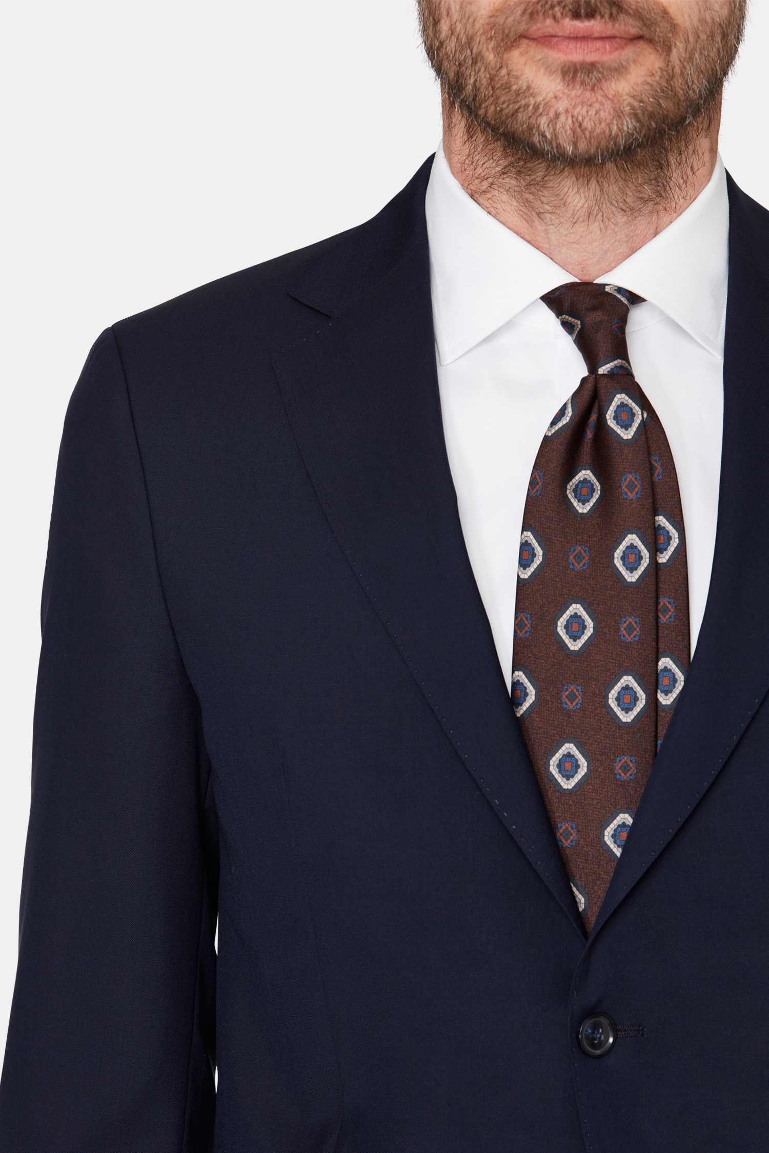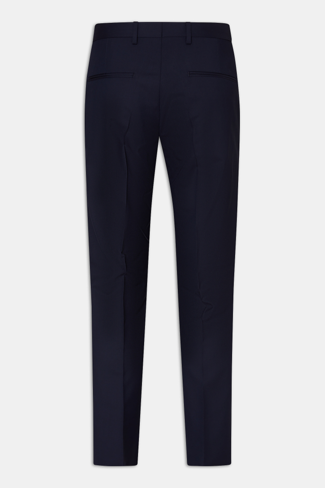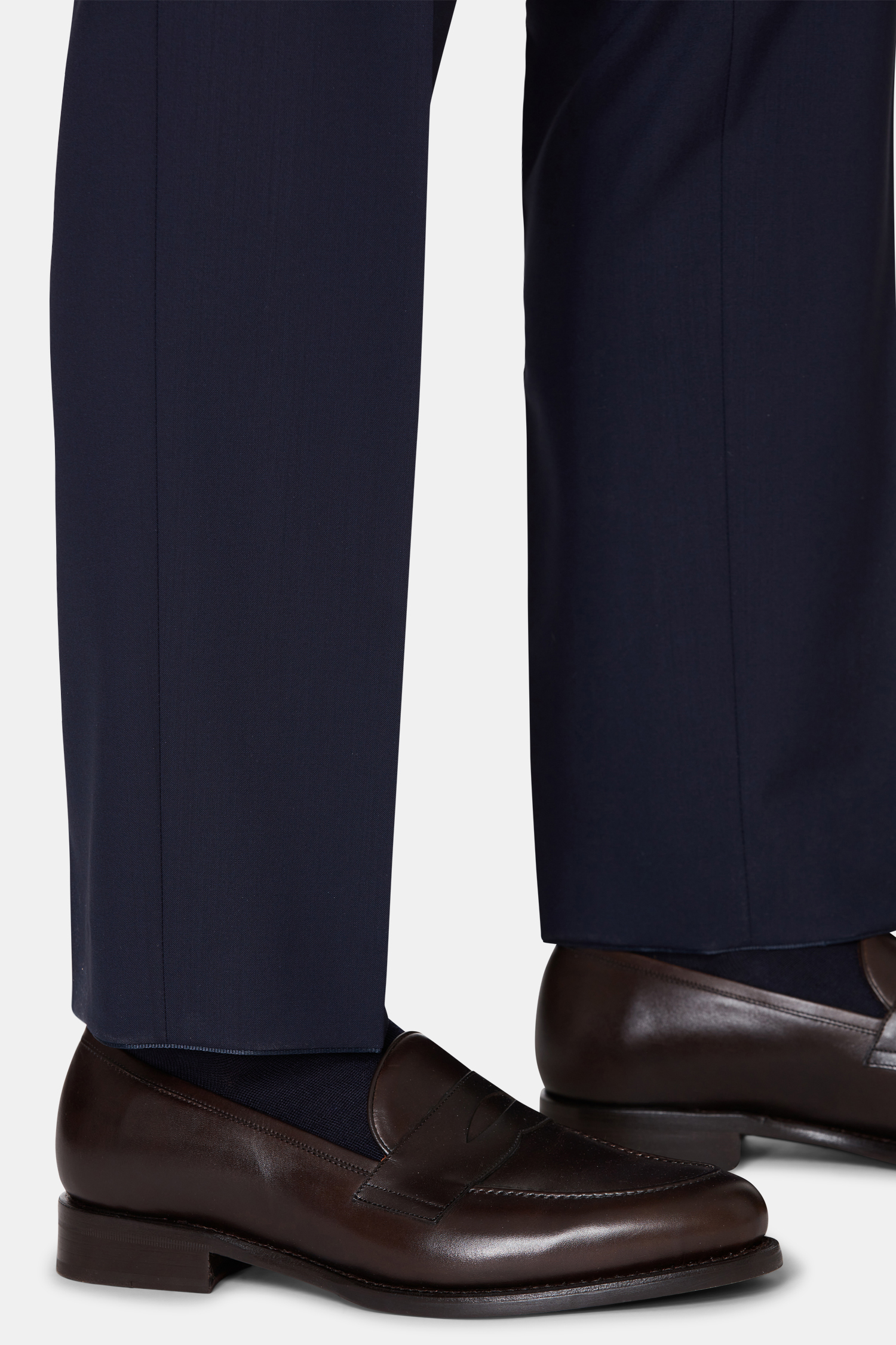 Klubtøj i mørkeblåt uldgarn med struktur fra det italienske væveri Marzotto. En blød konstruktion, hvor mellemlag og skulderopbygning er næsten ikke-eksisterende. Jakken er foret og har lommer med lommeklap. De tilhørende bukser har en klassisk, let tilspidset pasform og en normaltalje.