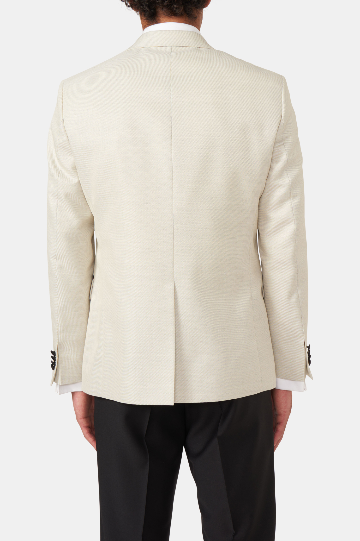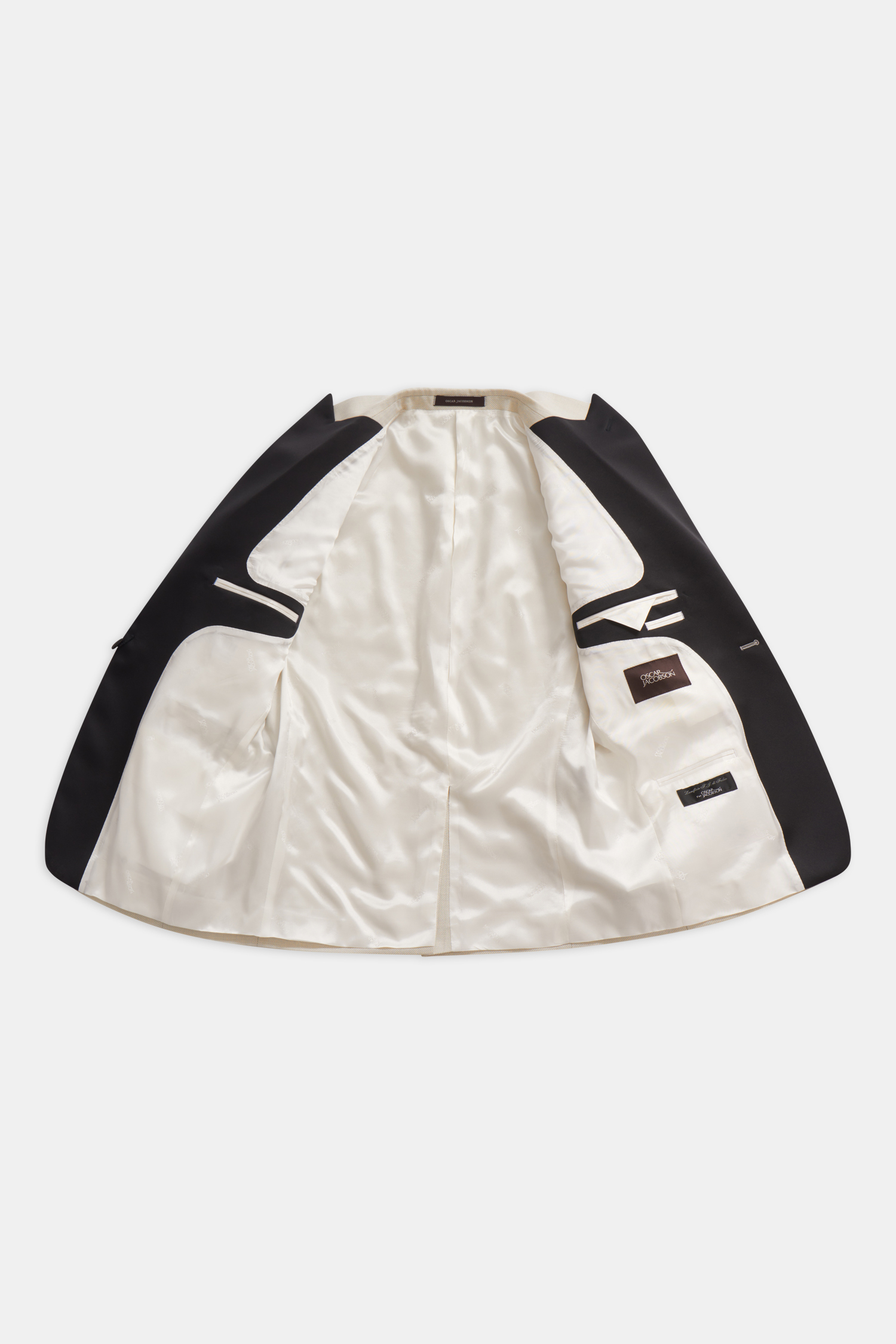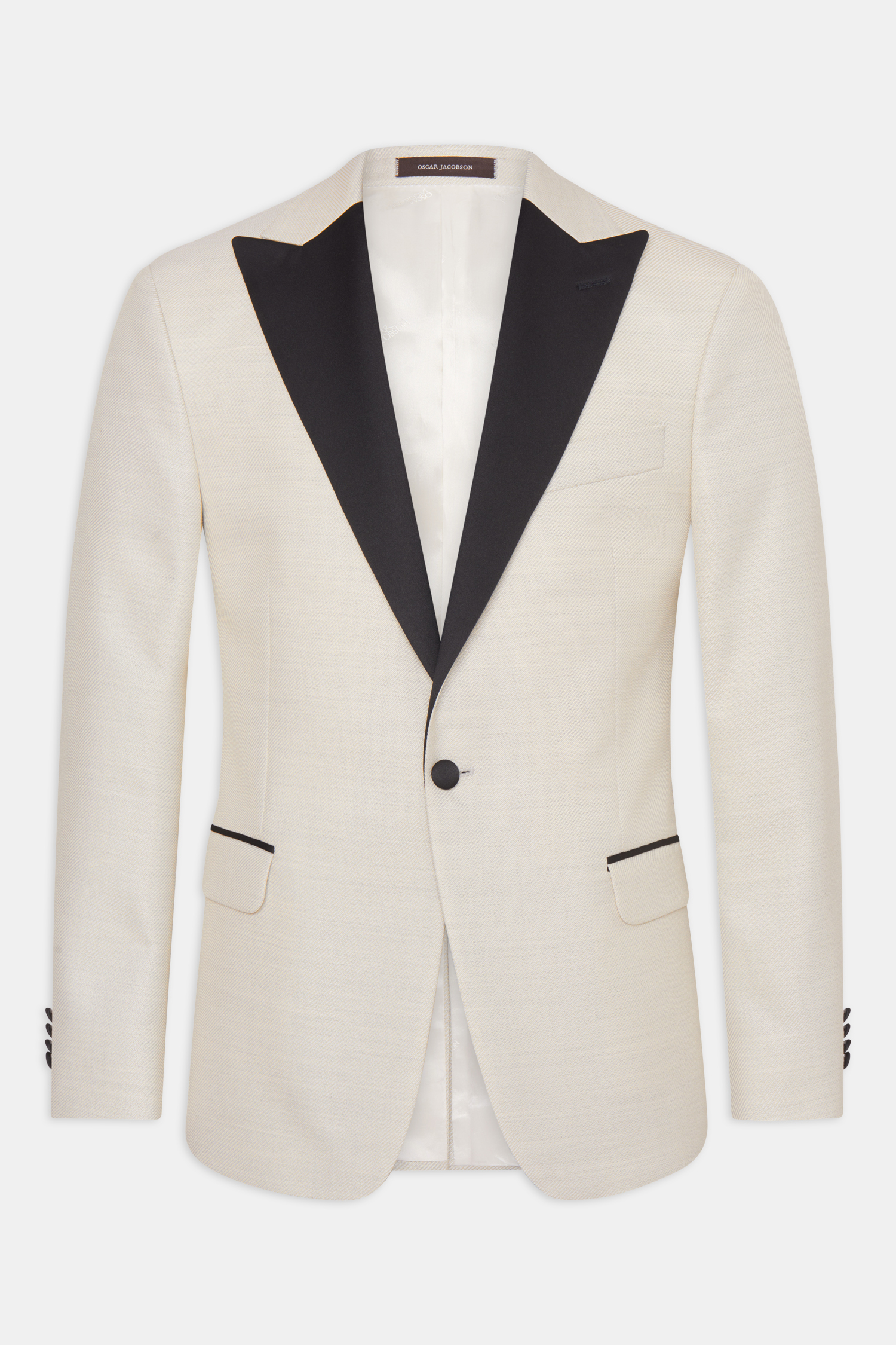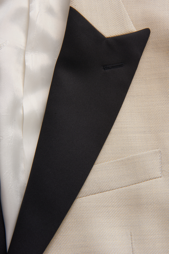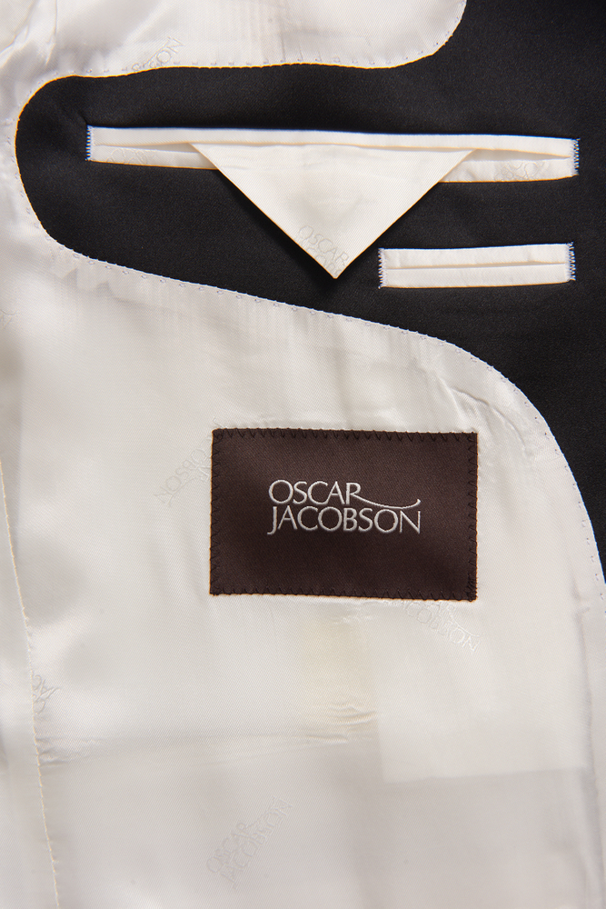 Fuldt foret smoking med spidse silke revers og betrukne knapper. En pasform med et mere traditionelt snit og klassisk pasform. Her i et sort blankt uldstof med svag tone i tone slangeskindstekstur.