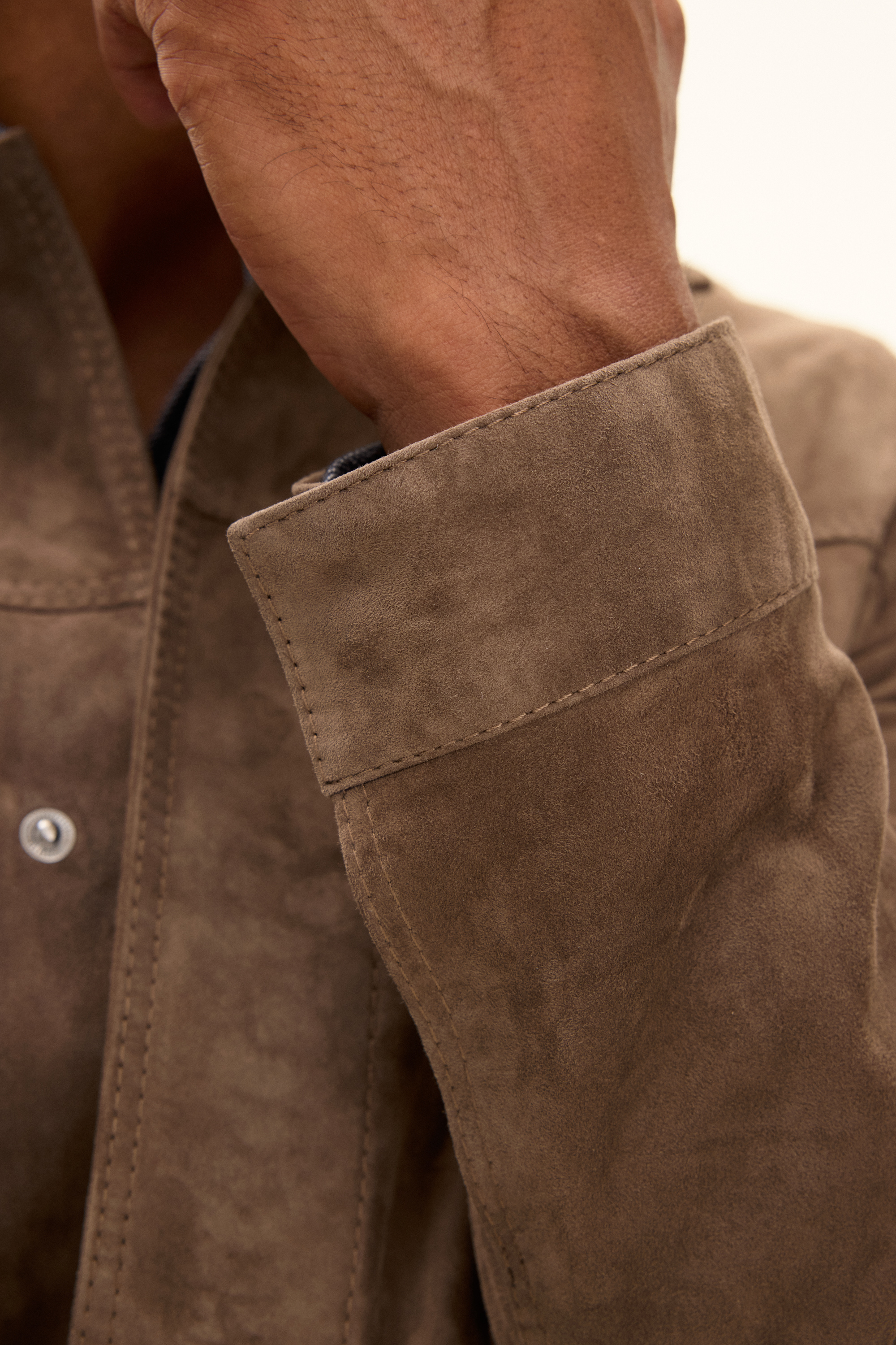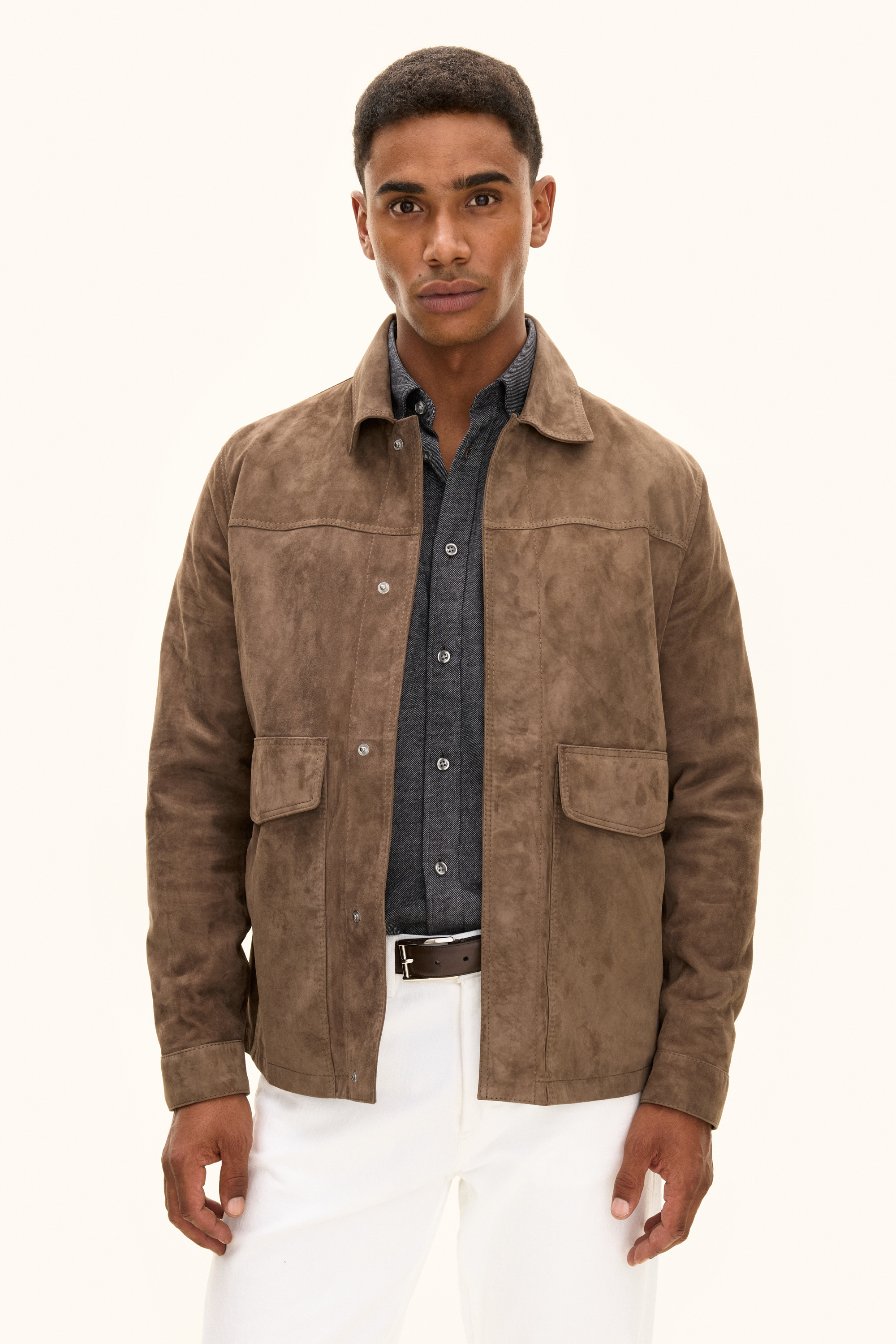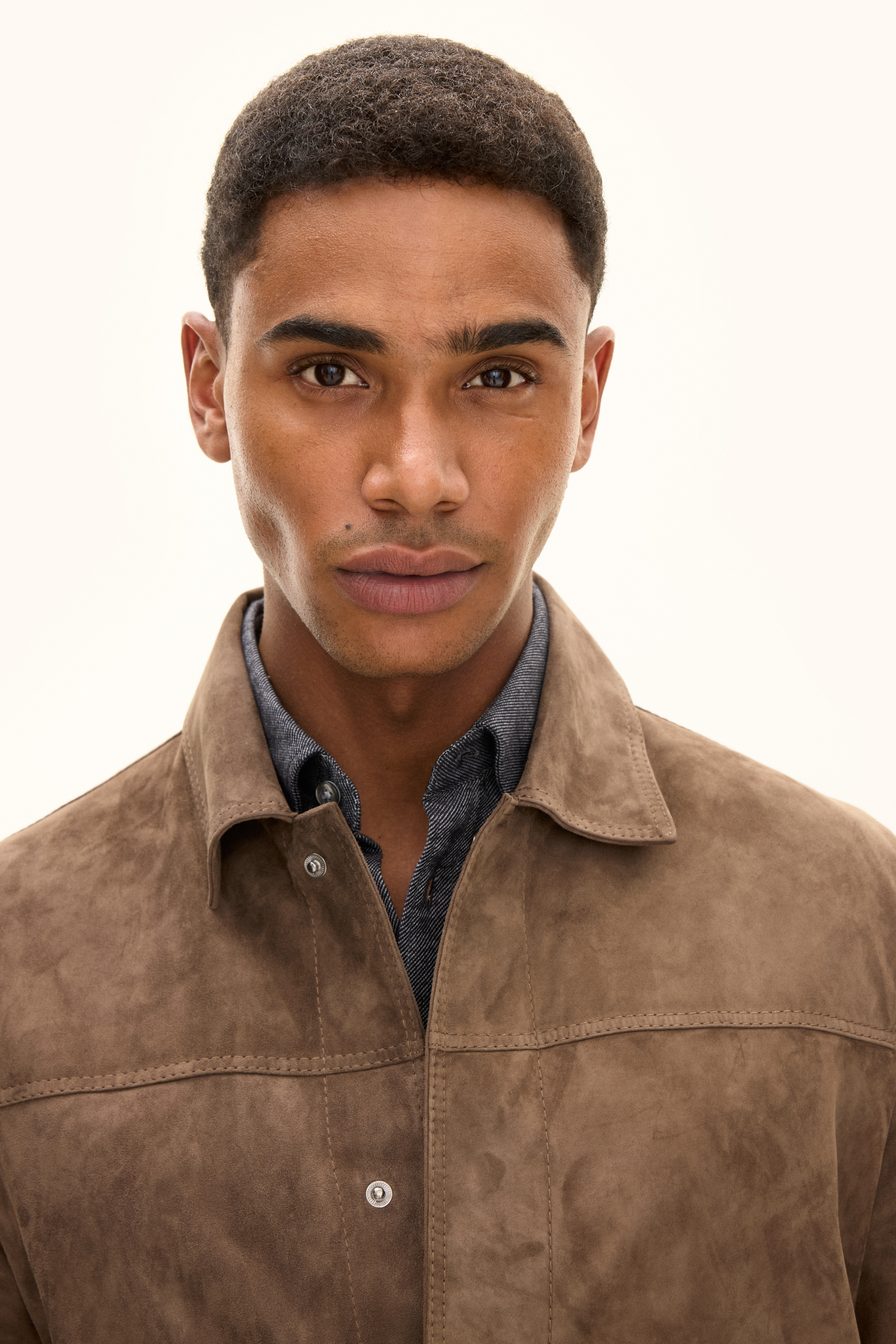 Denne overshirt i regular pasform er en raffineret hybrid mellem en jakke og en skjorte – fremstillet af 100% ægte læder. Materialet giver både struktur og fleksibilitet, hvilket gør den ideel til overgangssæsoner. Brug den over en T-shirt for et afslappet look, eller style den med en skjorte og skræddersyede bukser for et mere elegant udtryk.