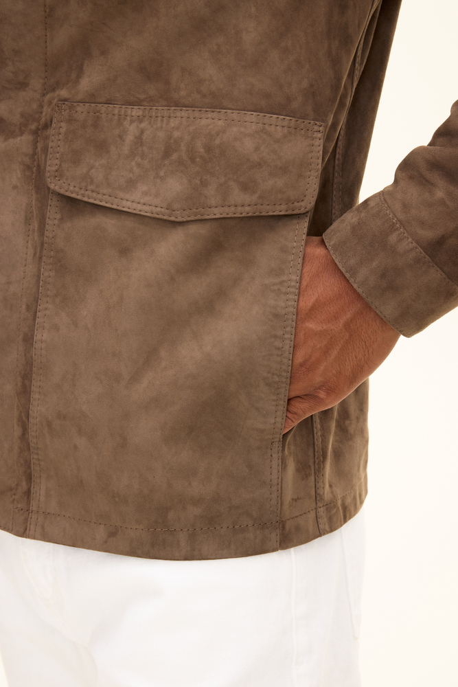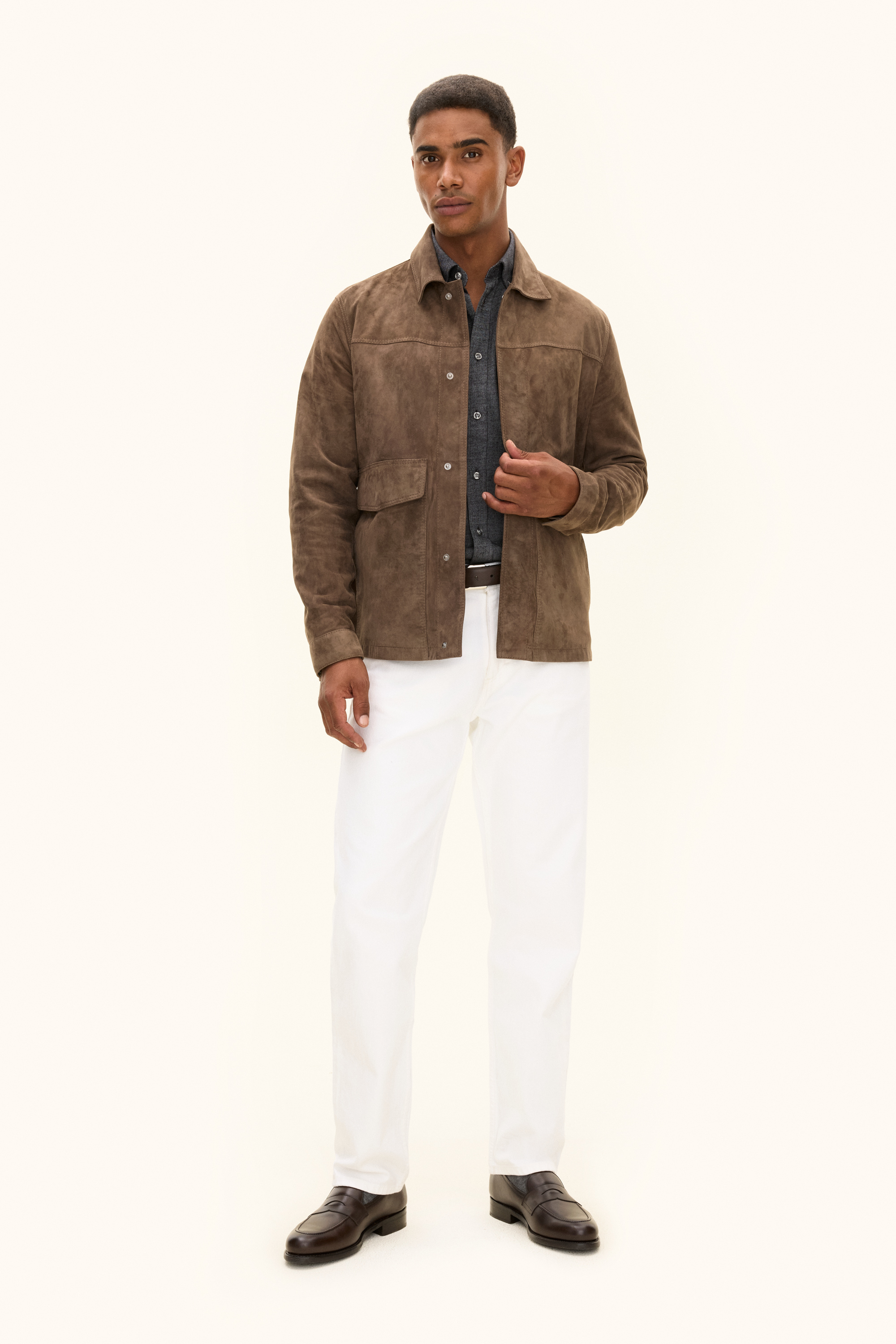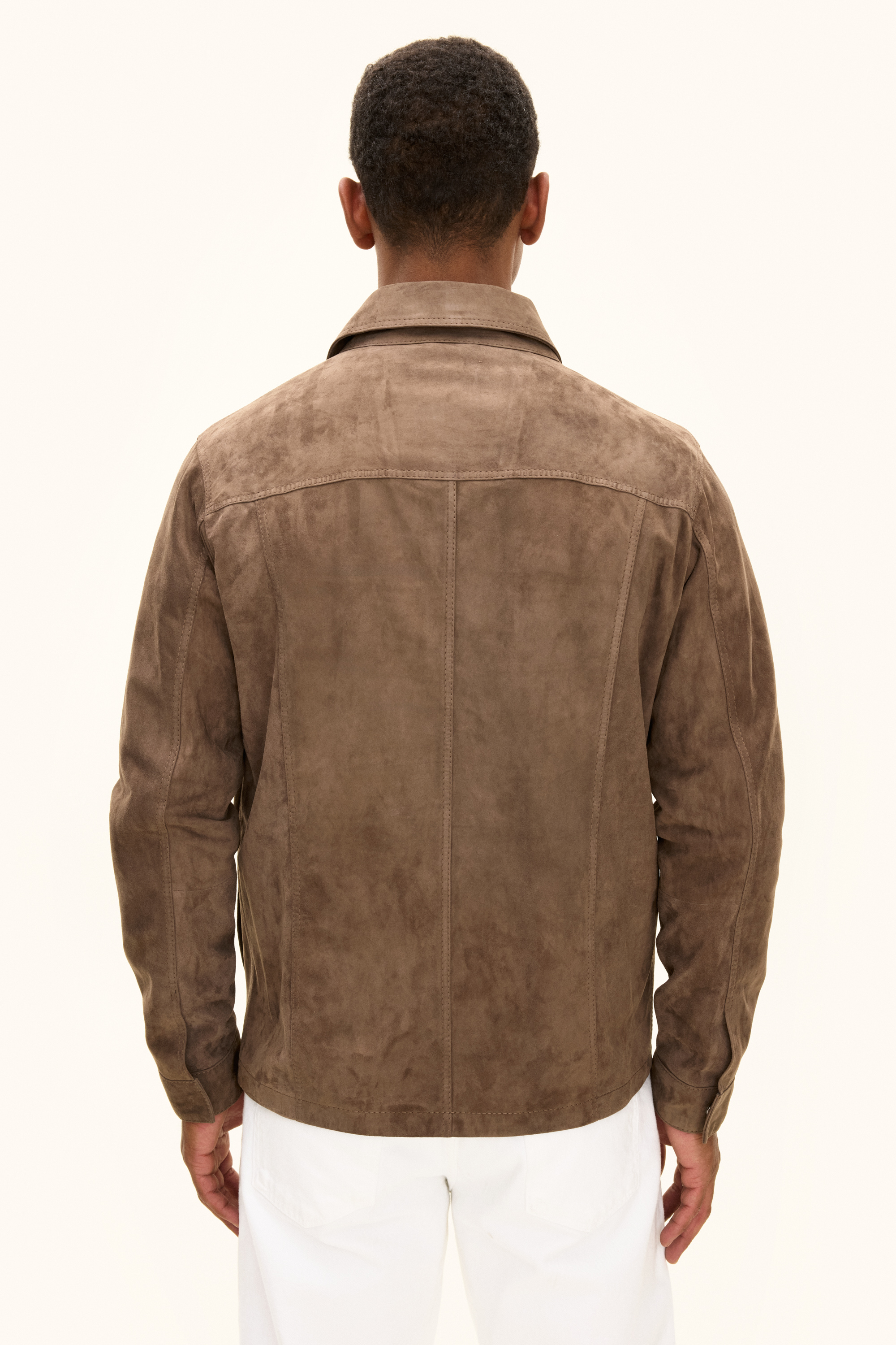Denne overshirt i regular pasform er en raffineret hybrid mellem en jakke og en skjorte – fremstillet af 100% ægte læder. Materialet giver både struktur og fleksibilitet, hvilket gør den ideel til overgangssæsoner. Brug den over en T-shirt for et afslappet look, eller style den med en skjorte og skræddersyede bukser for et mere elegant udtryk.