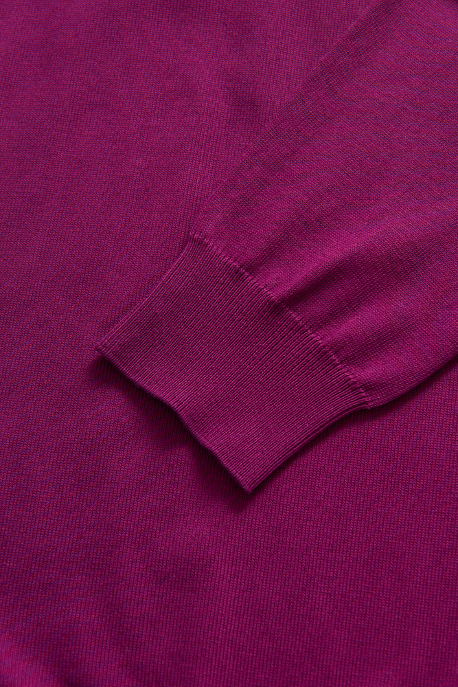 Strikket trøje med rund hals og ribstrikket krave samt kanter. Fremstillet i et tyndt bomuldsstof perfekt til sommer.