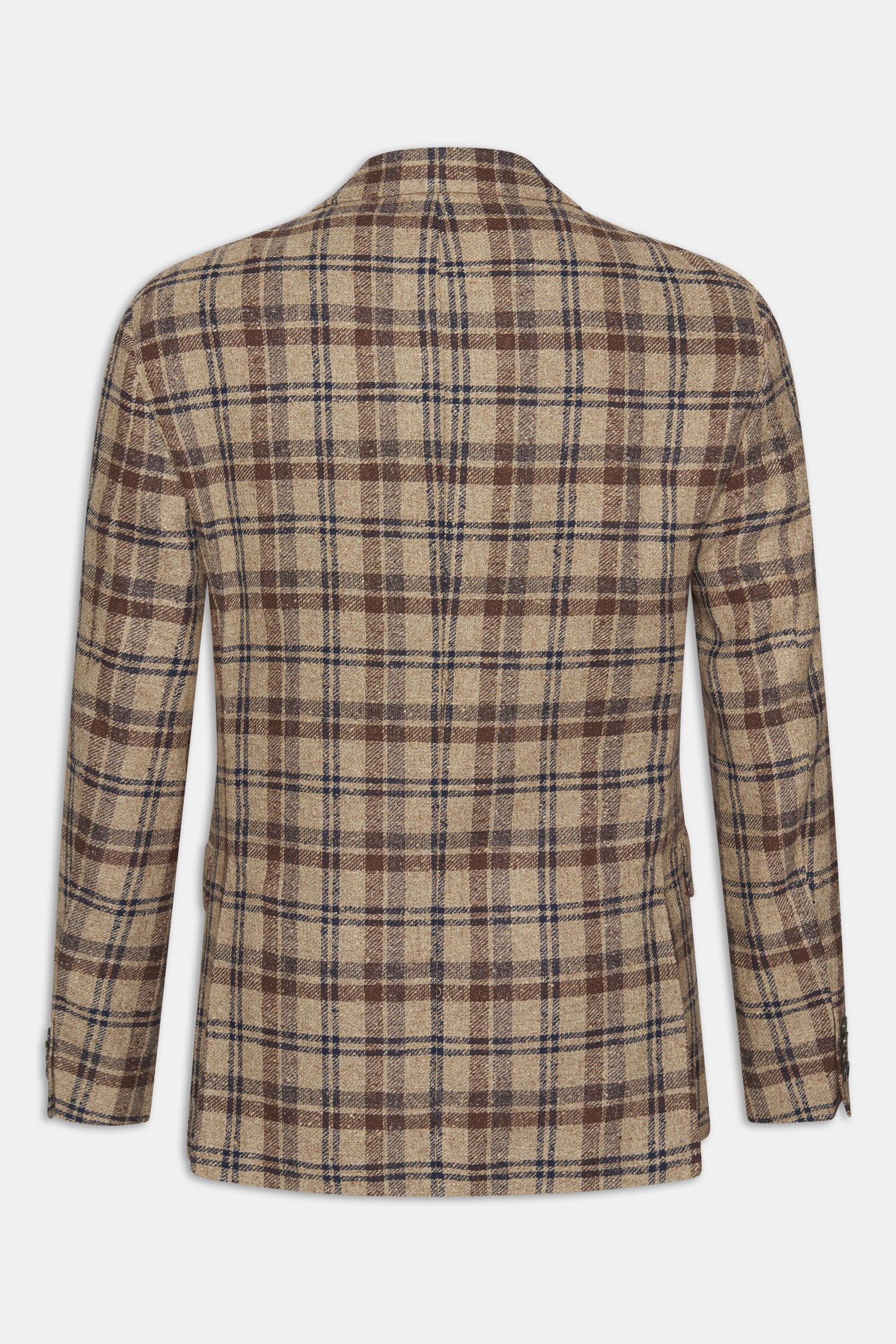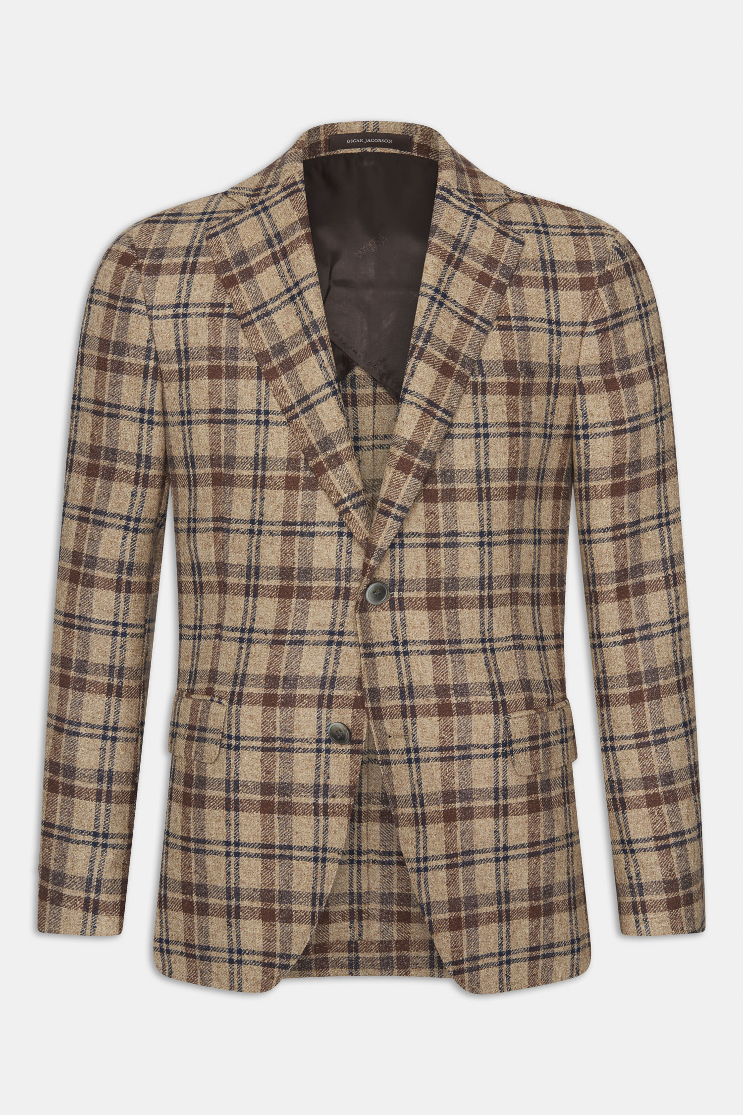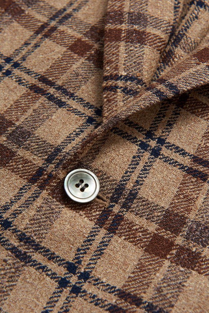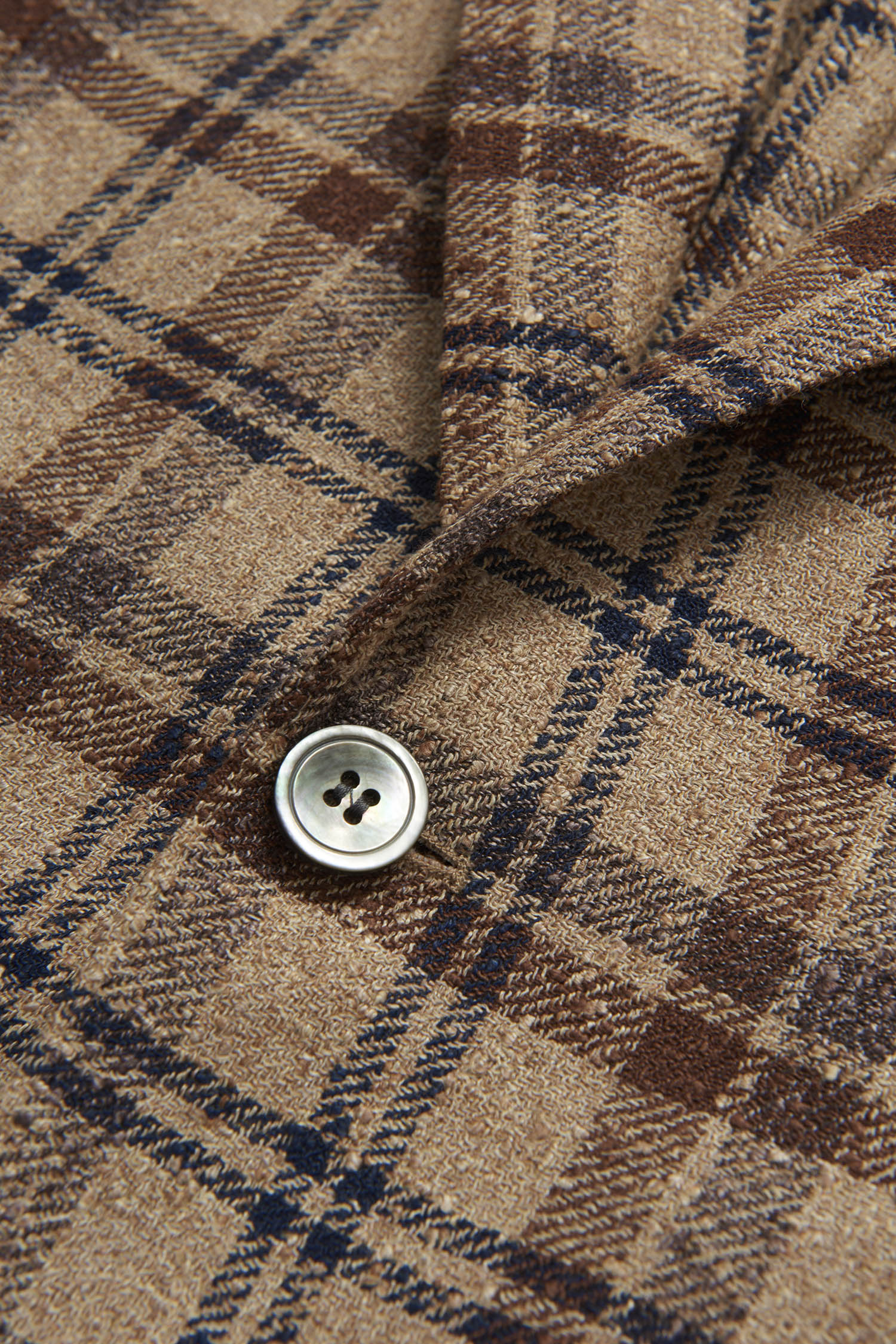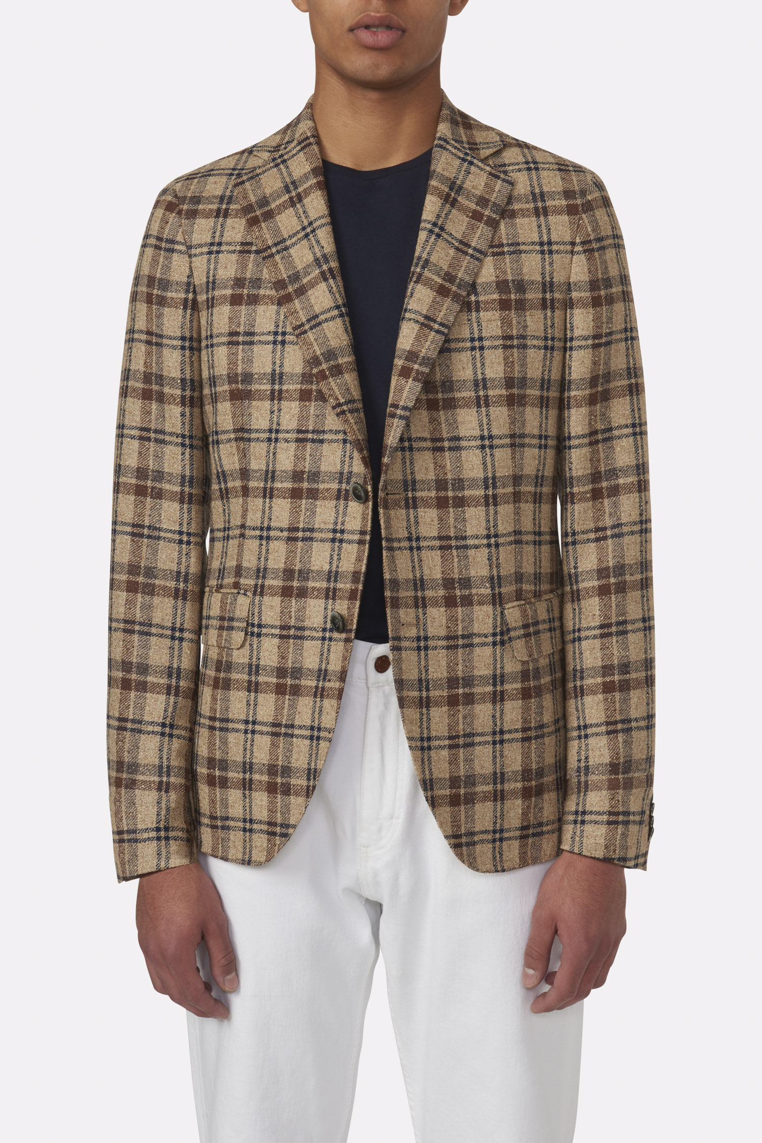 Enkeltradet blazer i regular fit med halvforet inderside og et blødt konstrueret skulderparti, der bidrager til øget komfort og et mere afslappet udtryk. metervaren er en taktil hørblanding med en markante tern.