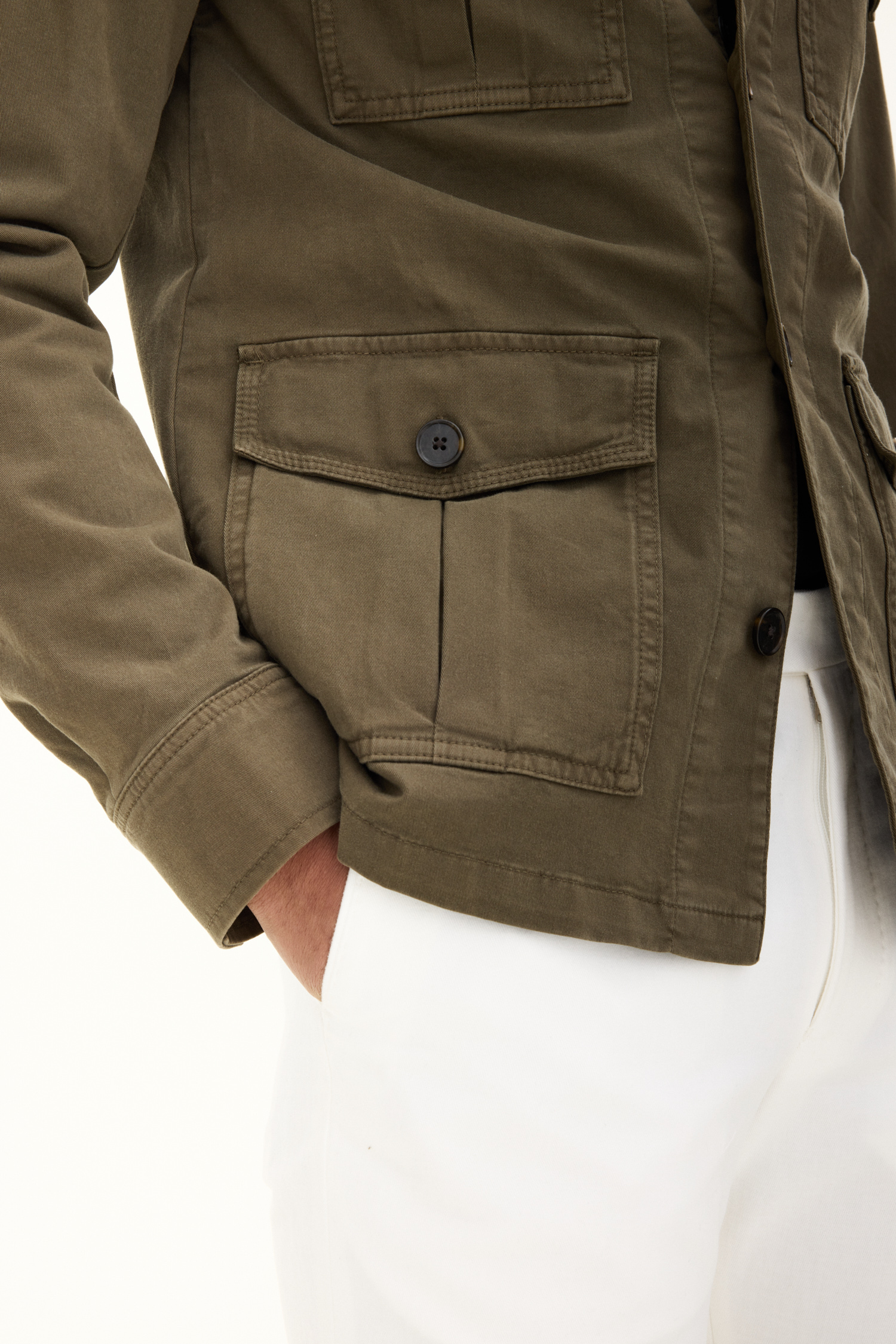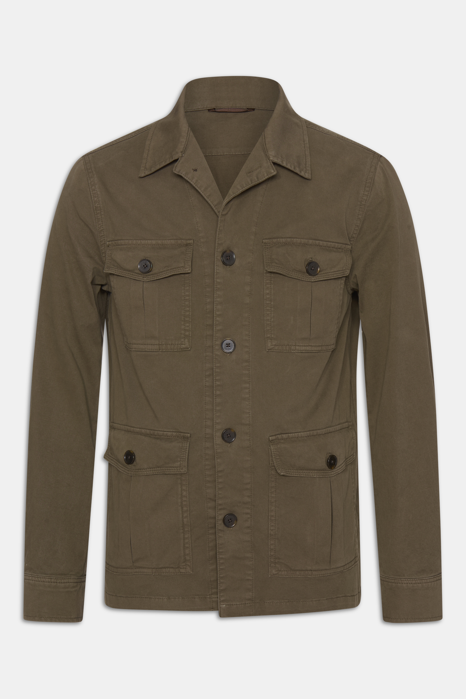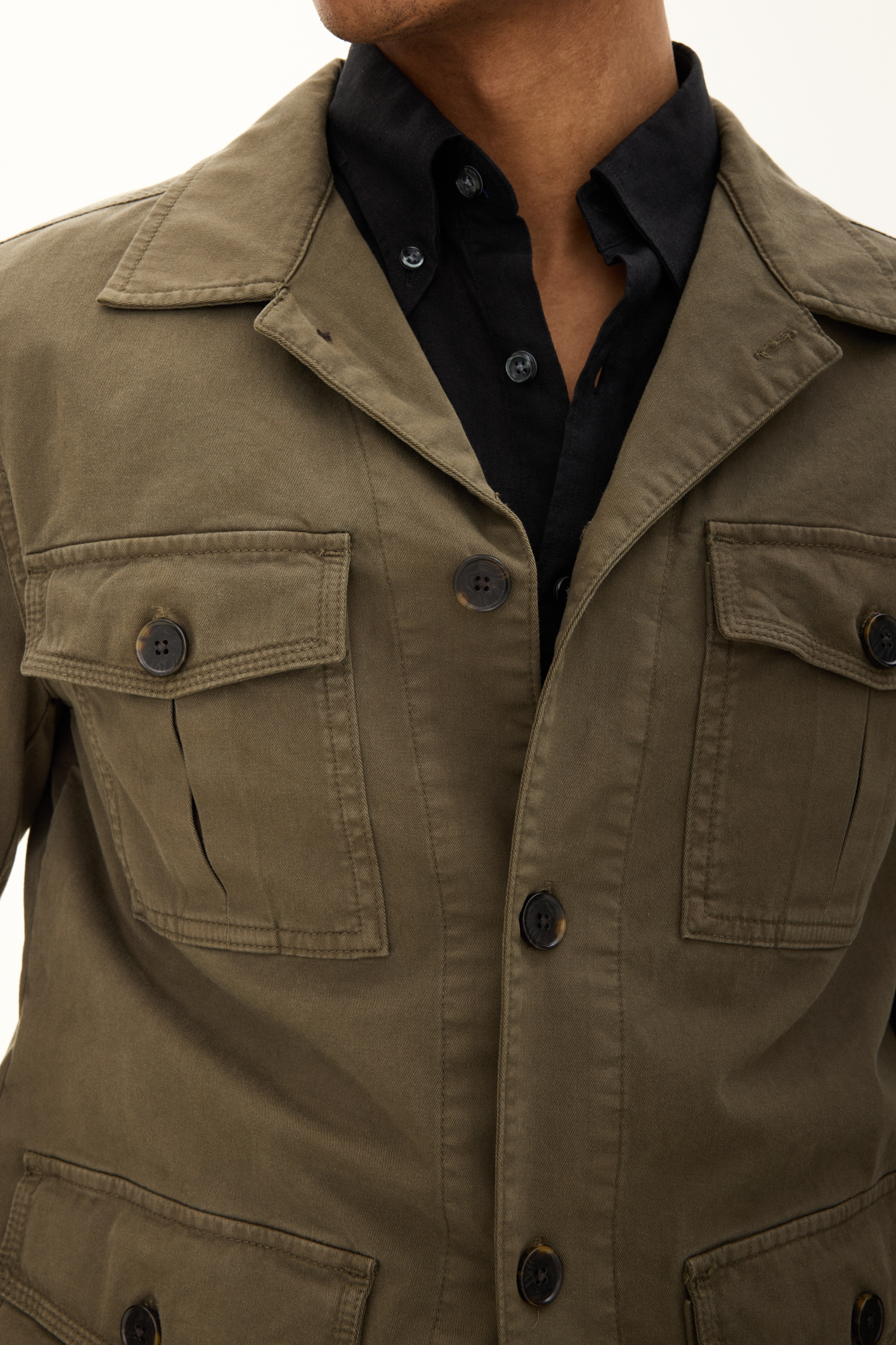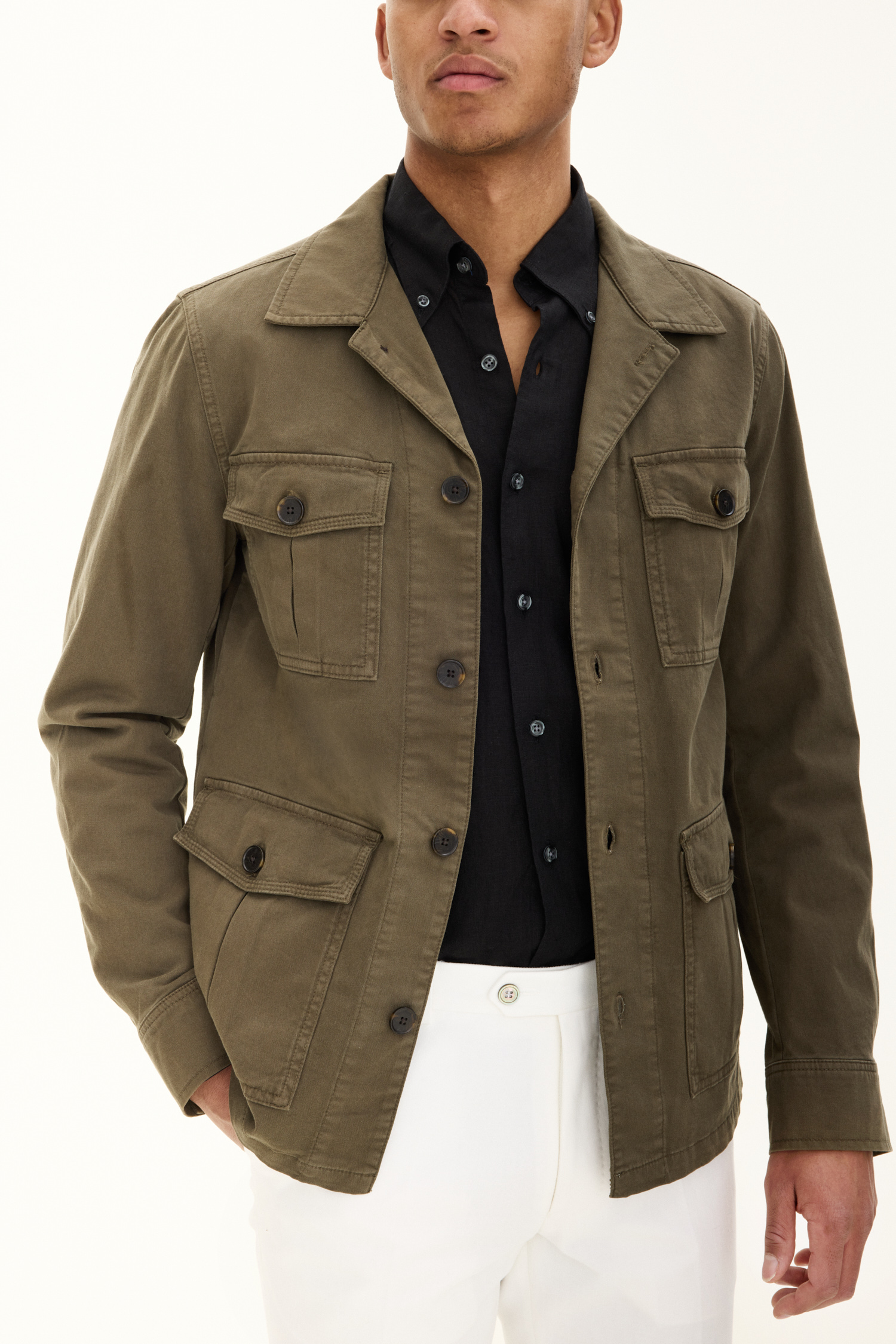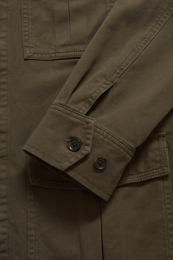 Uforet skjortejakke i safaristil med lige pasform. Forsynet med dobbelt udvendige talje- og brystlommer. metervaren er lavet i en robust vasket bomuldskvalitet med et par procent elastan som giver ekstra komfort.
