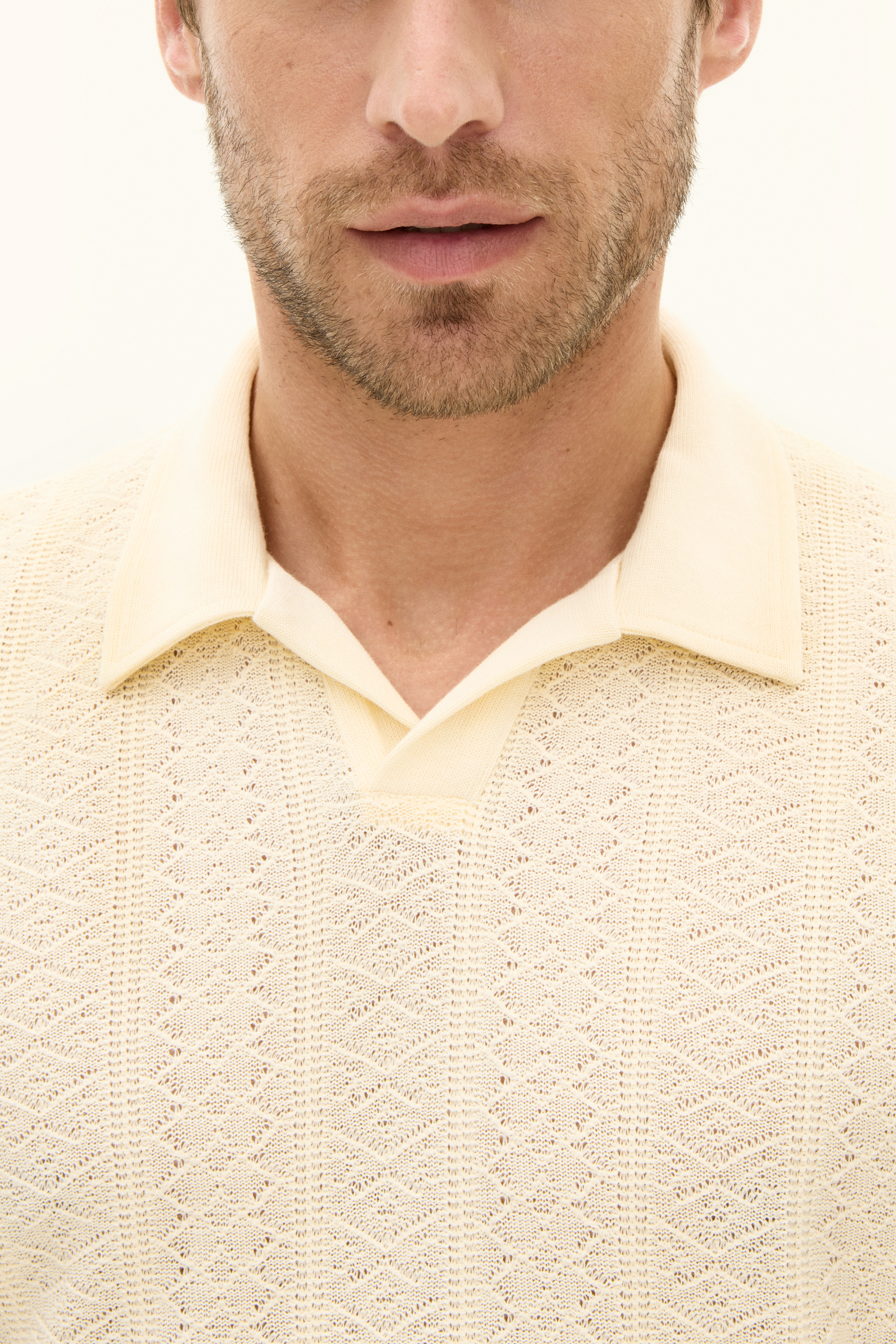 En kortærmet polo i bomuldsjersey med en diskret struktur foran. Det er en anvendelig og komfortabel poloskjorte, der giver et behageligt, men velklædt look – oplagt til varme dage.