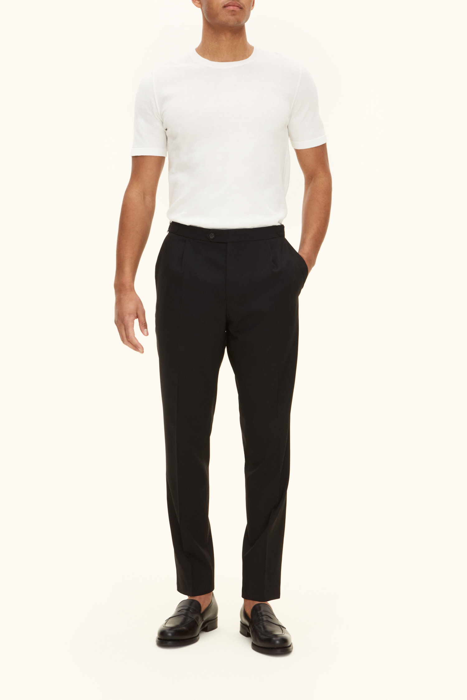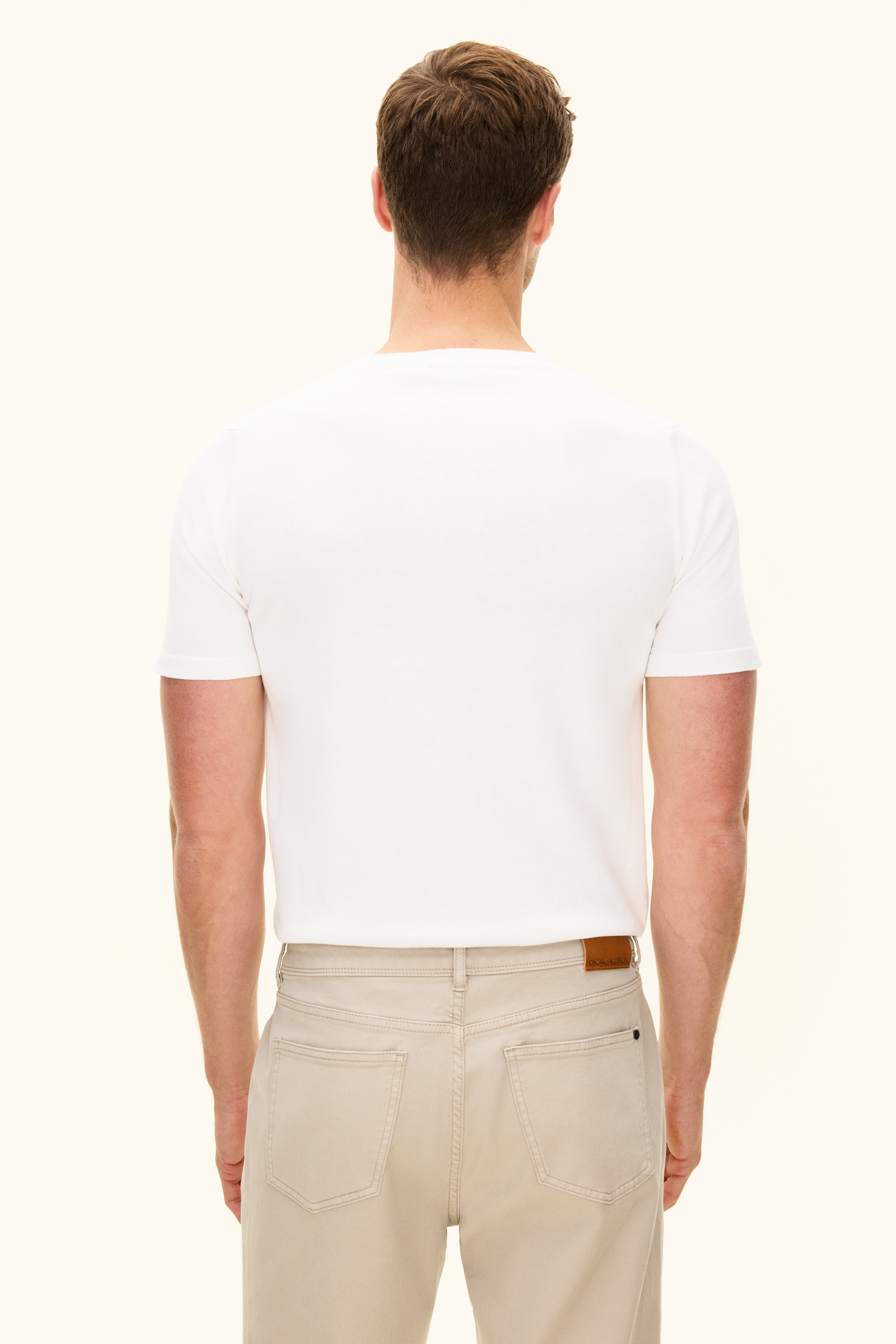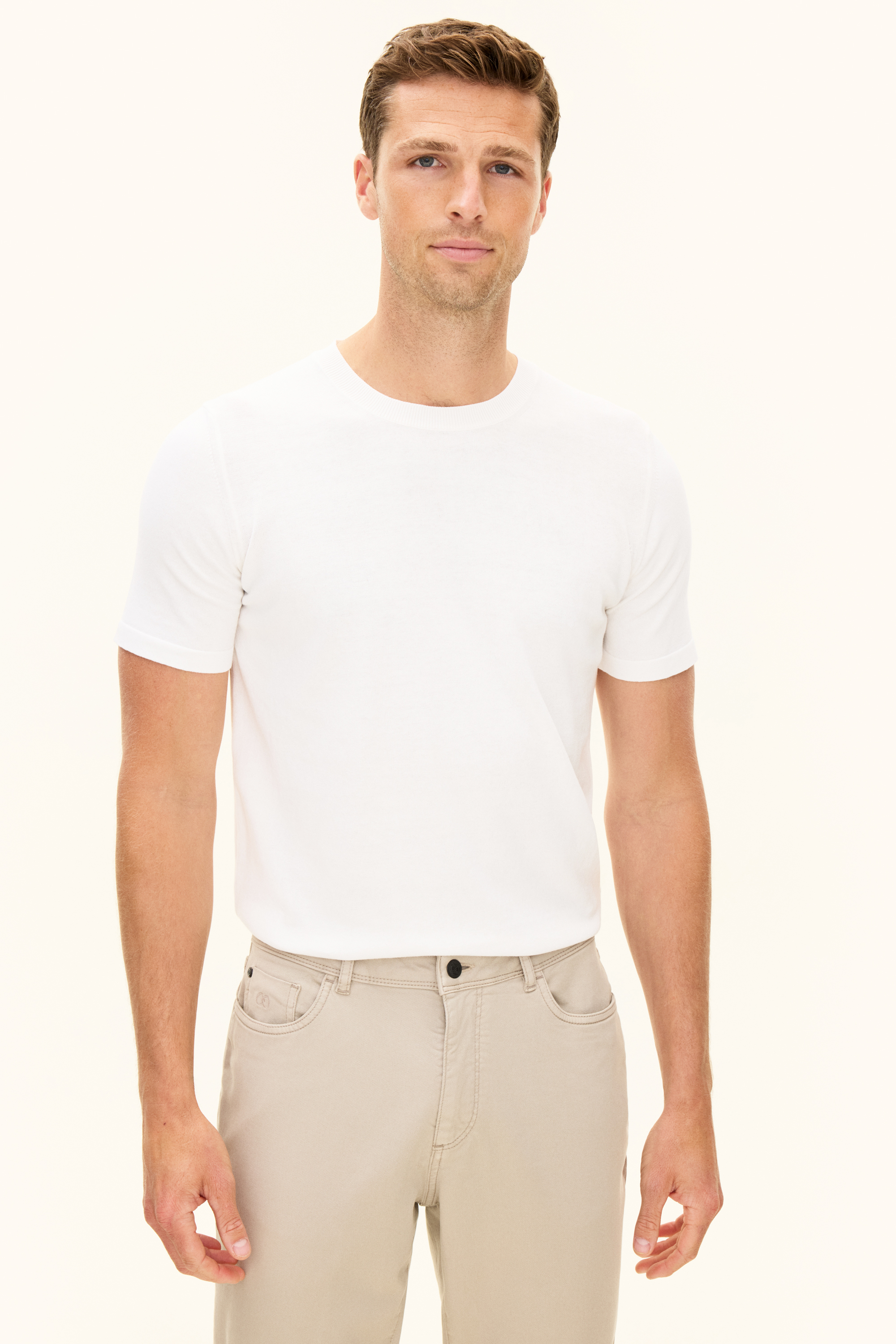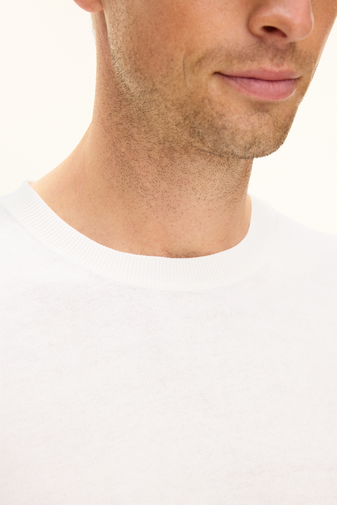 Vores Brian rundhals T-shirt er en slim fit lavet af 100% bomuld. Den har en rundhals design og har et ensfarvet strikket mønster.