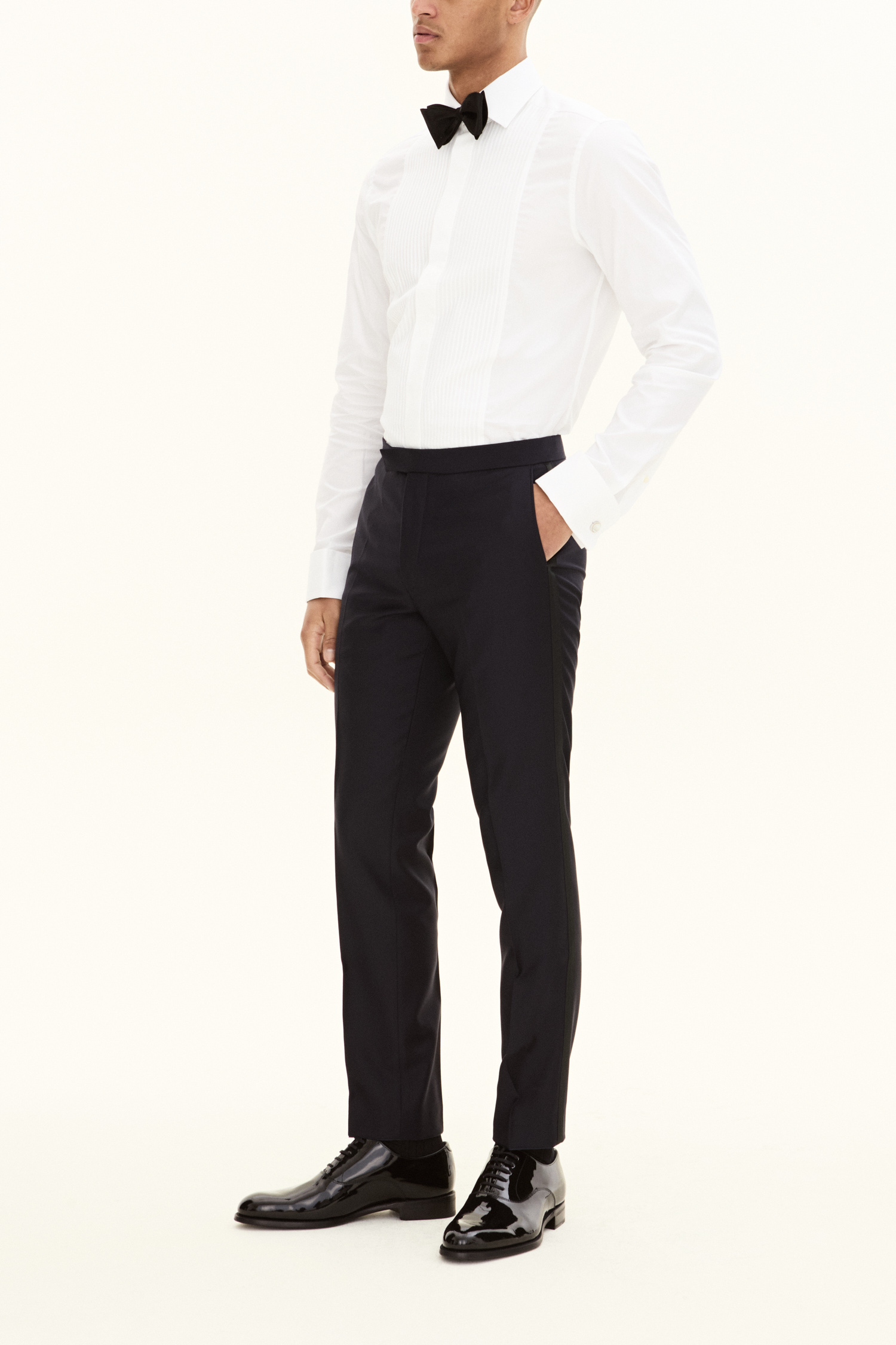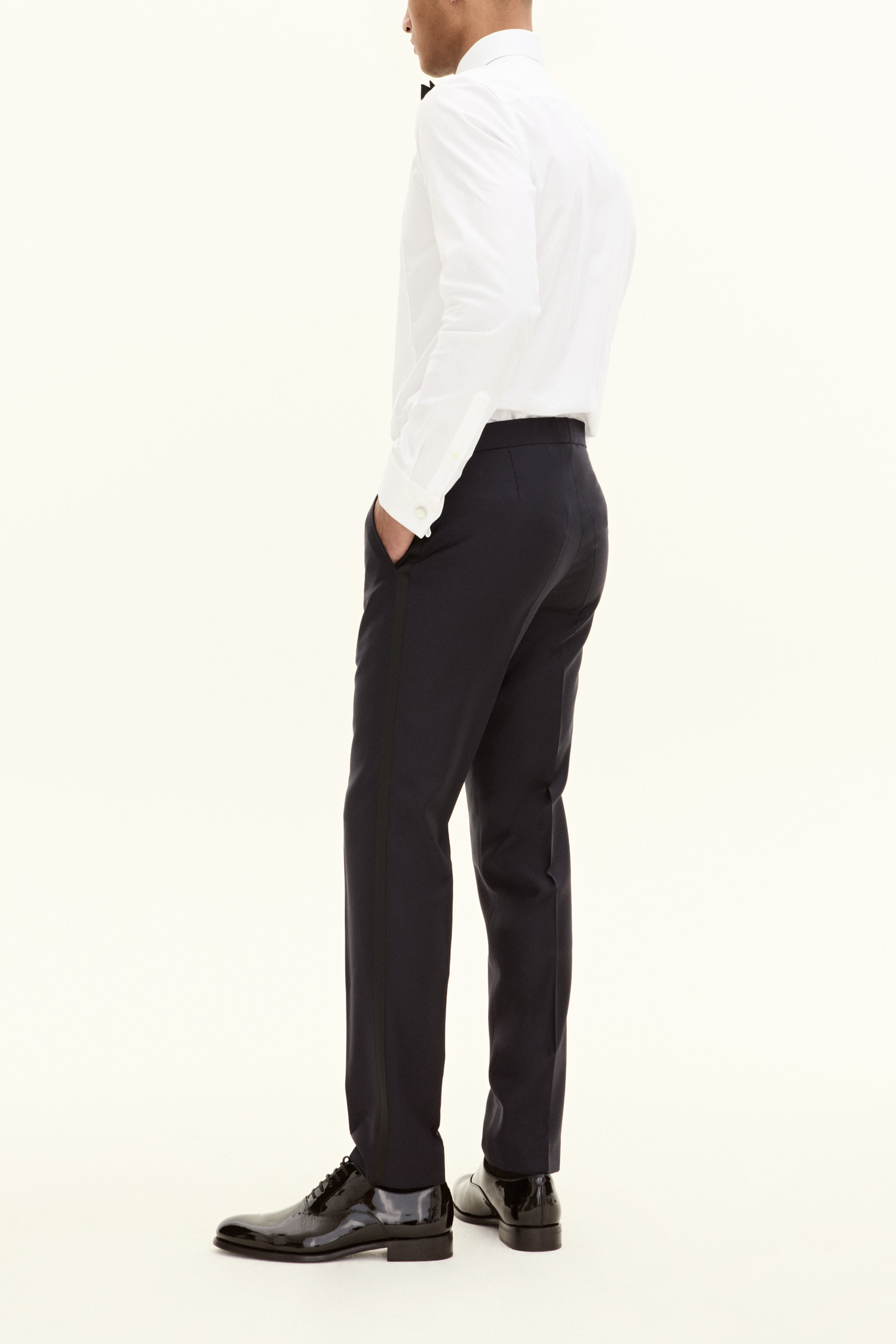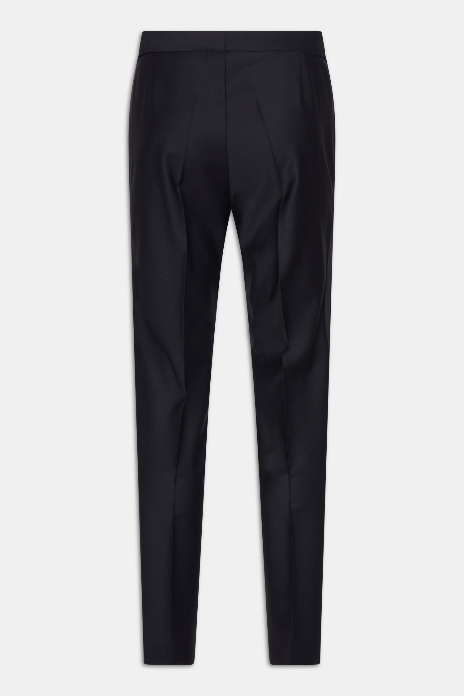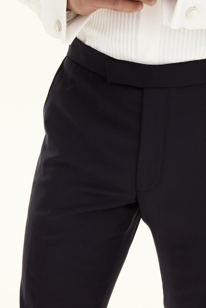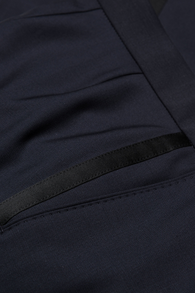 Classic tuxedo trousers with silk stripes. This model is made of 100% wool and has a narrow fit. Equipped with buttons on the inside of the waist to attach the braces.