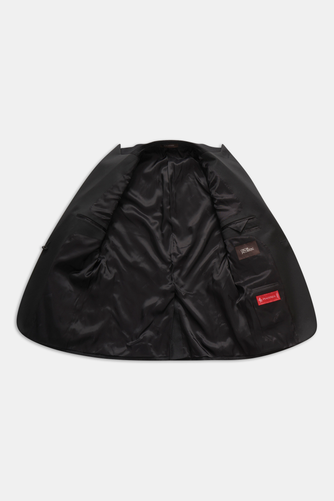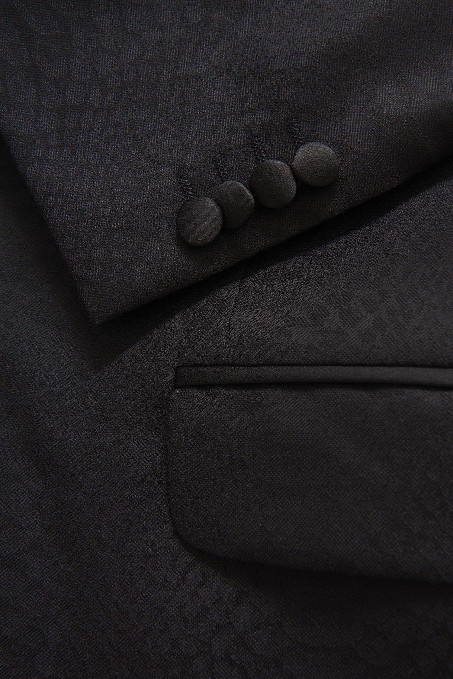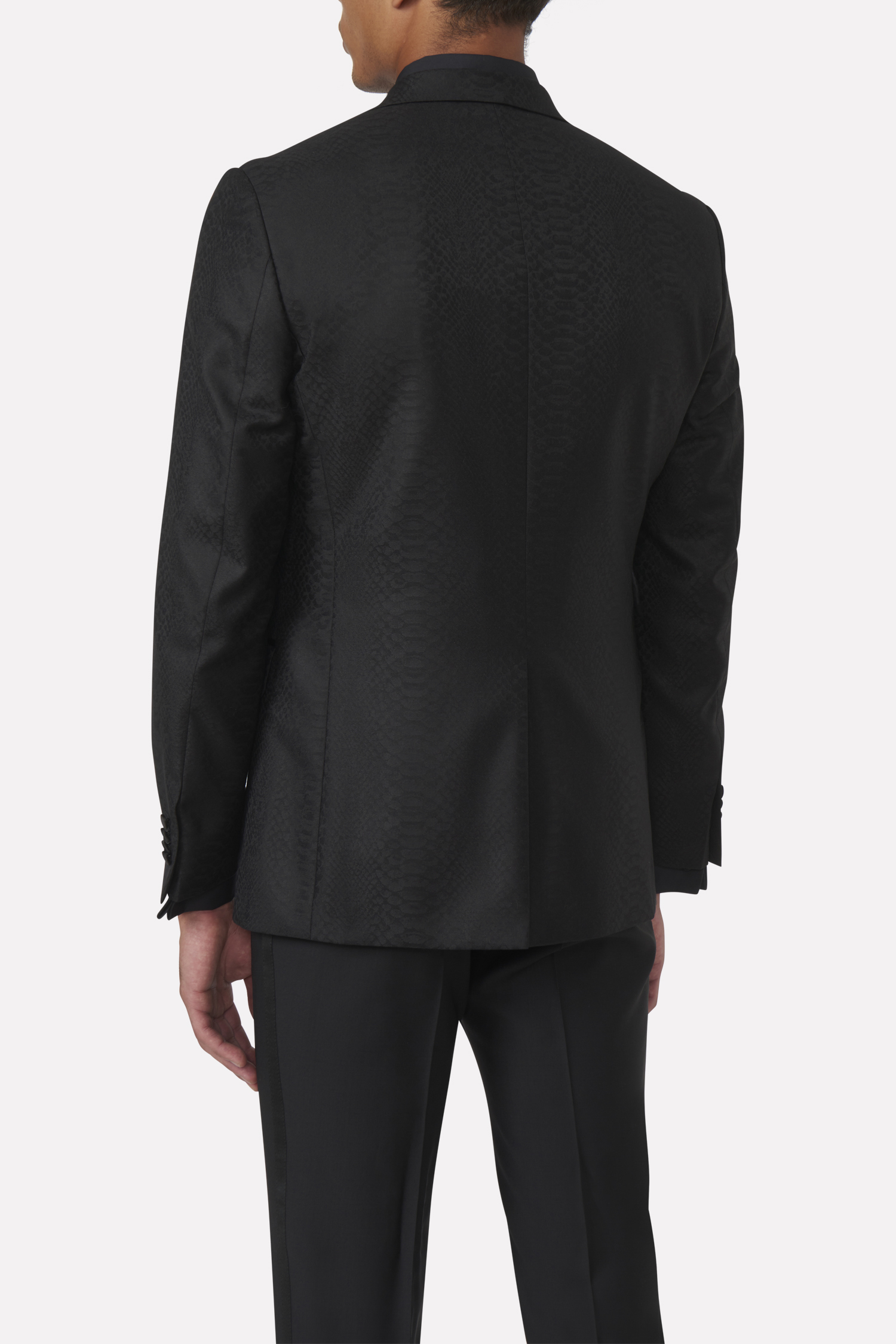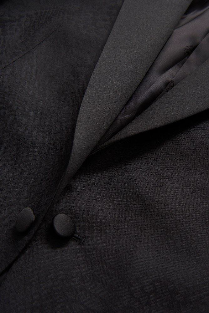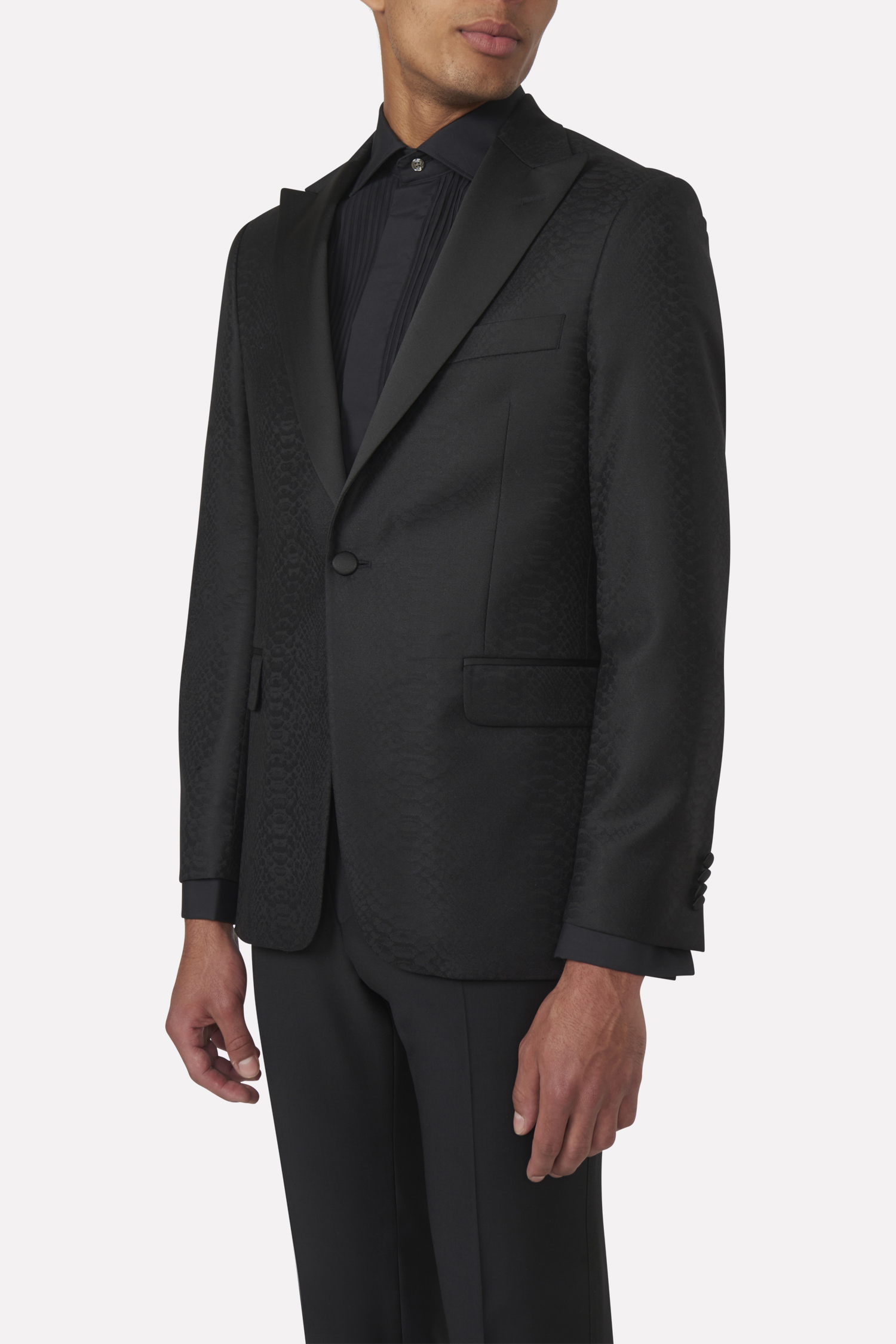Fully lined tuxedo with pointed lapels and dressed buttons. A fit with a more traditional cut and classic fit. Here in black glossy wool fabric with a weak tone in tone snakeskin structure.