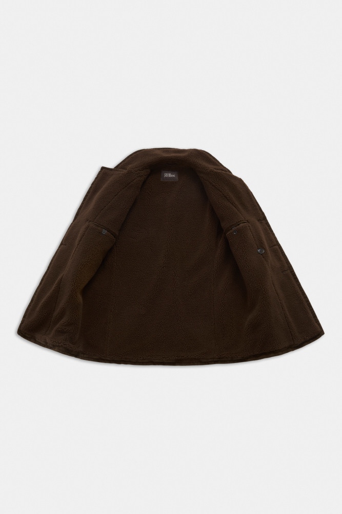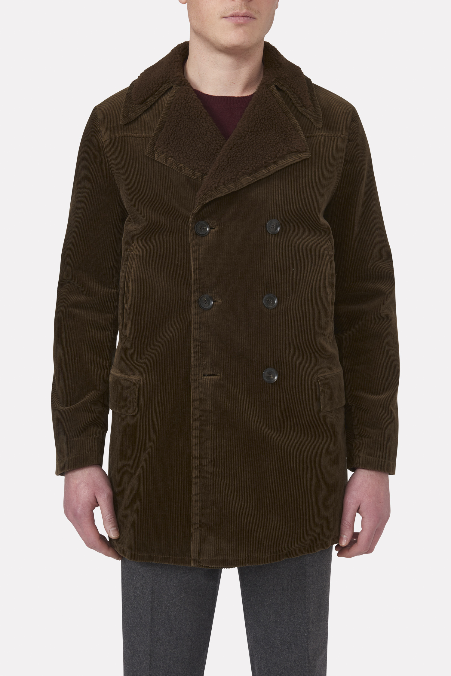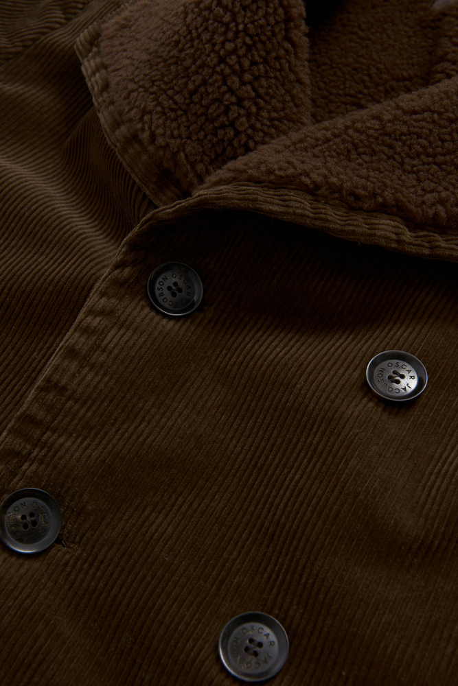 Double-breasted coat in corduroy, an outer garment that stands out in the autumn weather. The coat is equipped with slanted pockets and pockets with lids. Fully lined inside in teddy quality, equipped with double inner pockets.