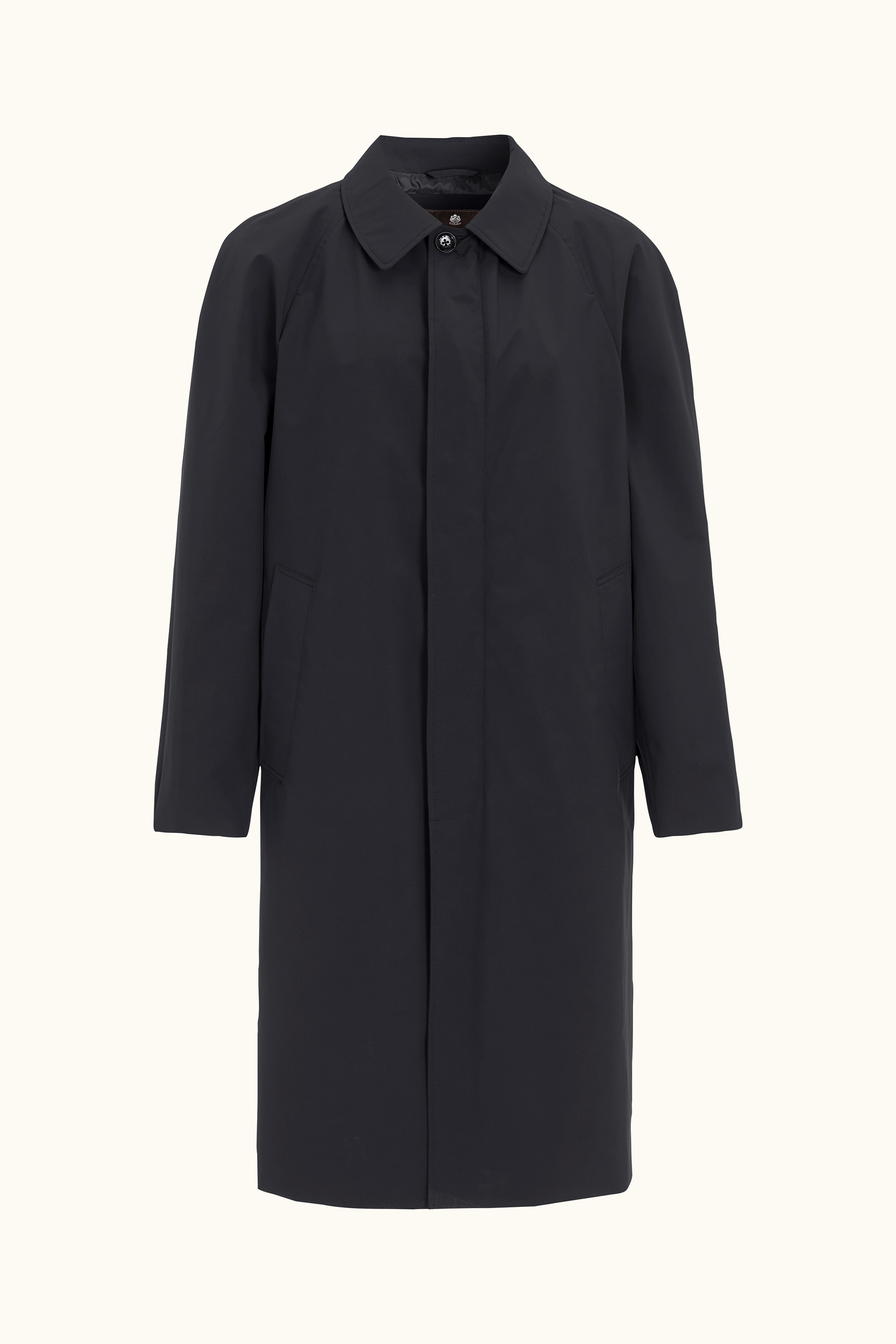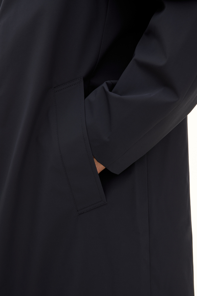 Our classic Raglan Coat in Nylon Shell is designed to be a versatile outer layer for everyday wear, complementing both formal suits and casual jeans. In addition to the water-resistant and waterproof outer fabric, the coat features taped shoulder seams to keep you dry in harsher weather conditions. The interior is lined with durable ripstop fabric and includes three inner pockets as well as buttons for attaching our liner vests. The coat has a soft raglan shoulder and an extended length with a buttoned back vent, providing extra coverage against rain. Nylon Shell is our three-layer shell material, developed to protect against the elements without compromising mobility, breathability, or style.