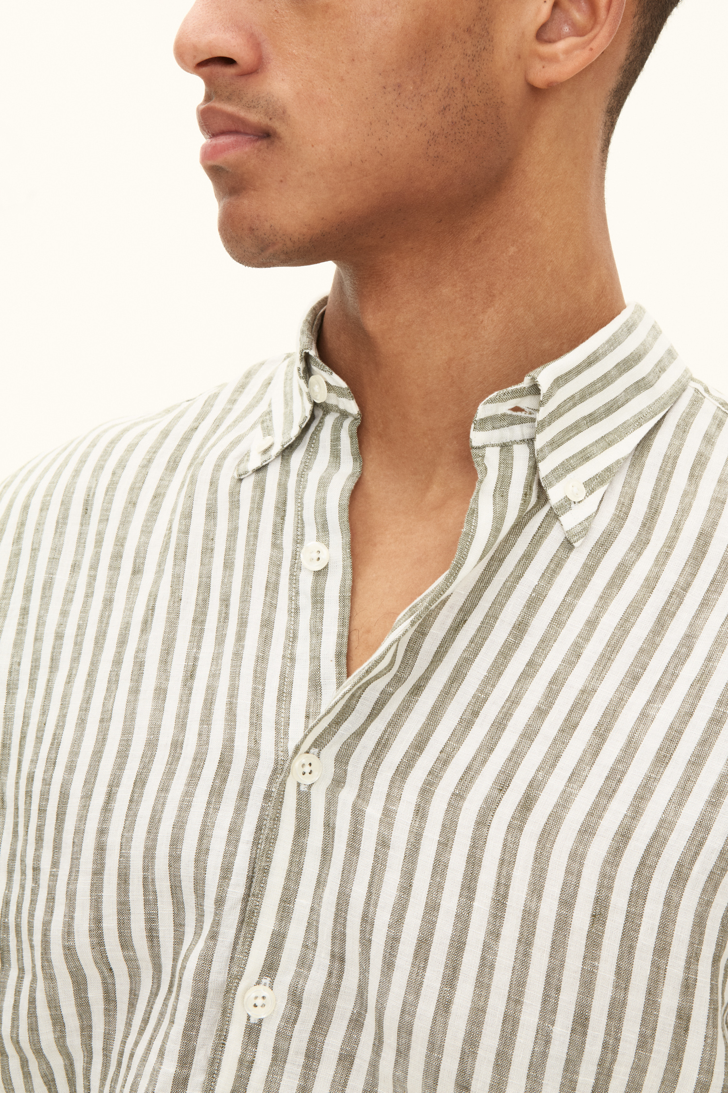 Our striped linen shirt in regular fit is a stylish choice for any occasion. It features a button down collar and a single chest pocket. The shirt is made from 100% linen and has a stripe pattern. Perfect for a polished look.