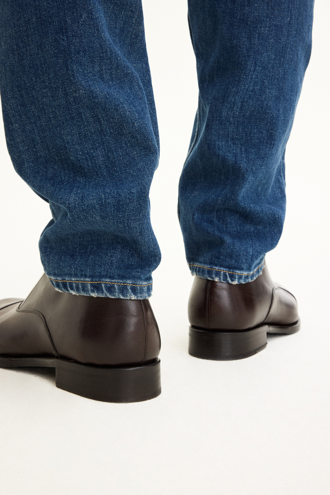 The fit has a loose top and knees with a narrow bottomleg, the waist normal to high. Made of stretch denim from Candiani in Italy, which is woven on old, used looms from Levis with buttons and rivets from Italy and Borås.The jeans are made of 100% sustainably grown cotton.