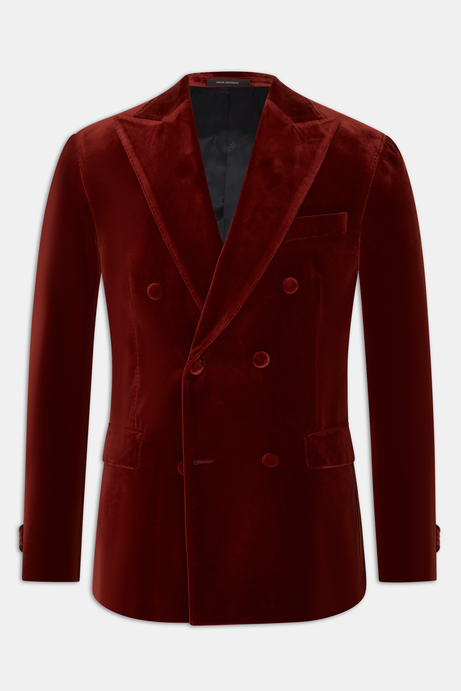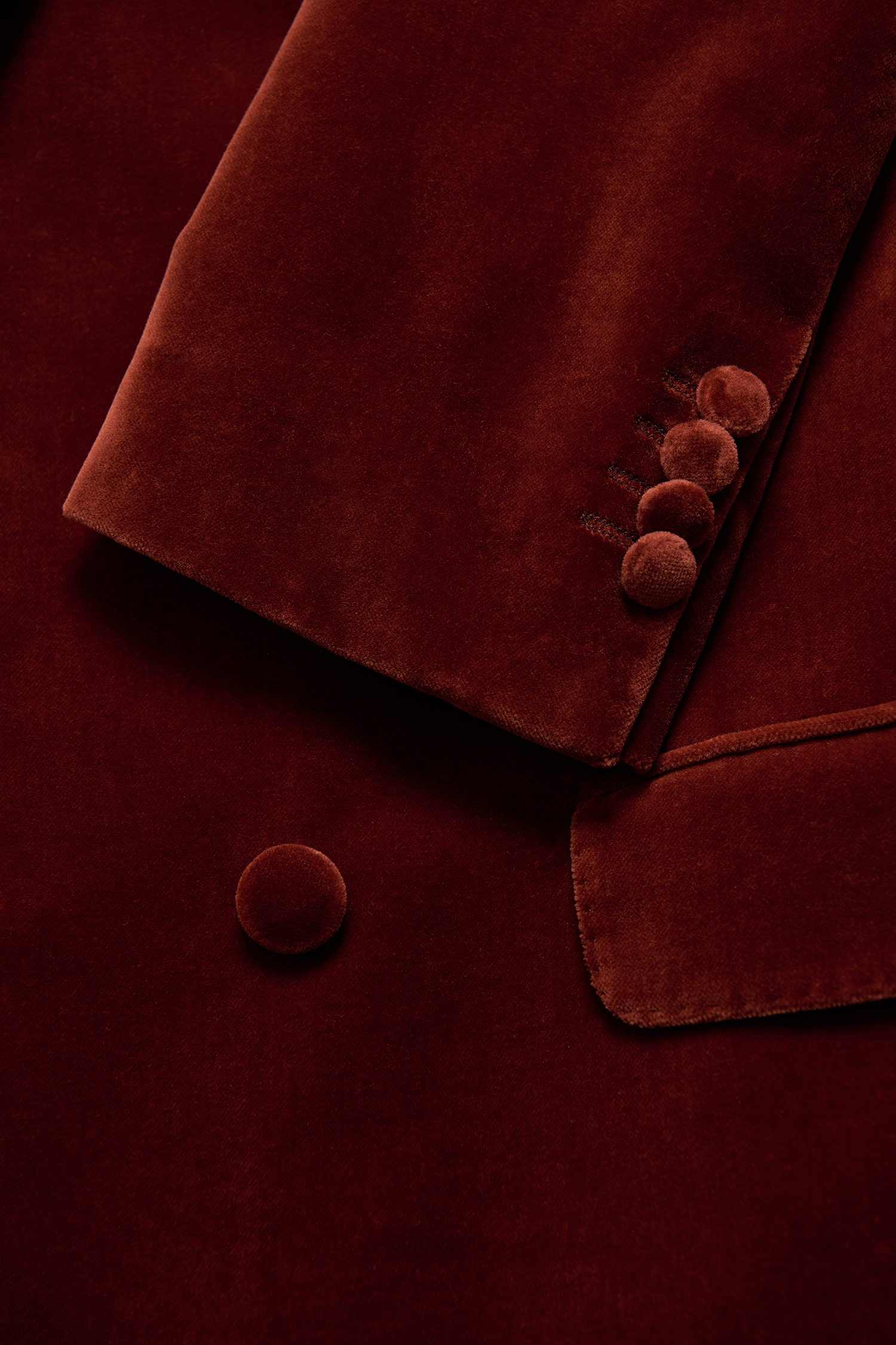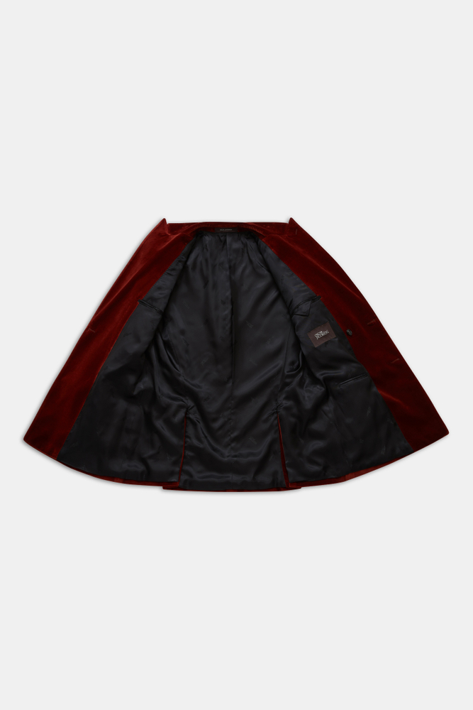 Double breasted tuxedo jacket in velvet with peak lapels. Made in cotton from weaver Pontoglio. Fully lined inside in viscose for increased comfort and feel, equipped with covered buttons.