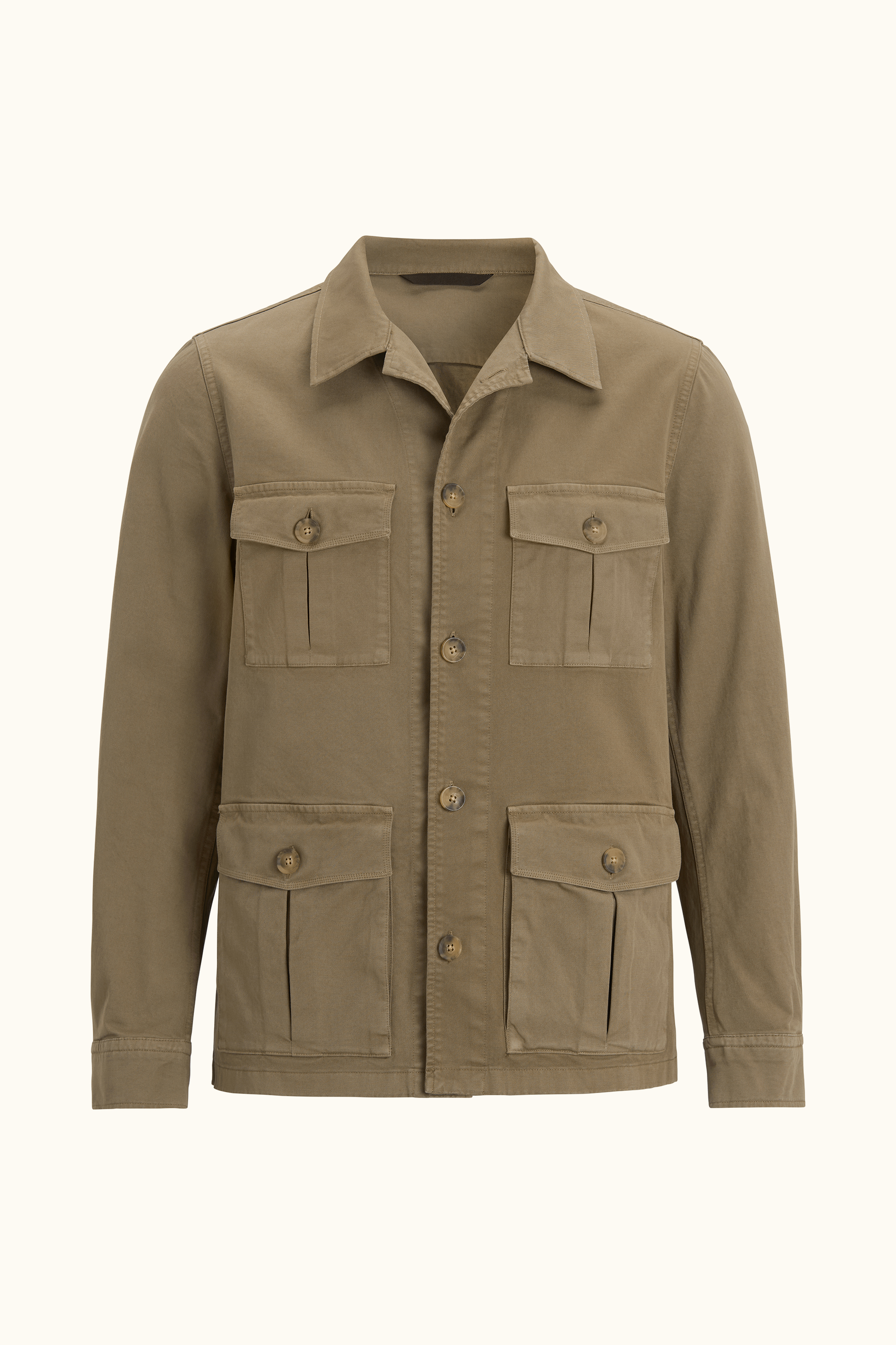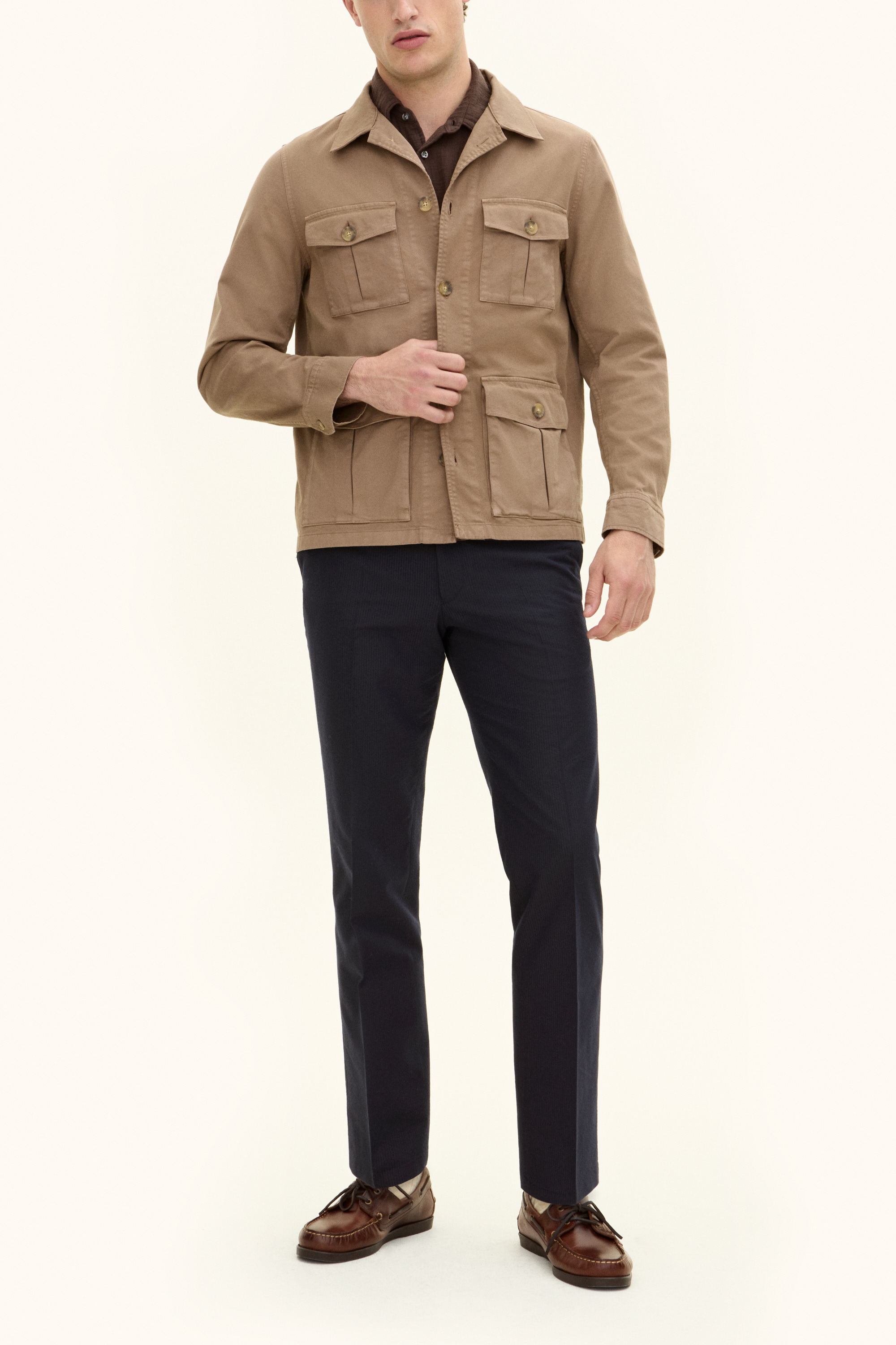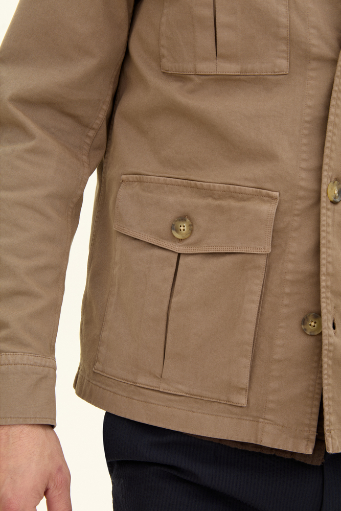 Unlined overshirt in safari model in a straight fit. Provided with patch pockets. The fabric is made of robust washed cotton with elastane, for extra comfort.