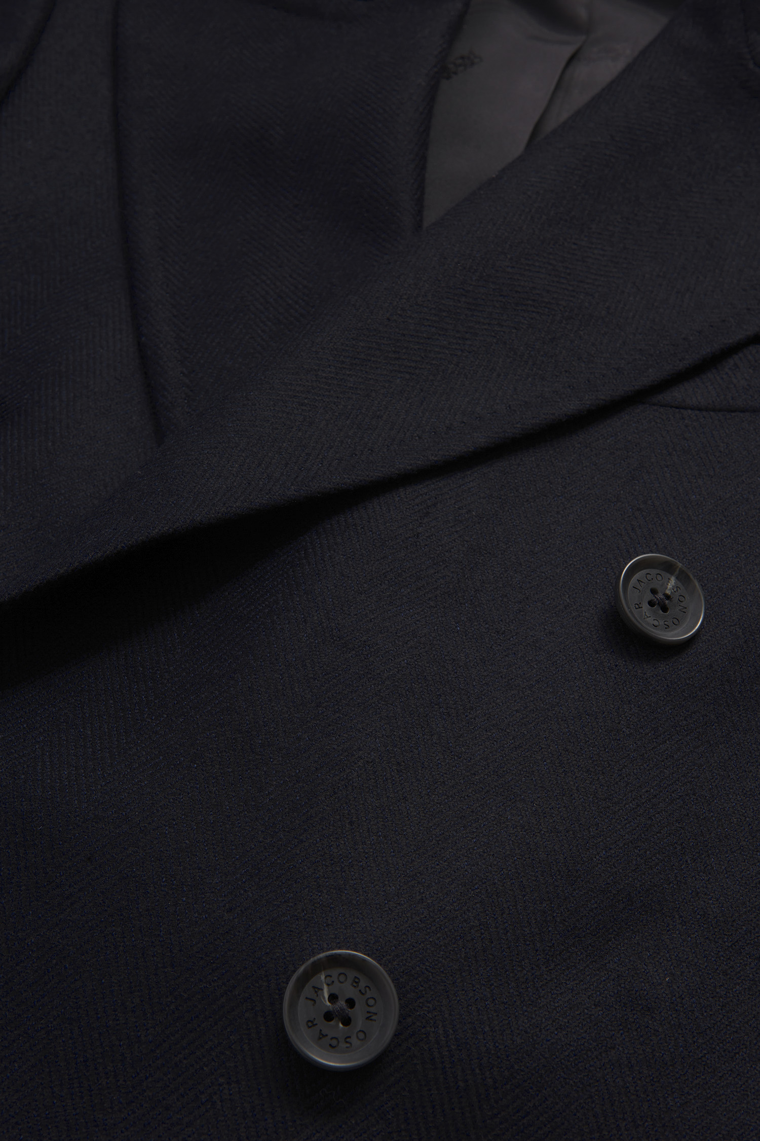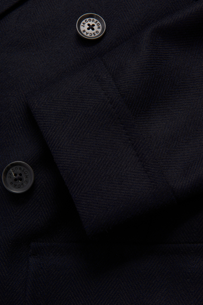 A classic double breasted polo coat with patch pockets and double inner pockets. Fabric in cashmere and wool mix with a herringbone pattern.