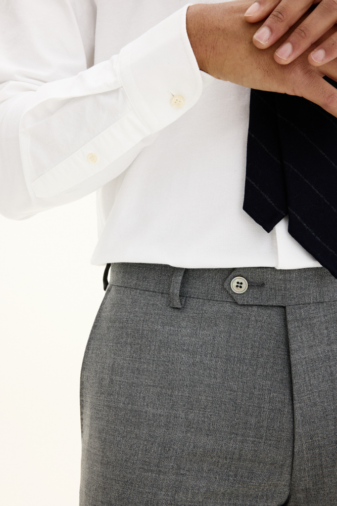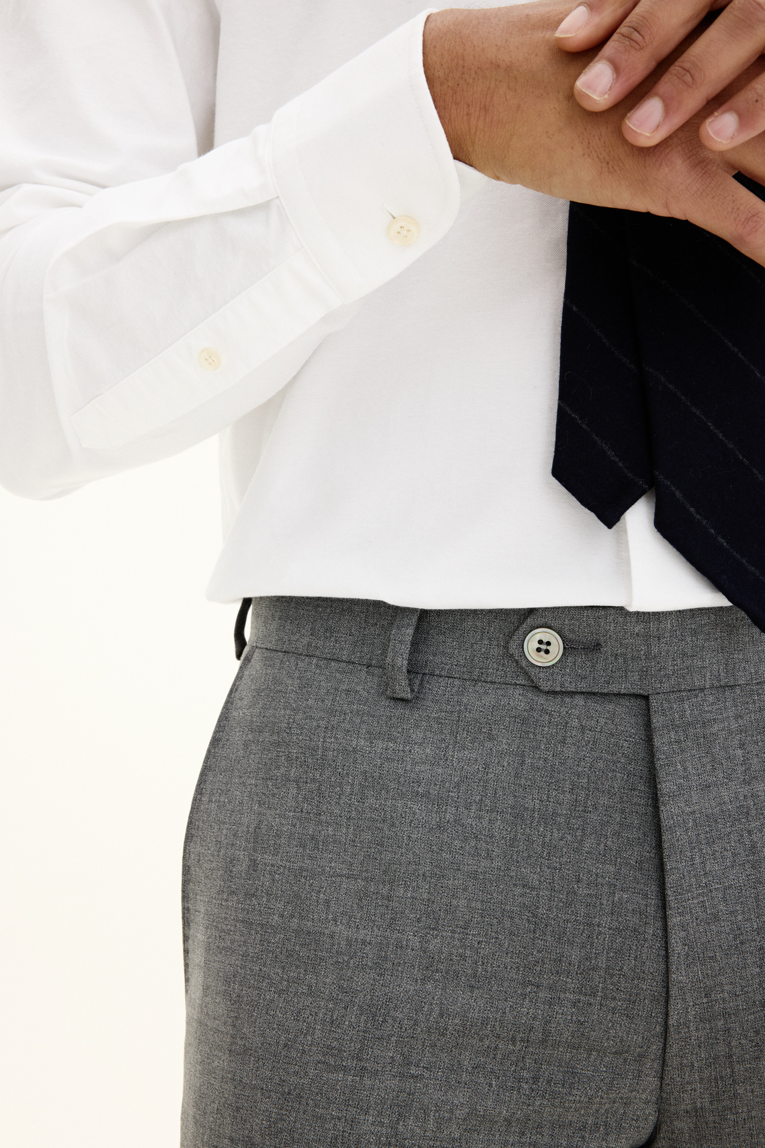 These trousers are made from a tropical weave wool with an elegant microstructure. This model has a tapered fit and a leg length that is slightly shorter than classic suit trousers. A perfect pair of pants to wear with a shirt or polo shirt!