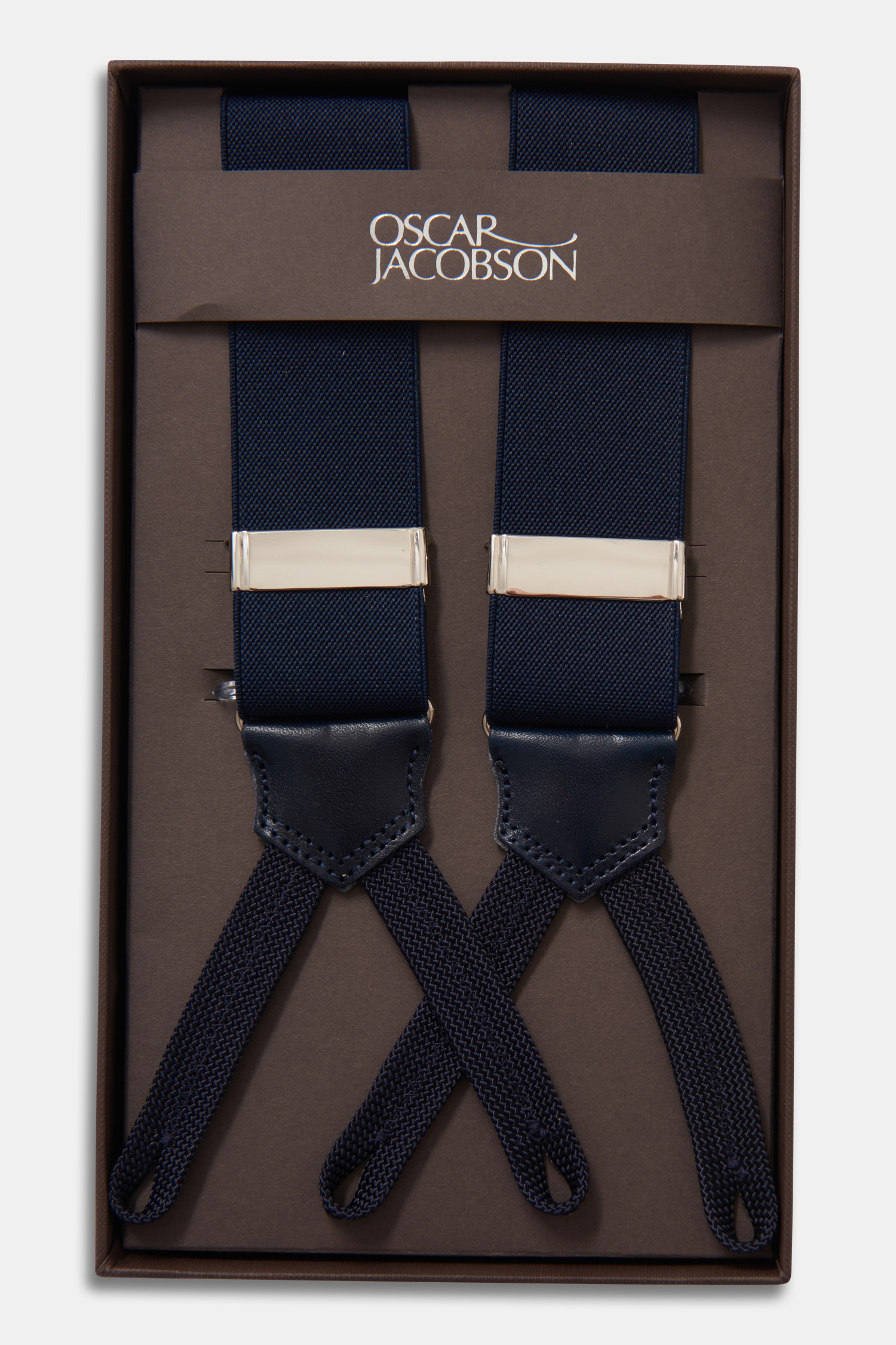 Ensfargede bukseseler laget i Italia. 3,5 cm brede stropper i strikk, festes til bukser med knapper. Detaljer i PU-skinn.