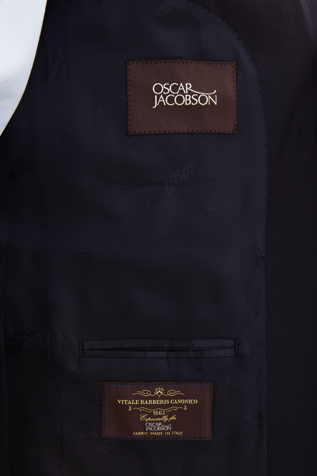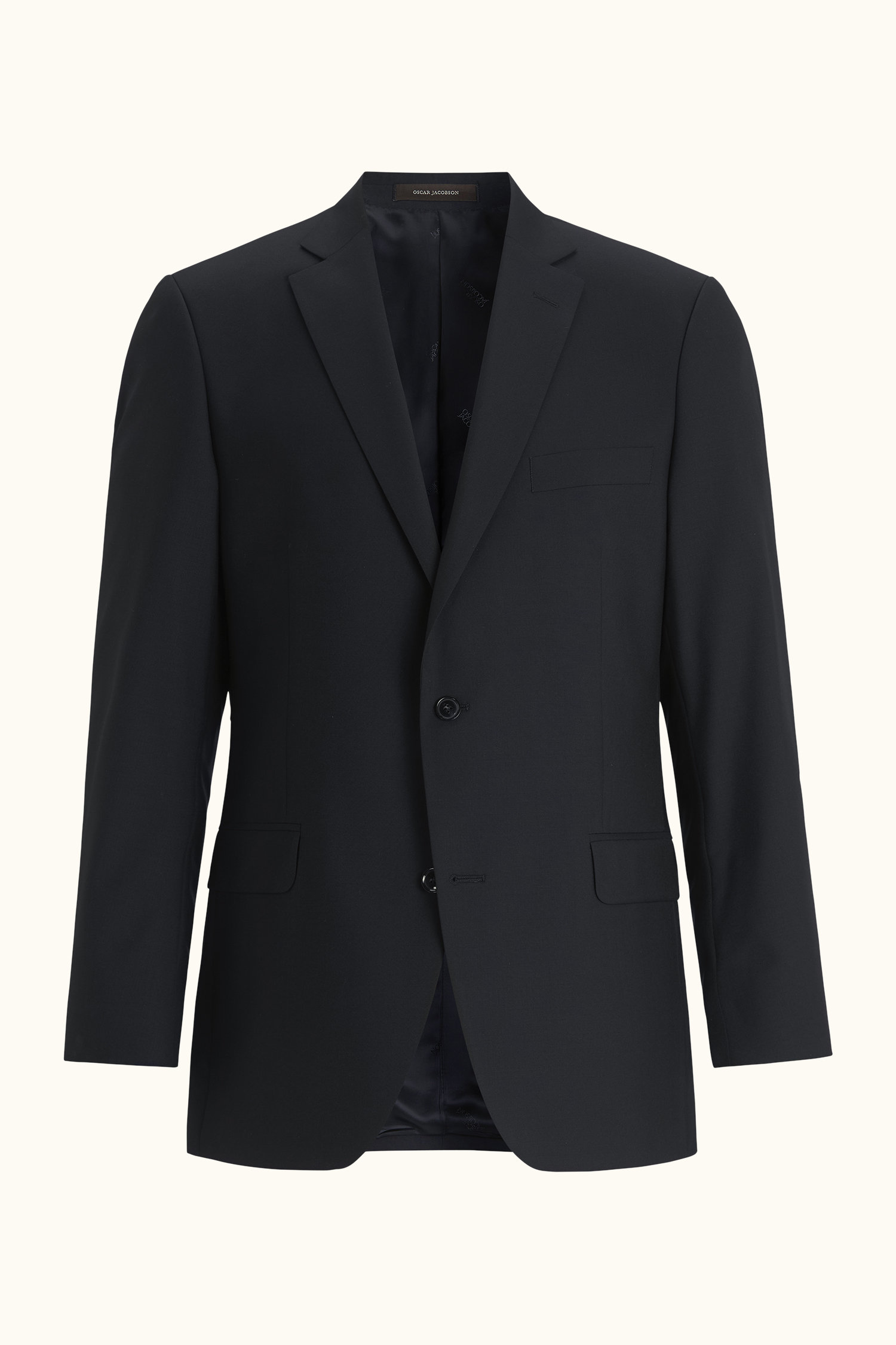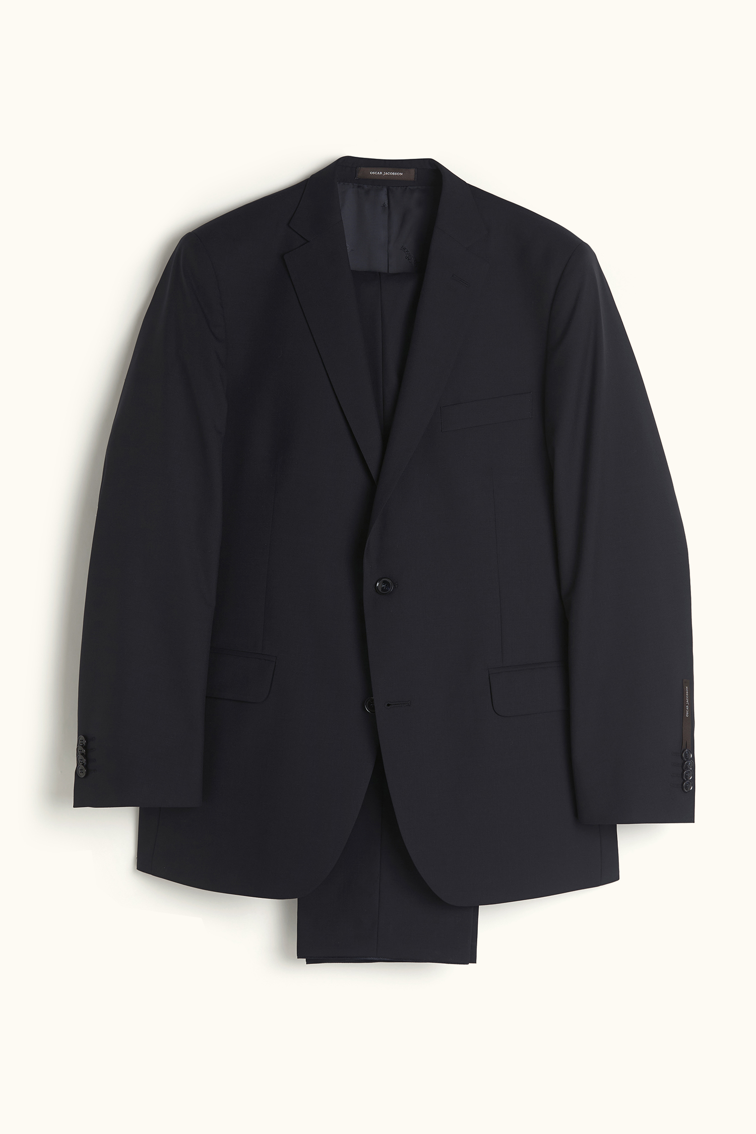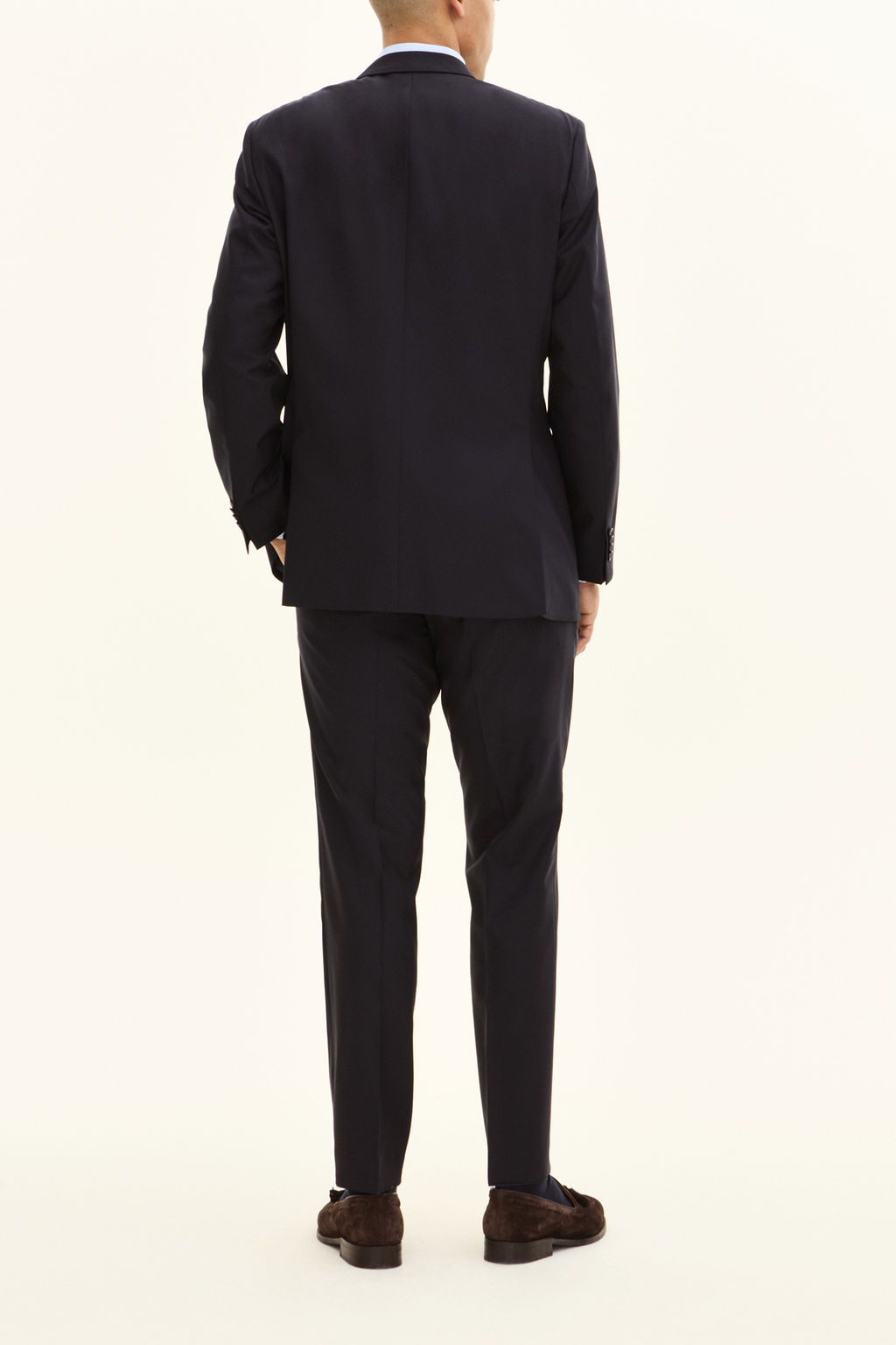 Klubbkostym i mørkeblått ullgarn med struktur fra det italienske veveriet Marzotto. En myk konstruksjon der mellomlegg og skulderoppbygging er nærmest fraværende. Jakken er foret og har lommer med klaff. Tilhørende bukser har en klassisk, noe avsmalnende passform og en normalhøy midje.