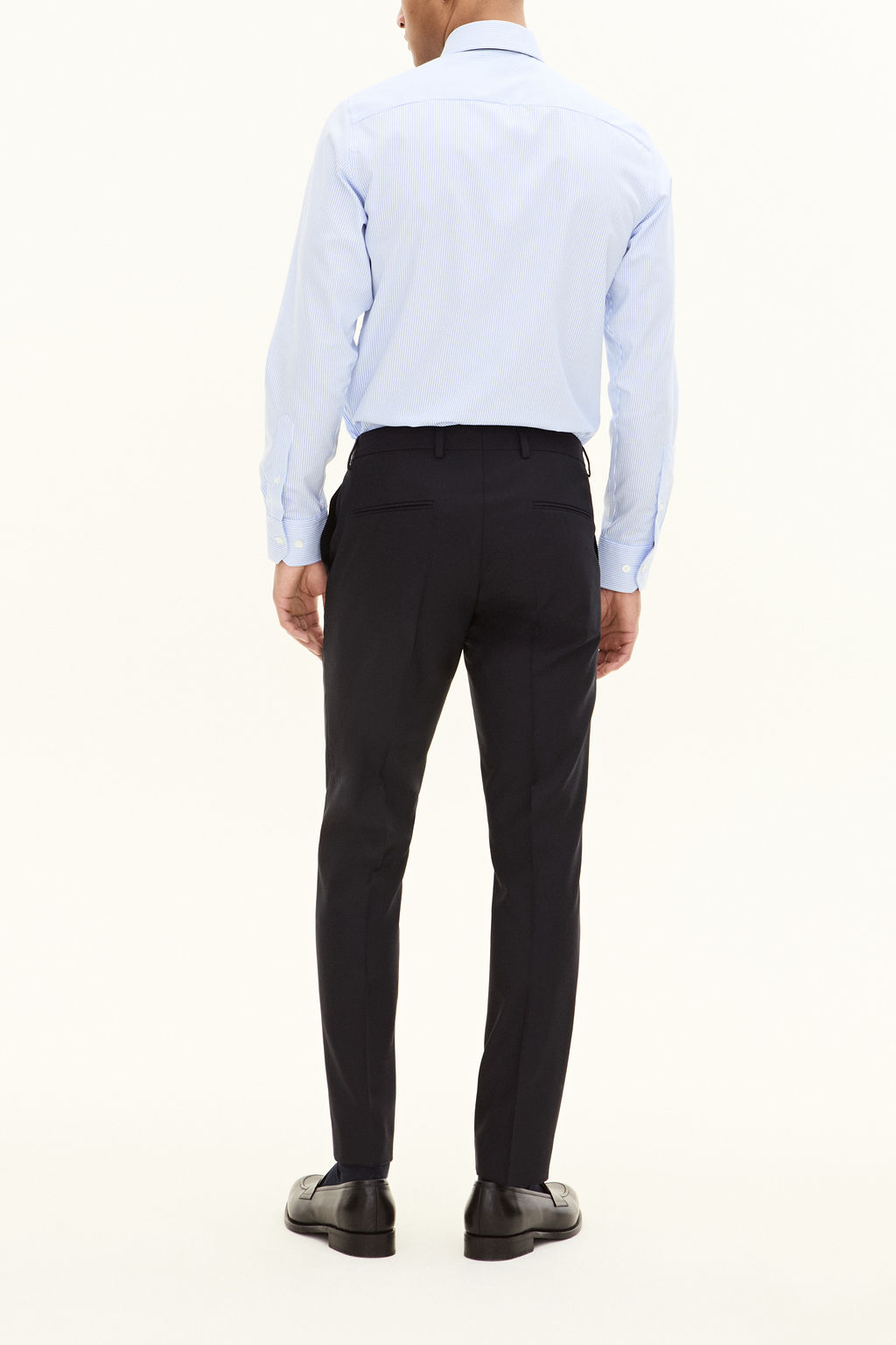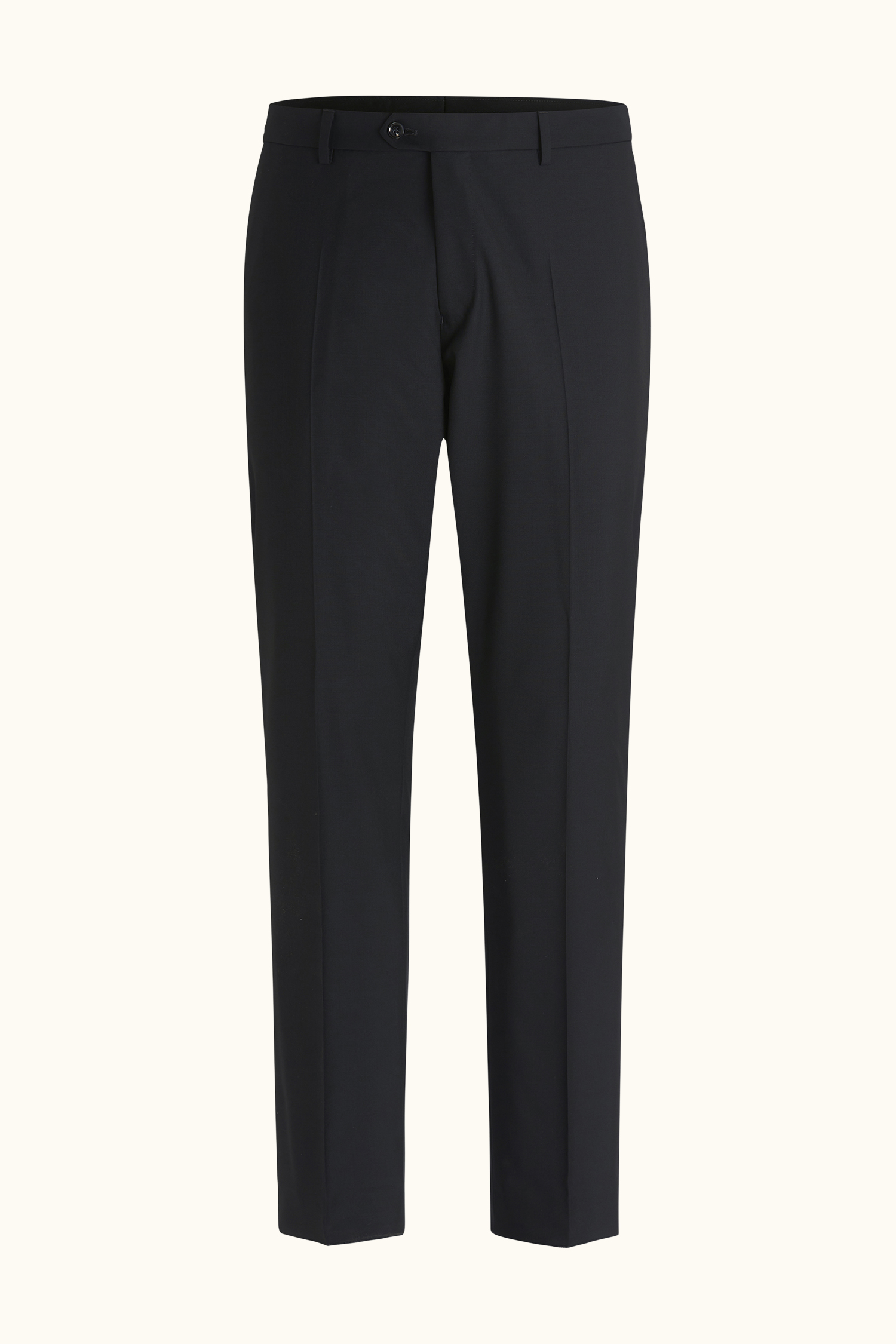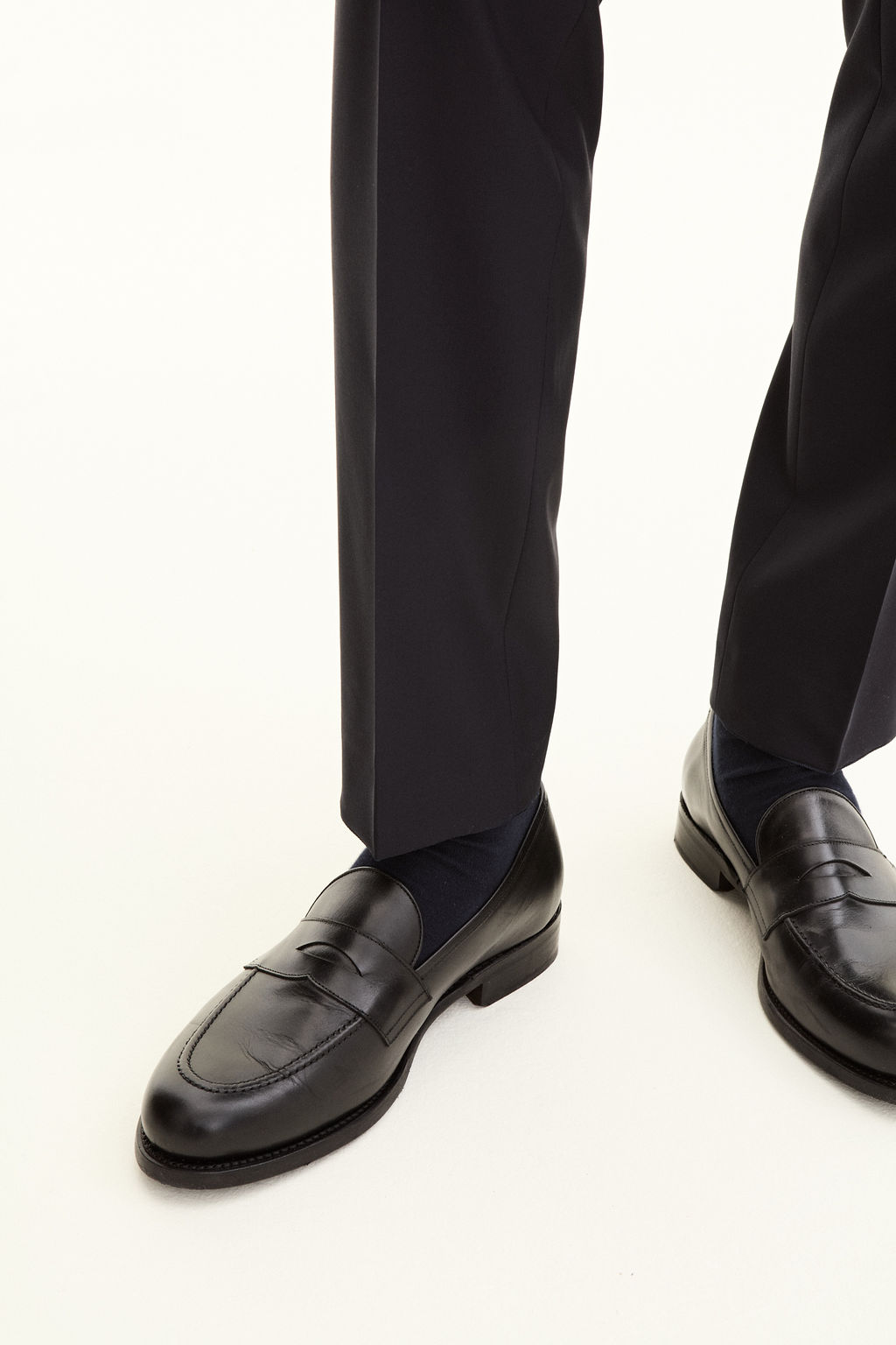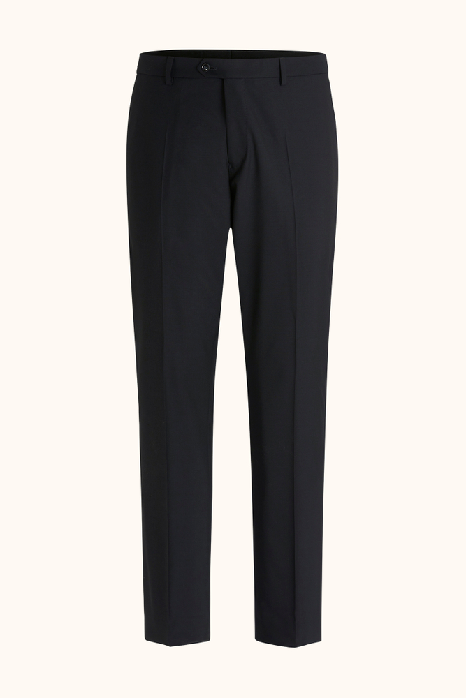 Klubbkostym i mørkeblått ullgarn med struktur fra det italienske veveriet Marzotto. En myk konstruksjon der mellomlegg og skulderoppbygging er nærmest fraværende. Jakken er foret og har lommer med klaff. Tilhørende bukser har en klassisk, noe avsmalnende passform og en normalhøy midje.