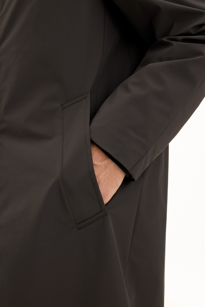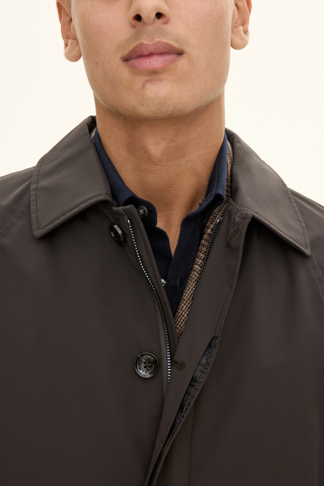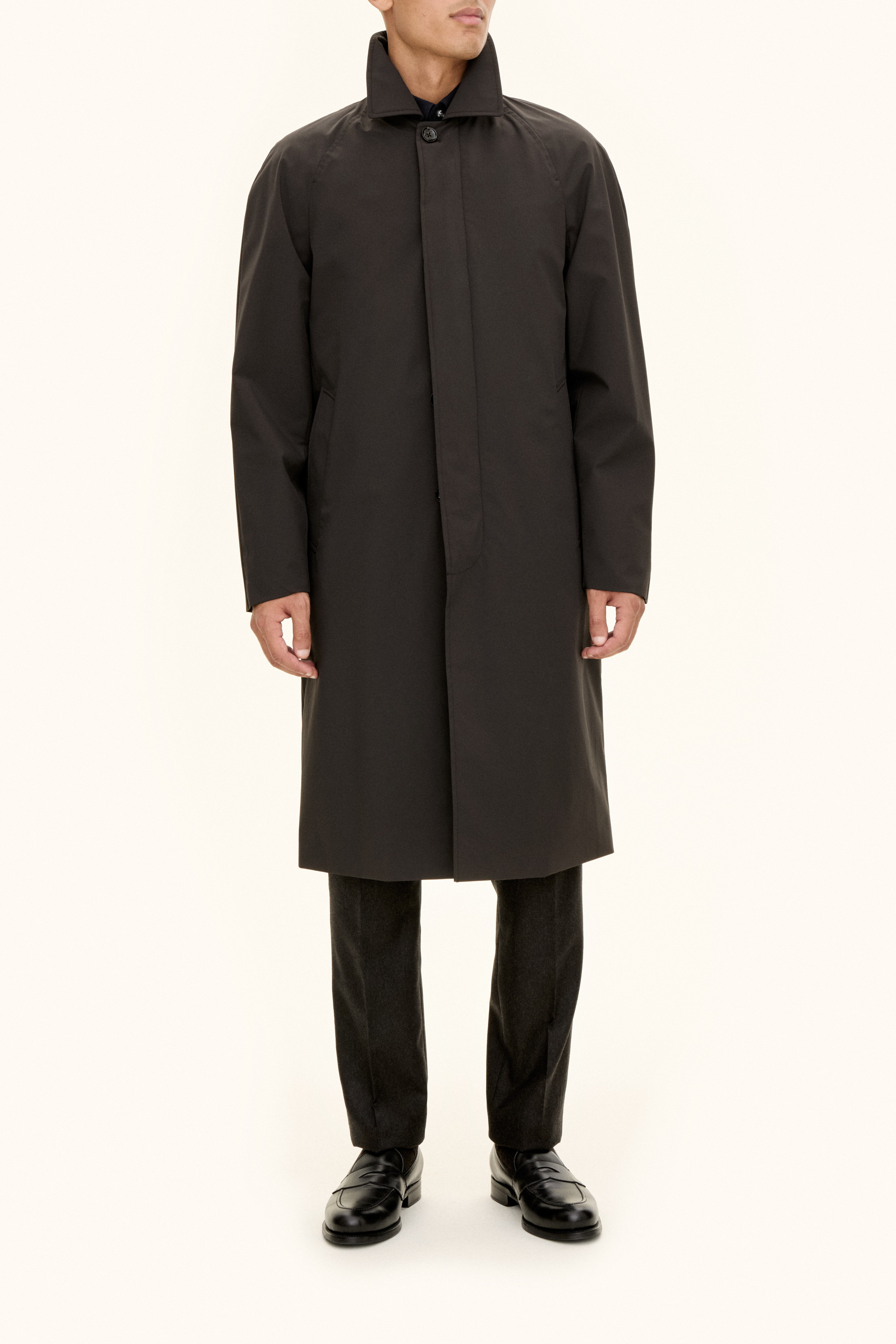 Vår klassiske Raglan Coat i Nylon Shell er designet for å være et heldekkende skallplagg til hverdagen og fungerer både til formelle dresser og avslappede jeans. I tillegg til det vannavvisende og vanntette ytterstoffet har frakken teipede sømmer i skuldersømmen for å holde deg tørr i tøffere vær. Innsiden av frakken er trukket med et slitesterkt ripstop-fôr og kommer med tre innerlommer samt knapper til å feste våre liner-vester. Frakken har en myk raglan-skulder, ekstra lengde og sydde splitter nederst for å tåle vær enda bedre. Nylon Shell er vårt trelags skallmateriale designet for å beskytte mot vær og vind uten å gå på kompromiss as mobilitet, pusteevne eller stil.