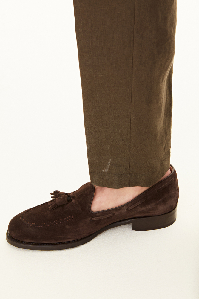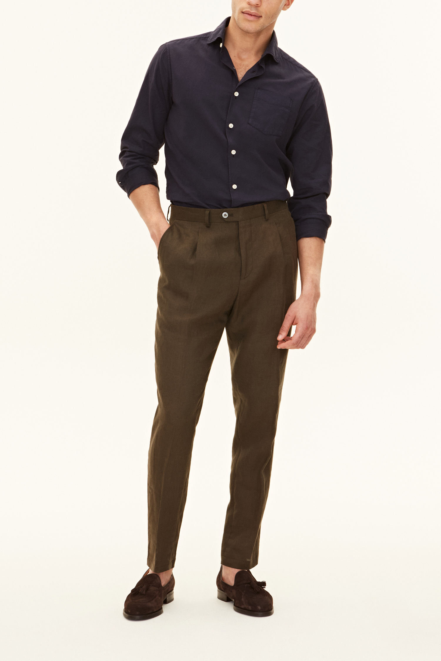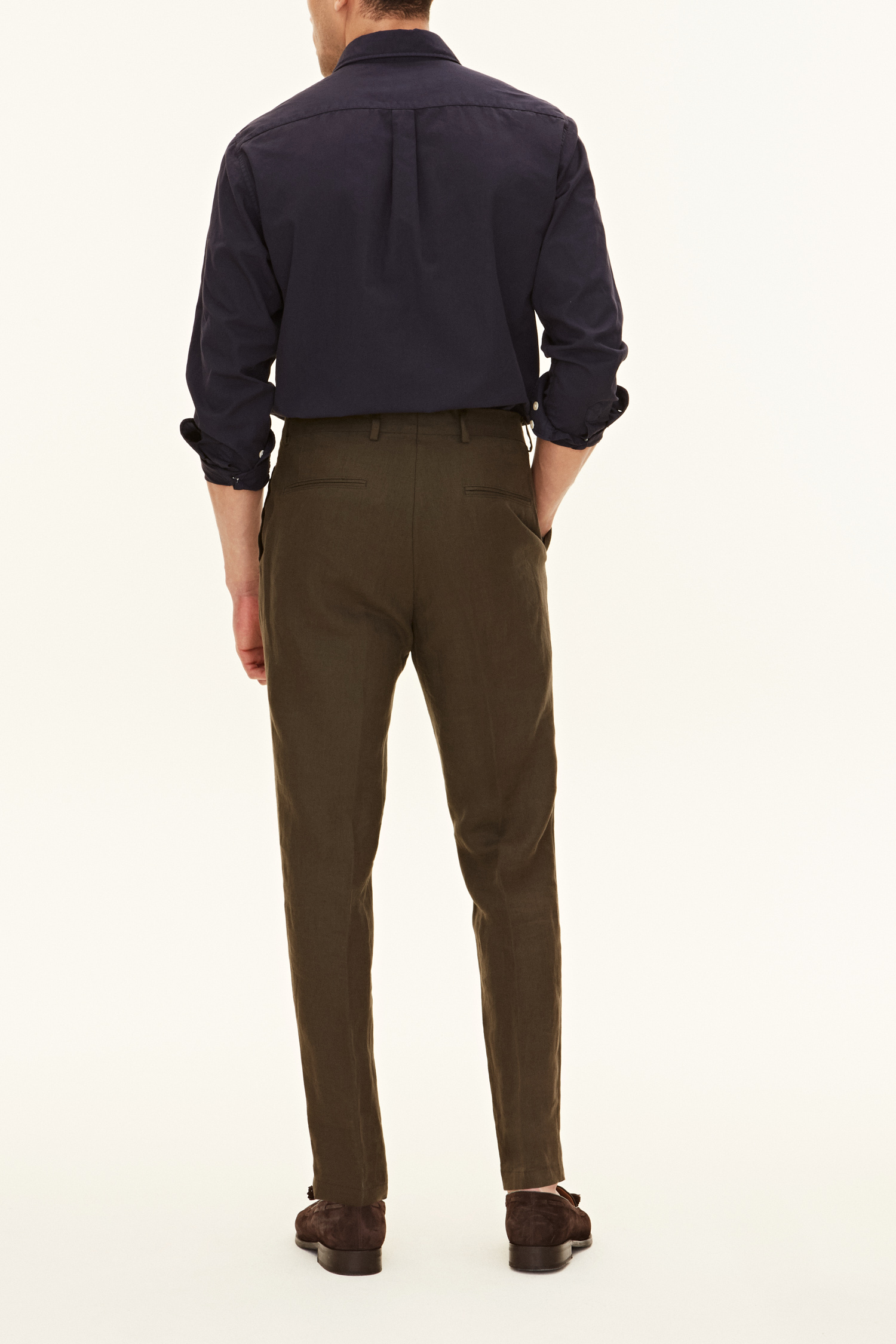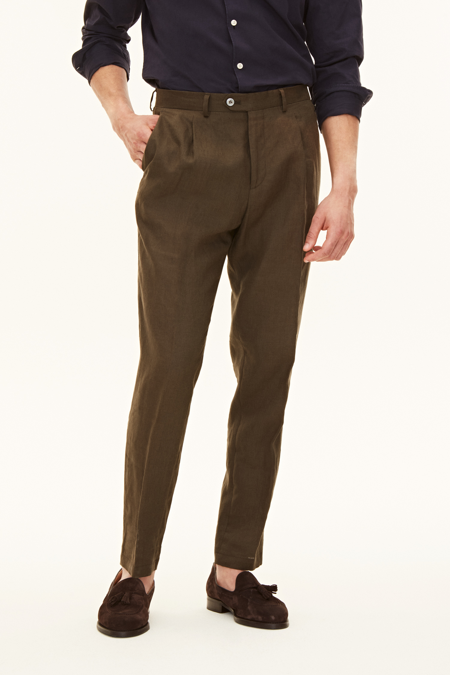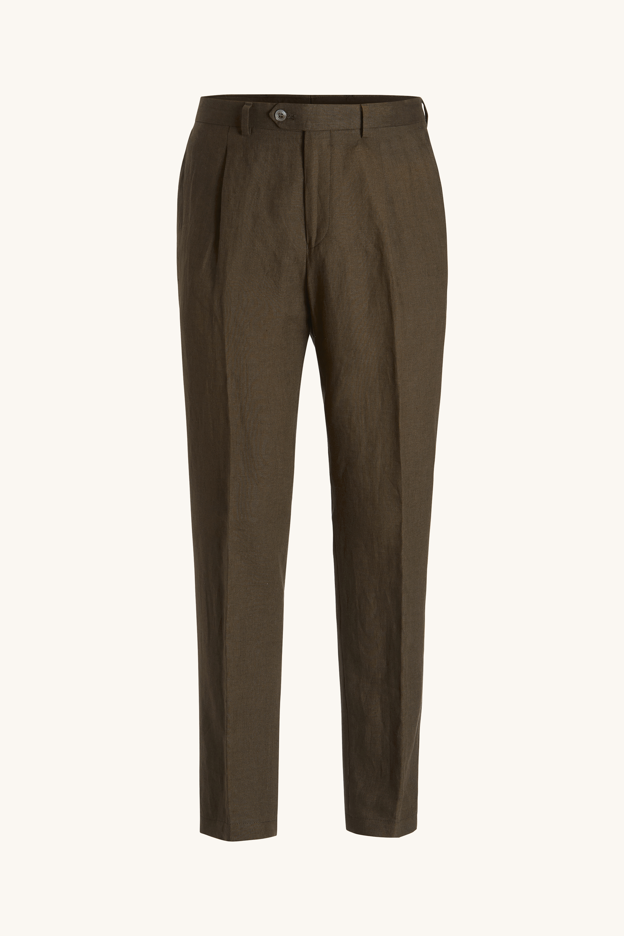 Bukse med en høyt liv og enkle legg, med videre passform i lår og avsmalnede ben. Laget i tynt linstoff.