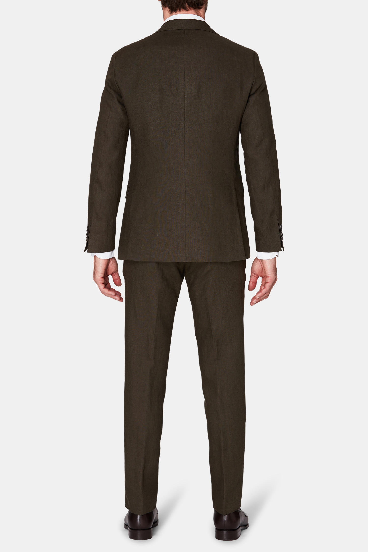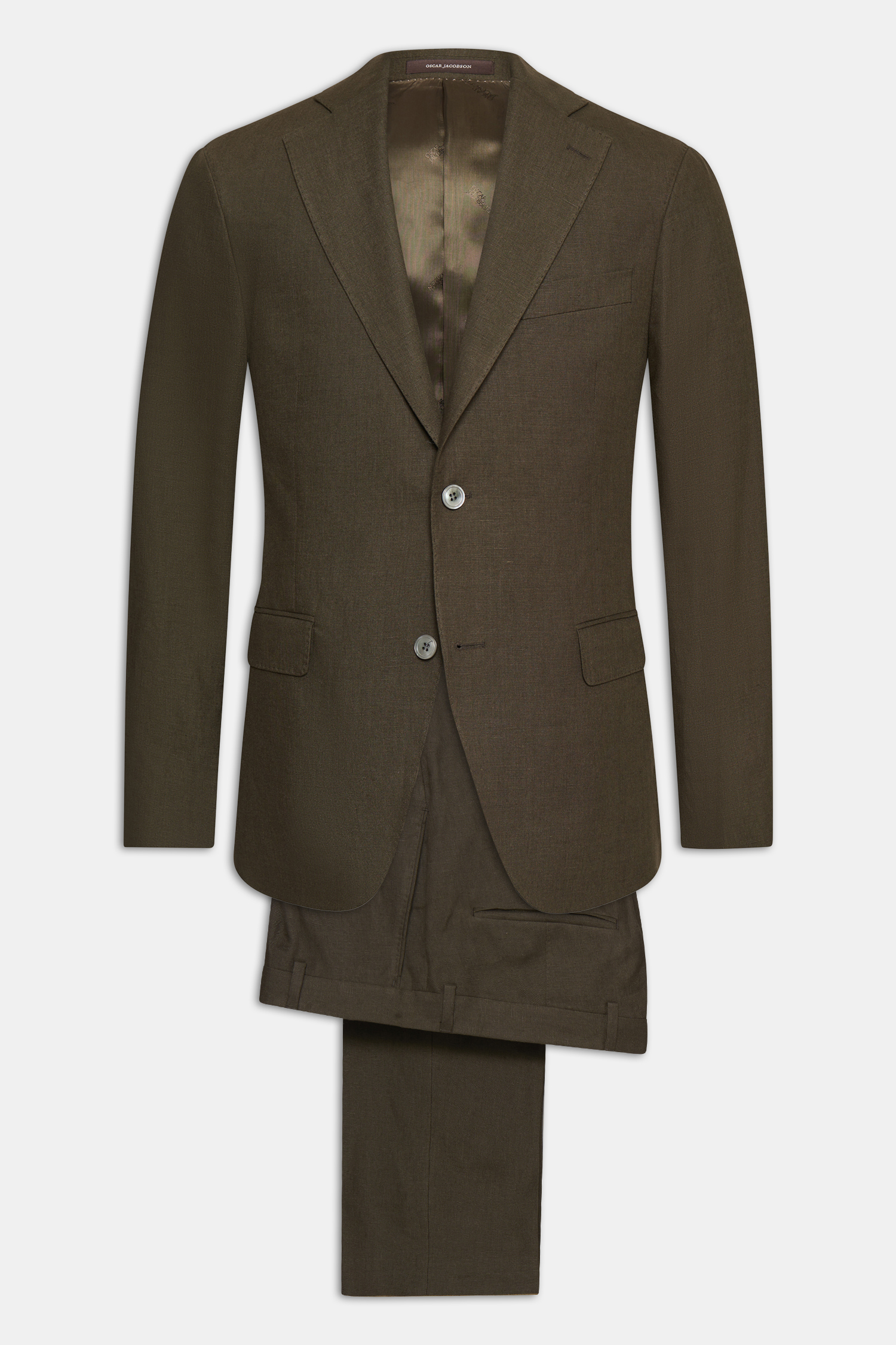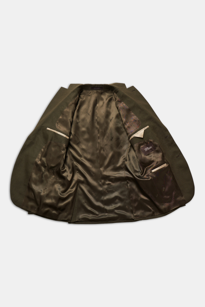 Klubbkostym i mørkeblått ullgarn med struktur fra det italienske veveriet Marzotto. En myk konstruksjon der mellomlegg og skulderoppbygging er nærmest fraværende. Jakken er foret og har lommer med klaff. Tilhørende bukser har en klassisk, noe avsmalnende passform og en normalhøy midje.