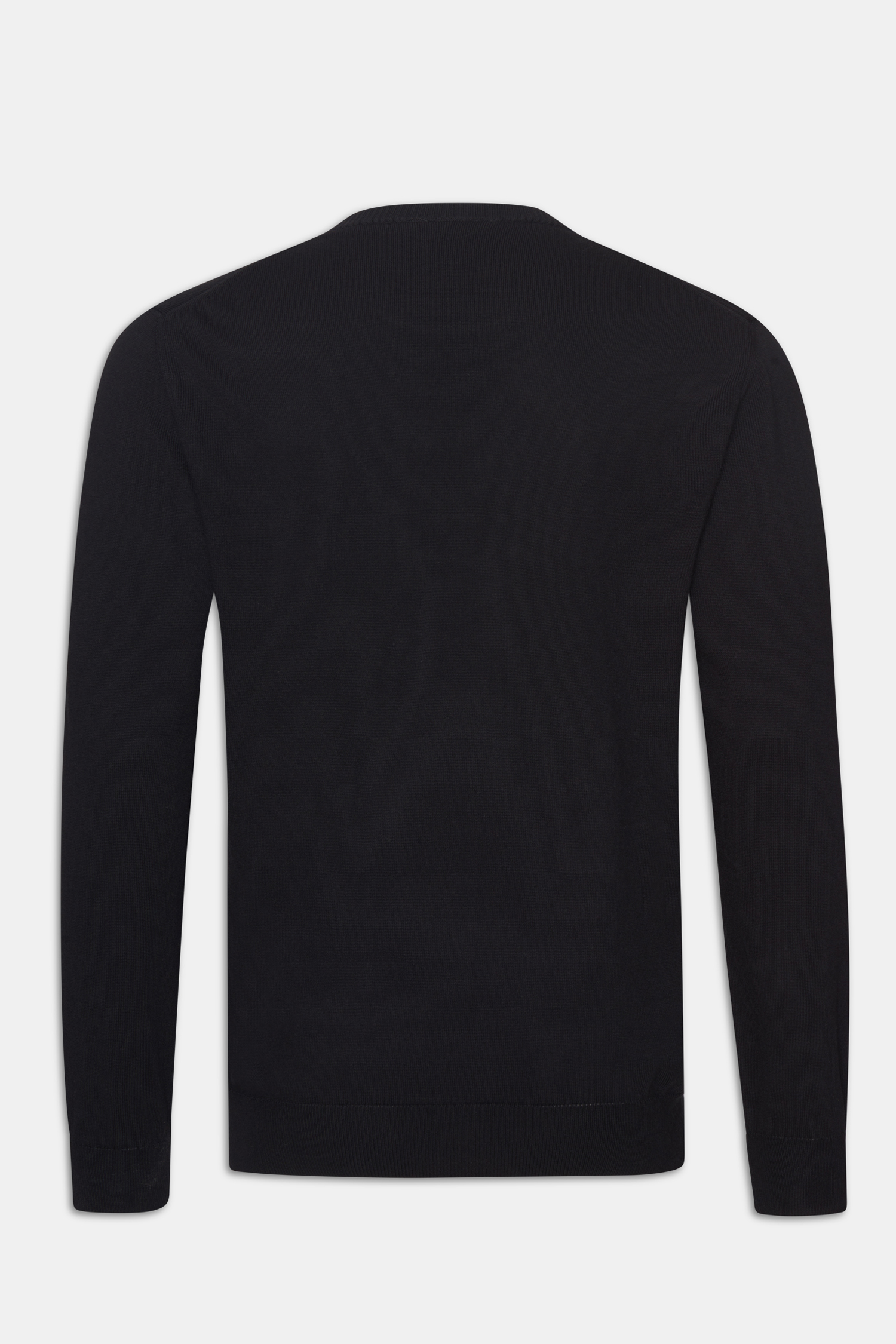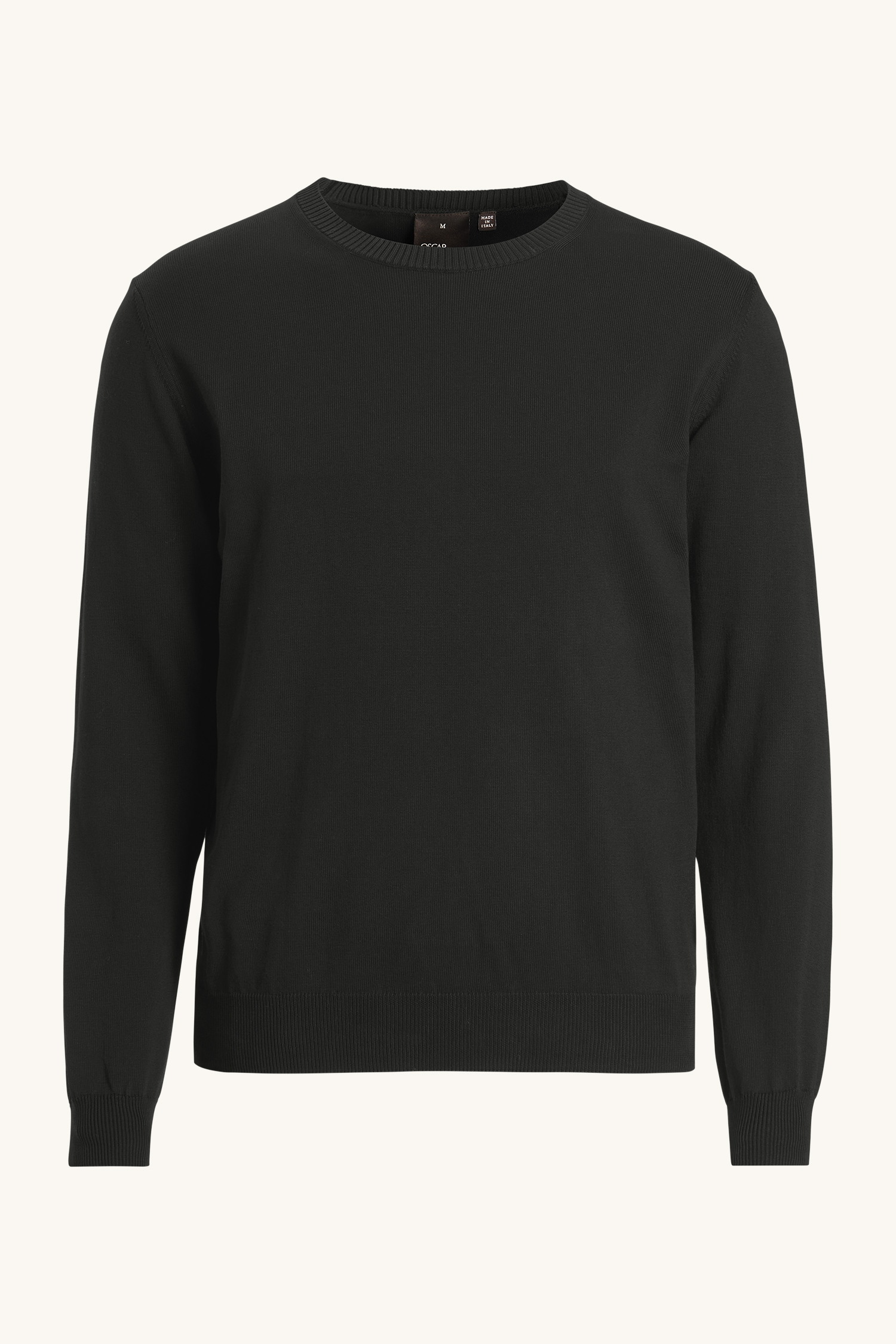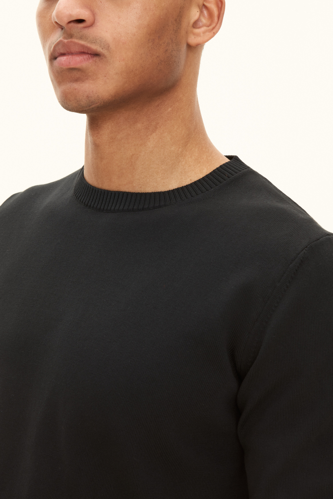 Rundhalset strikket genser utstyrt med ribbestrikket krage. Laget av et tynt bomullsstoff som passer perfekt om sommeren.