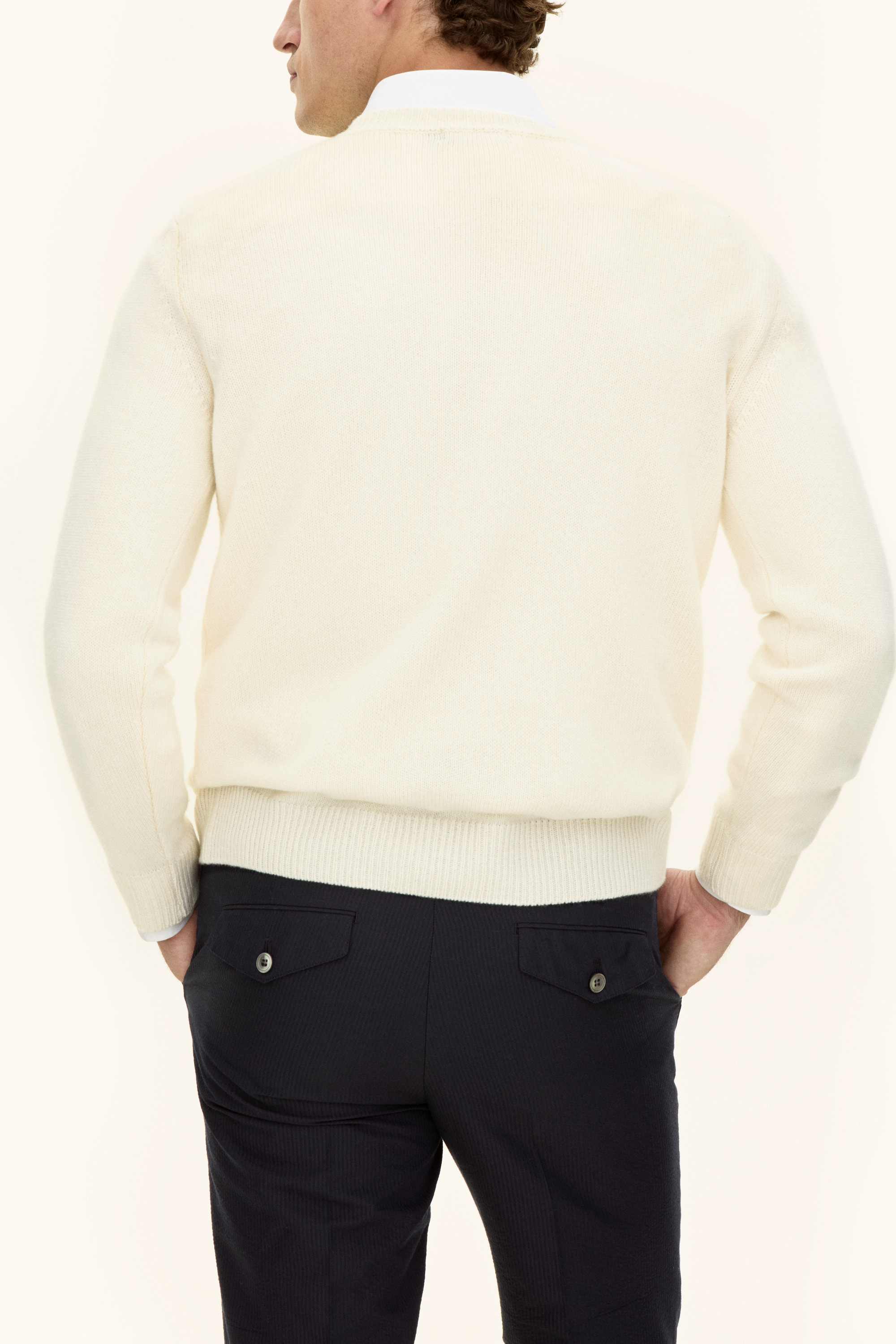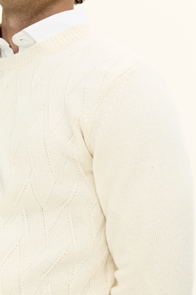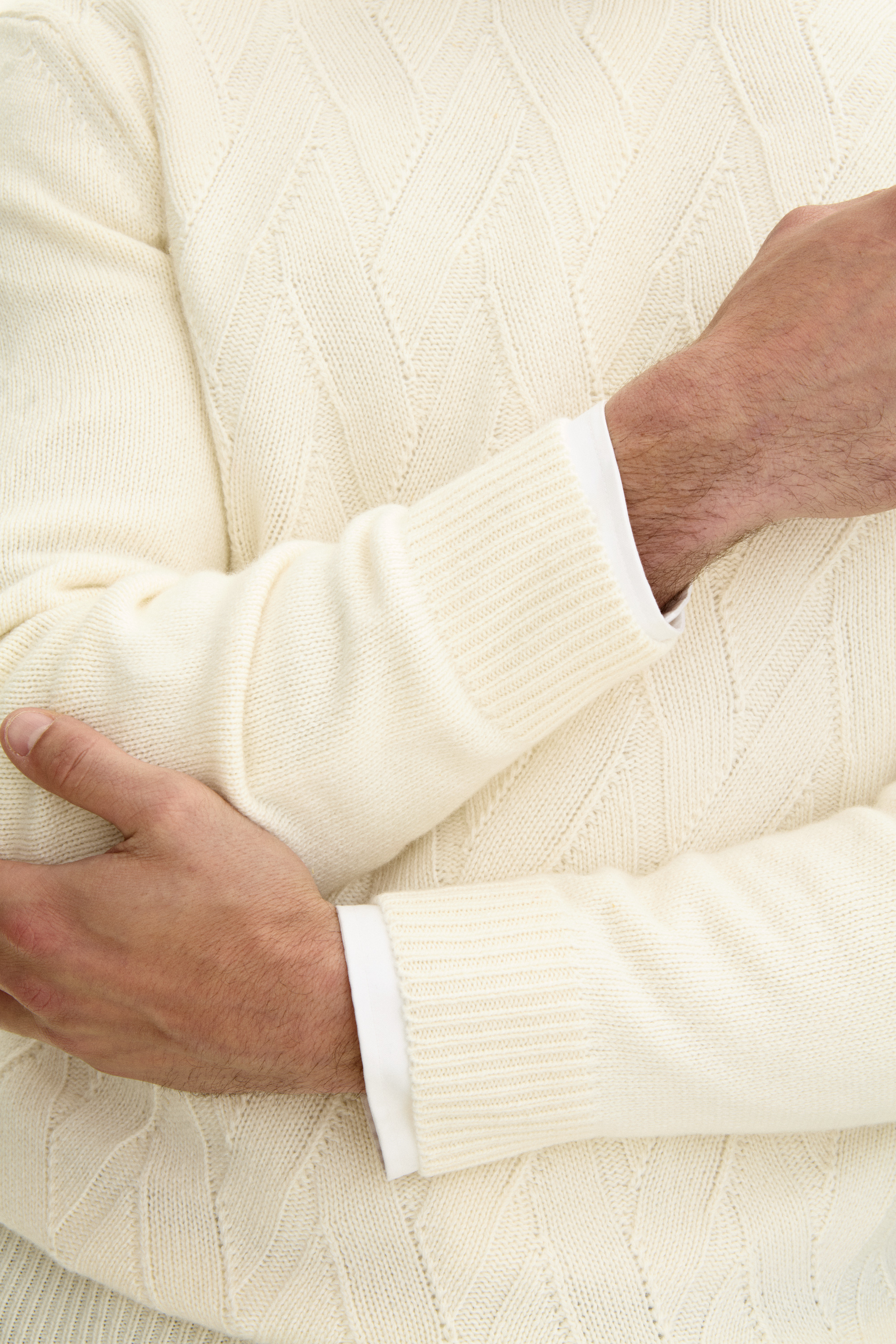 Genser med rund hals med unik struktur foran. Laget i en myk blanding av ull, kasjmir og viskose. Strikket i 7gg med 3-lags, som gir et sterkere plagg som er ideelt for kjølige høstdager.