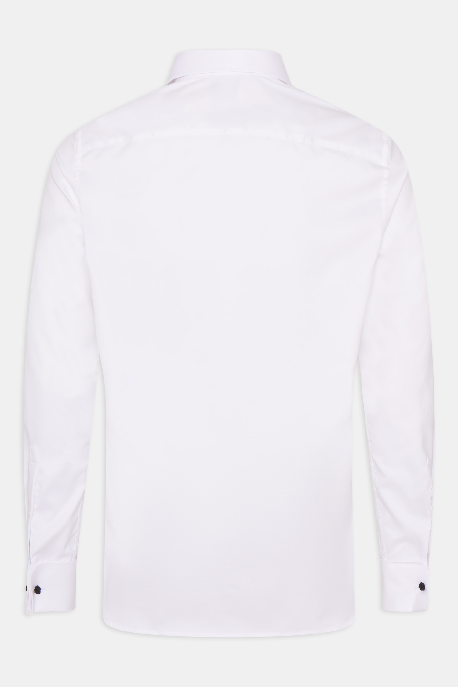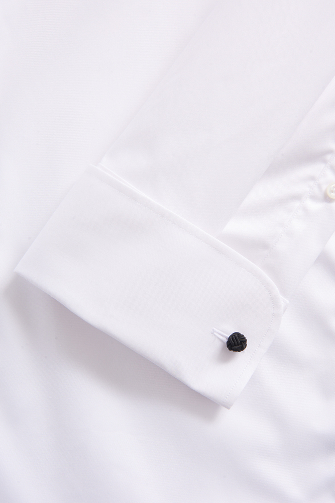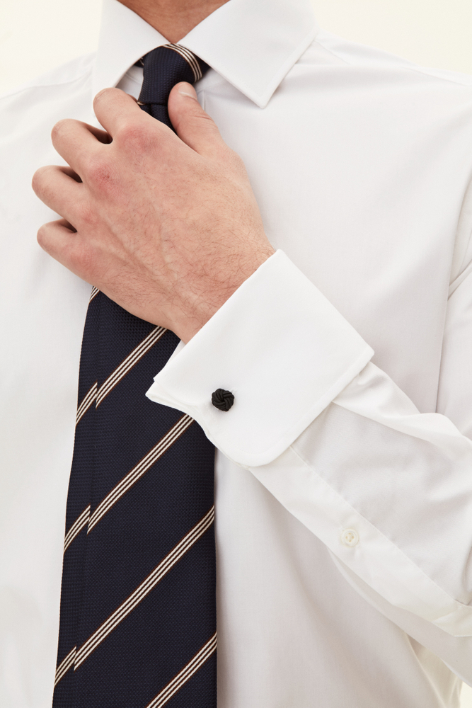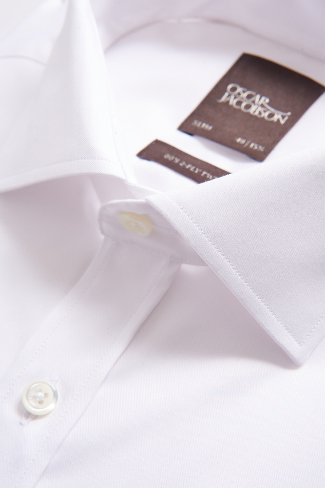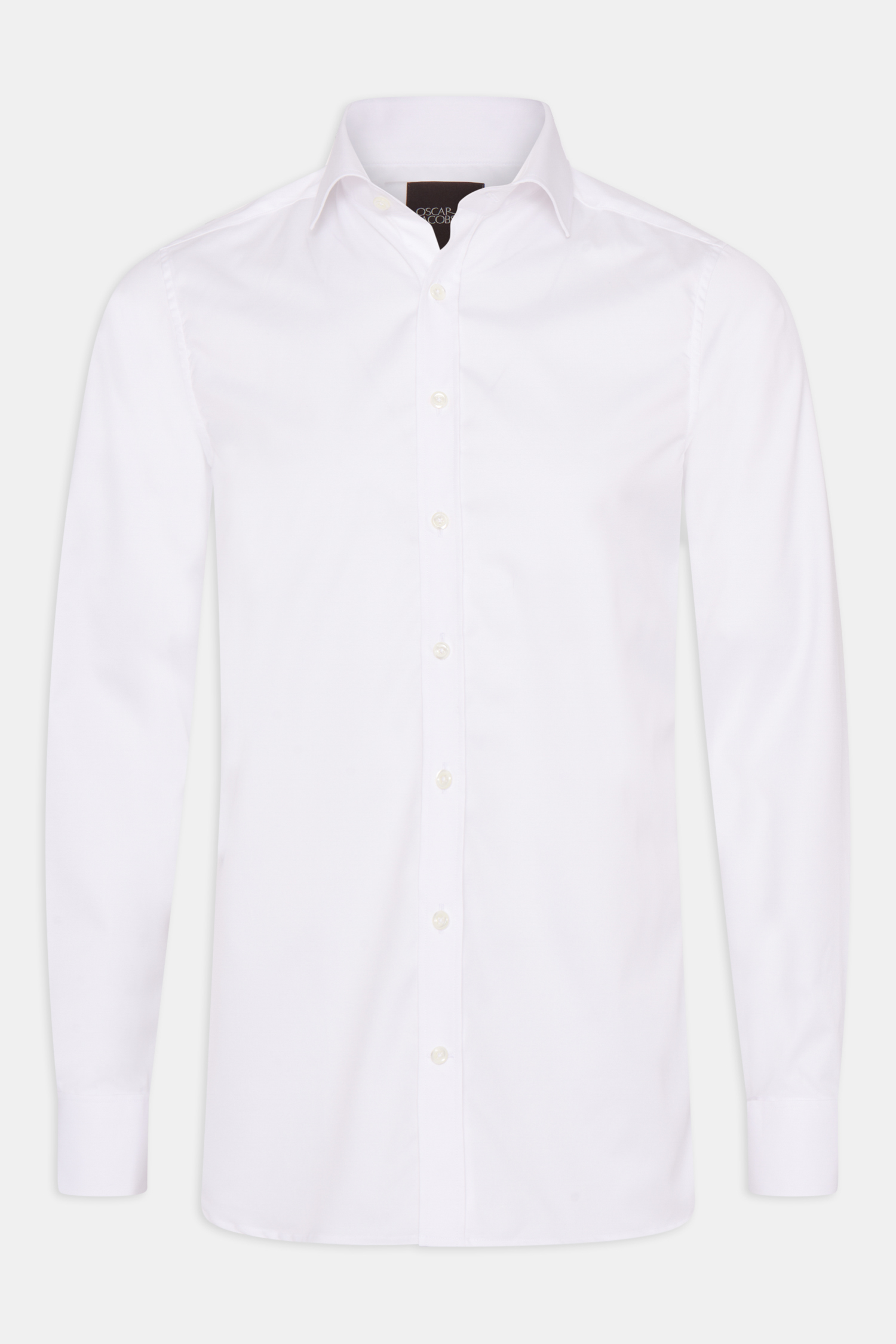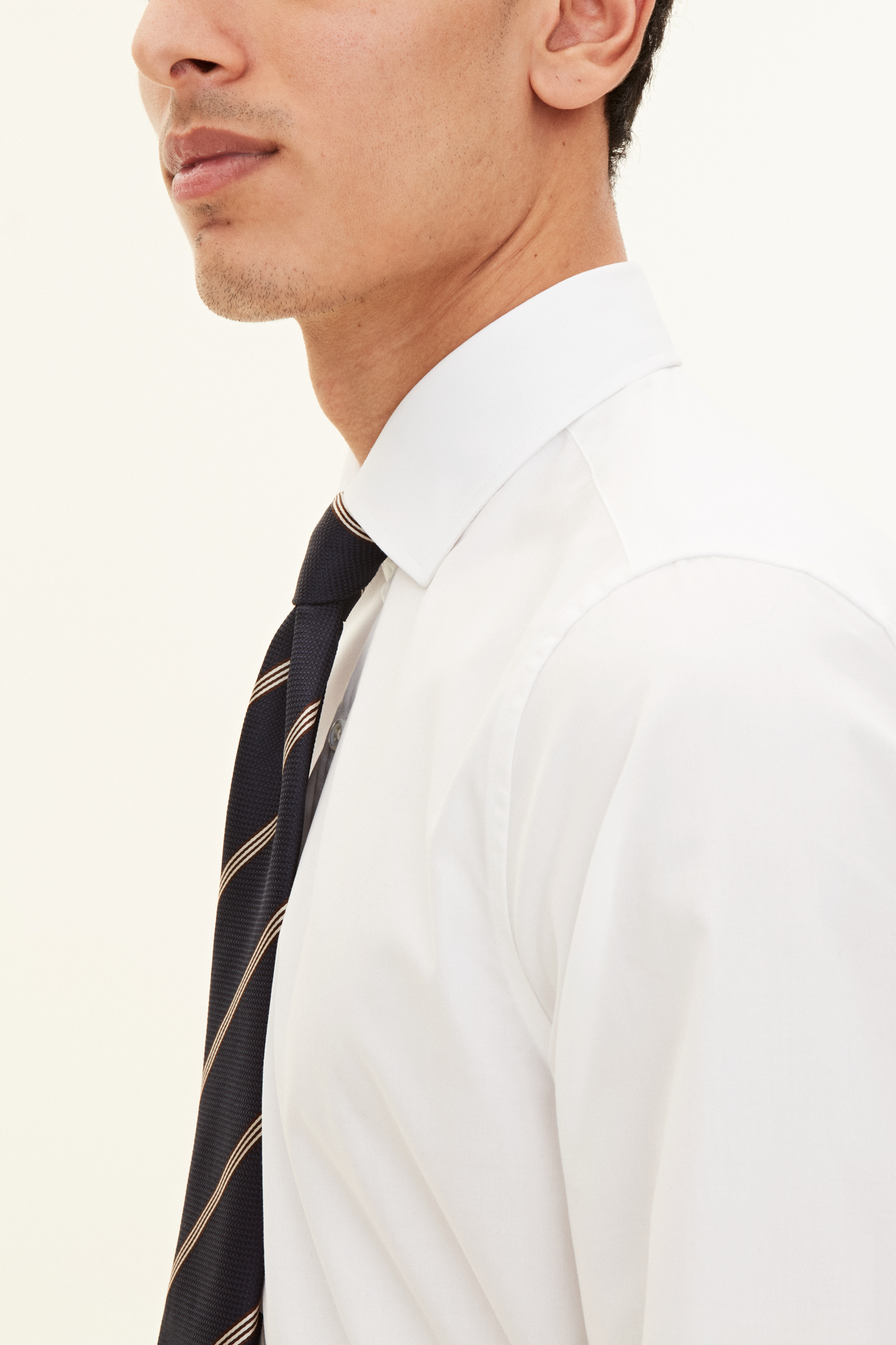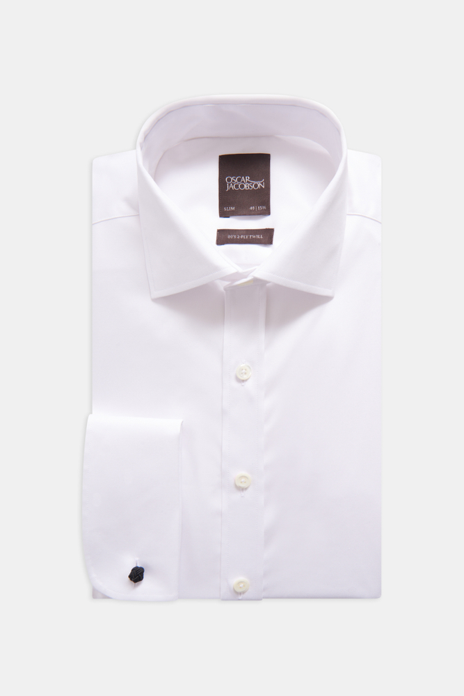 Business-skjorte i slim fit med doble mansjetter laget av myk og rynkeresistent bomullstwill. Den elegante semi cut away-kragen ser flott ut både med og uten slips.