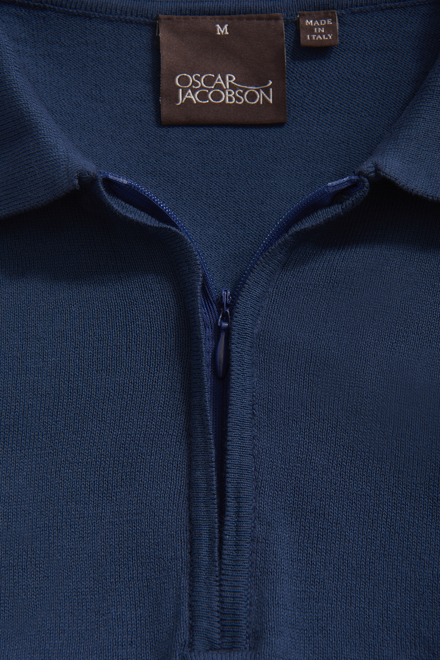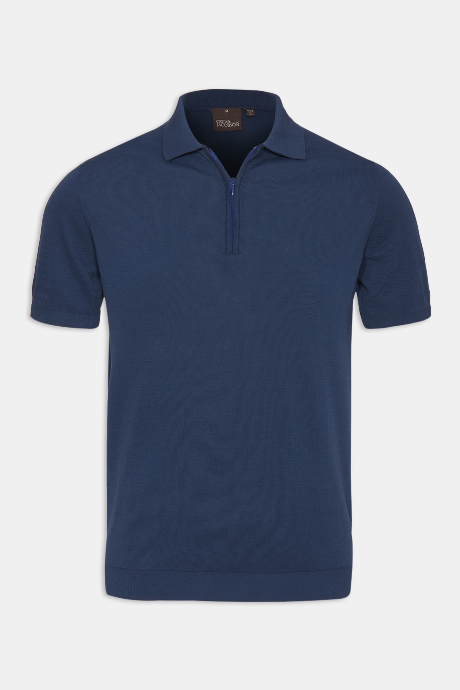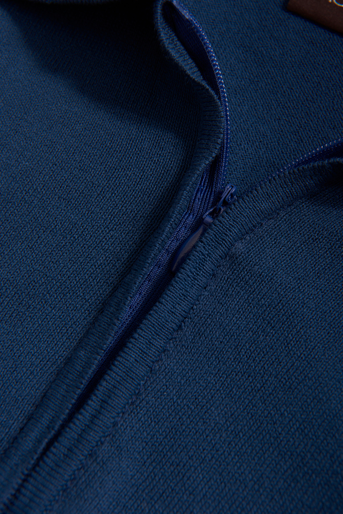 Kortermet genser med krage, laget av finstrikket økologisk bomull. Utstyrt med elegant glidelås i kragen.