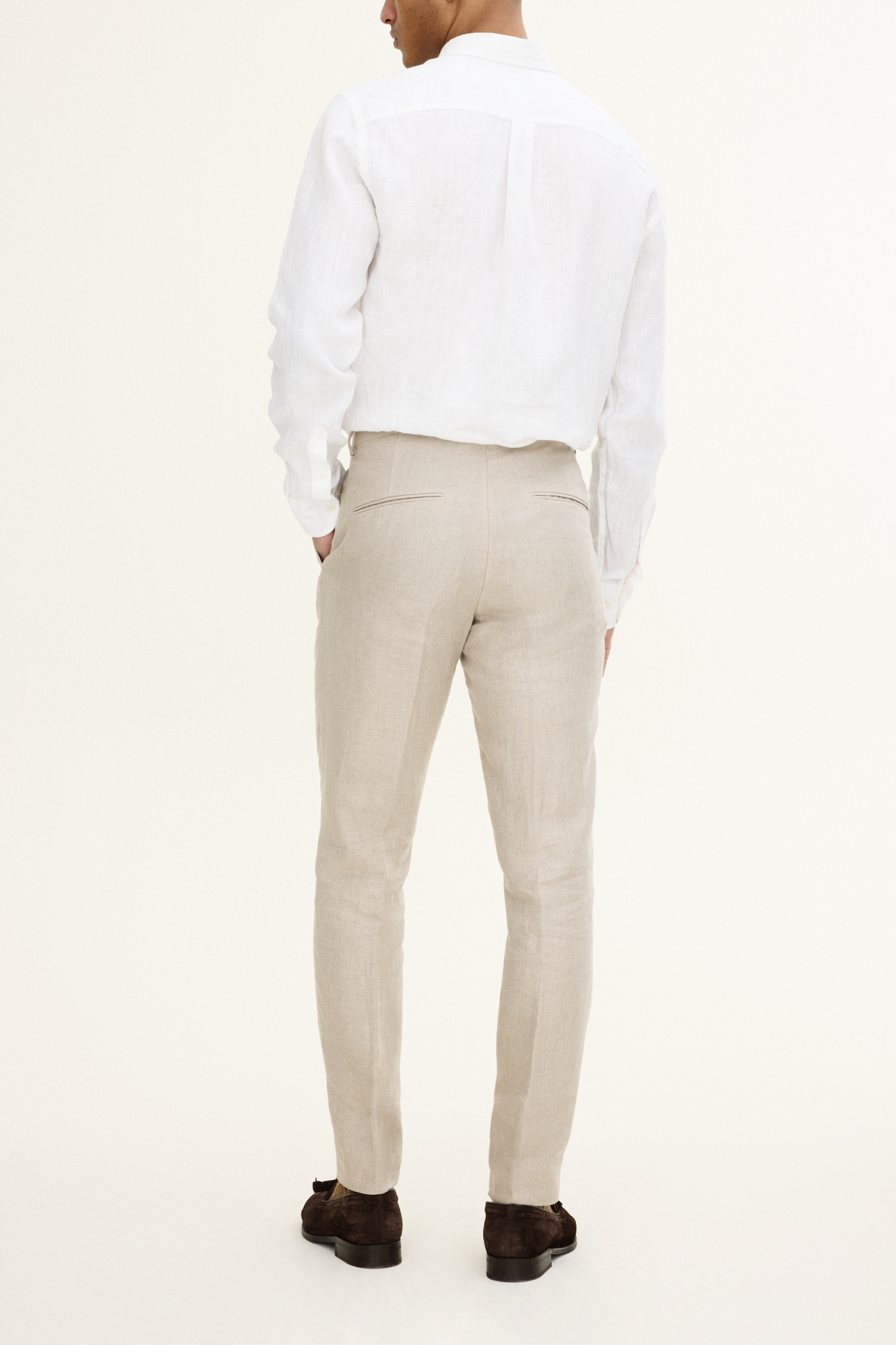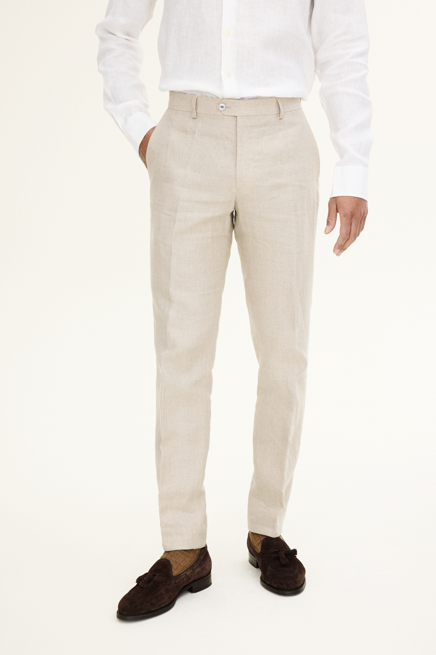 Bukse med en smal passform og normalhøy midje, beltehemper og avsmalnende ben. Laget av et tynt linstoff.