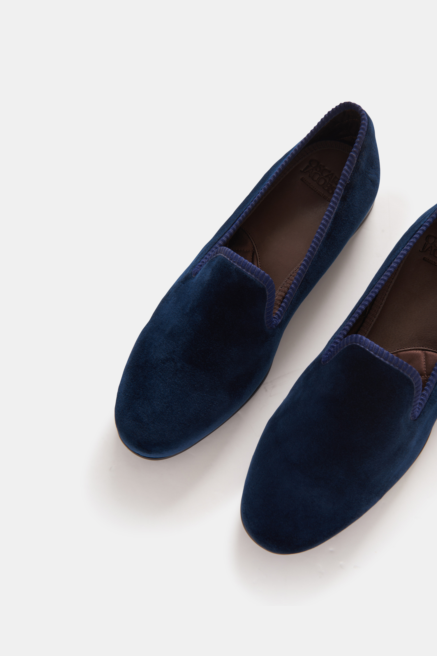 Håndlagde fløyelstøfler med yttersåler i lakket skinn til din smoking. Skoene er utstyrt med vattert innerfôr i sateng samt en myk dempende innersåle i memory foam, for en personlig og behagelig passform.