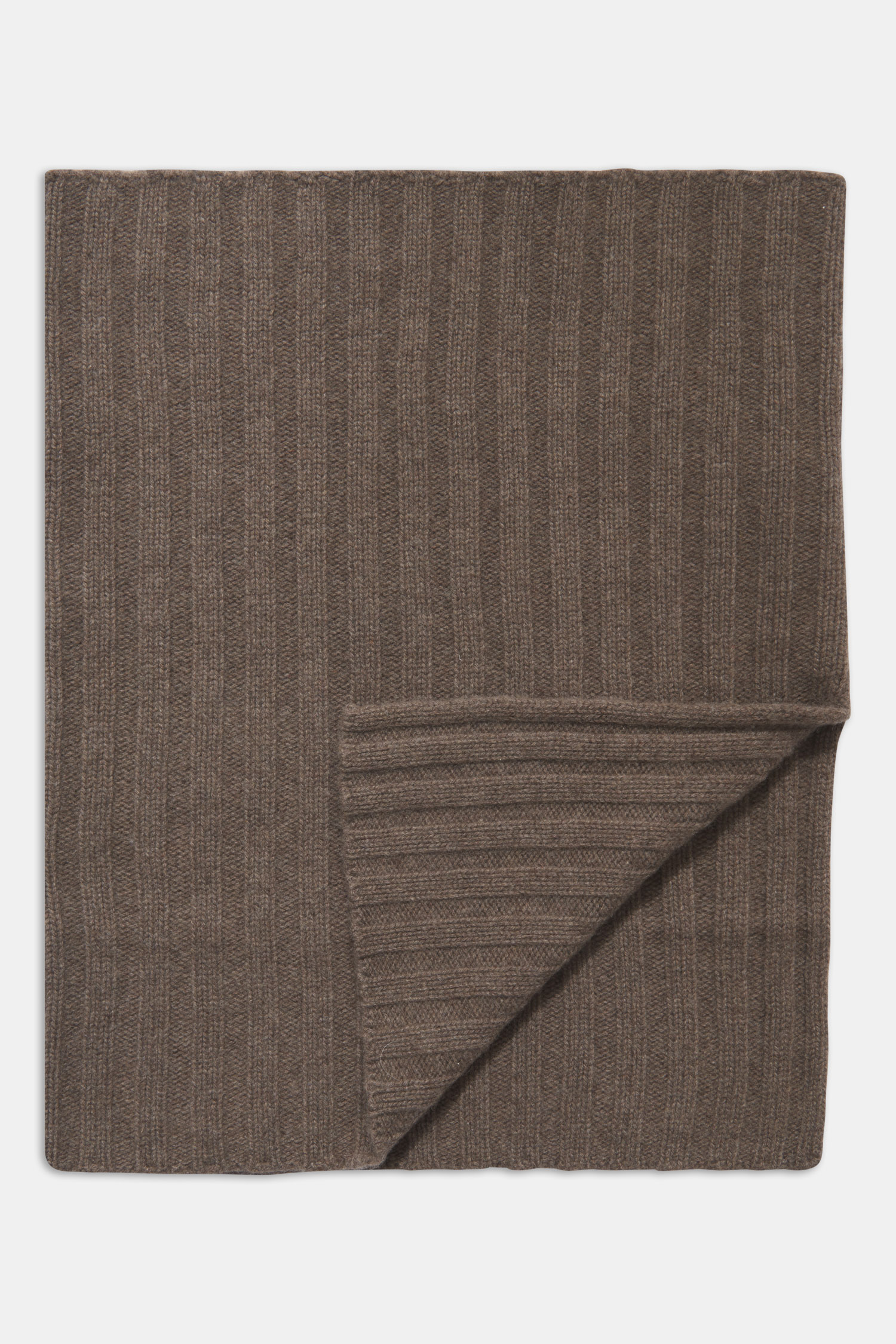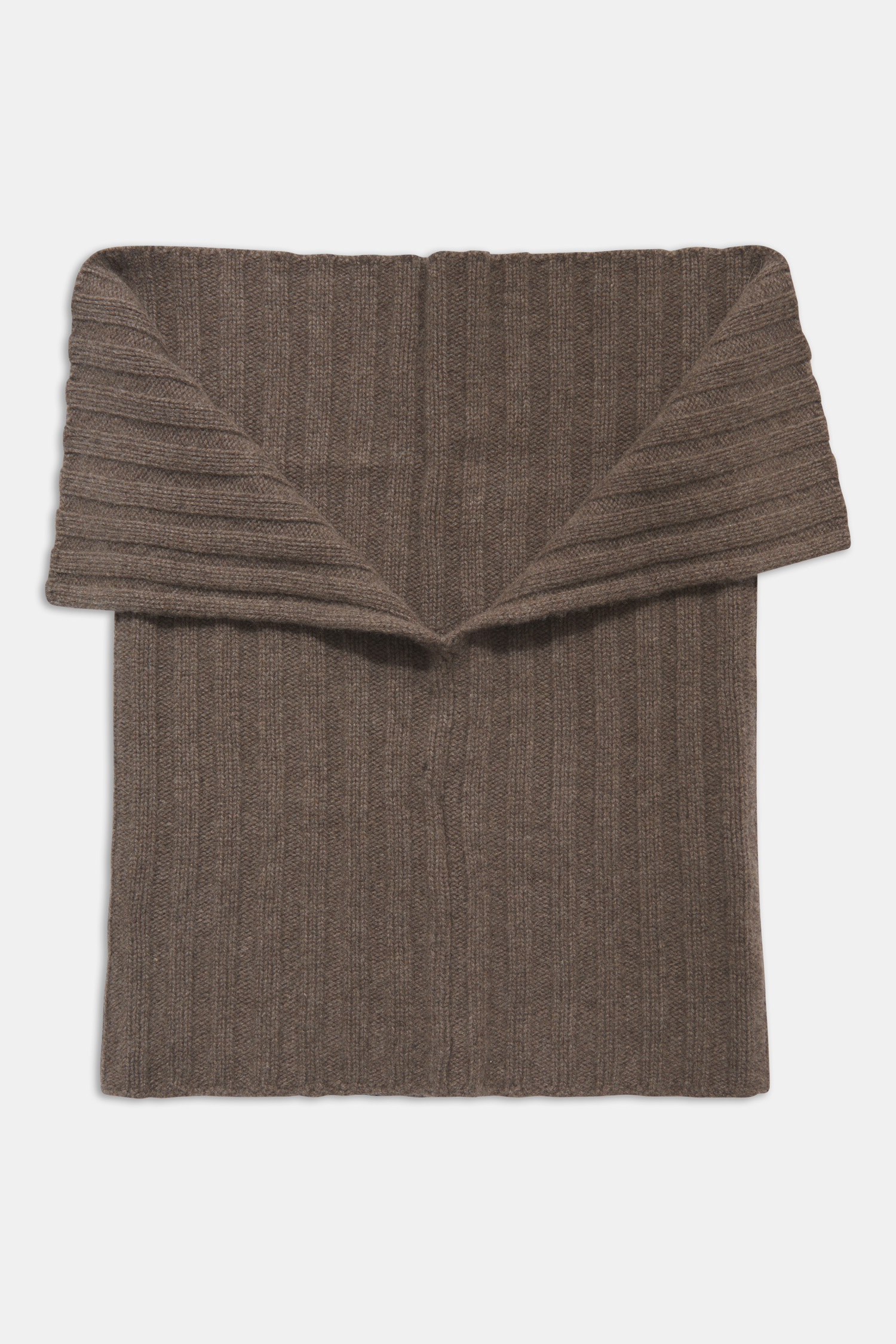 Ribbet skjerf i kasjmir. Skjerfet er sydd sammen og kan trekkes over hodet.