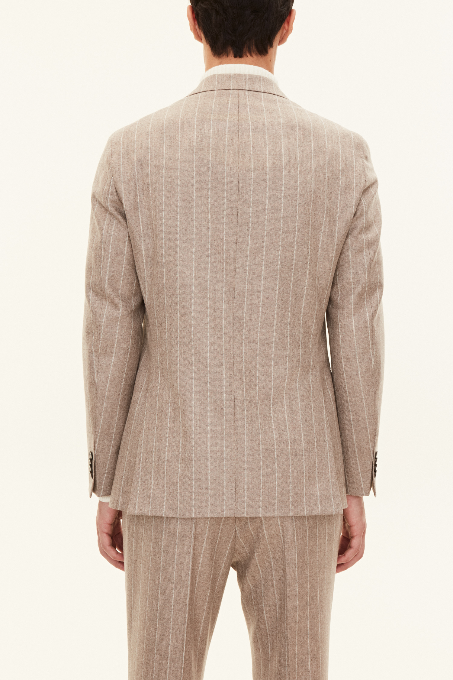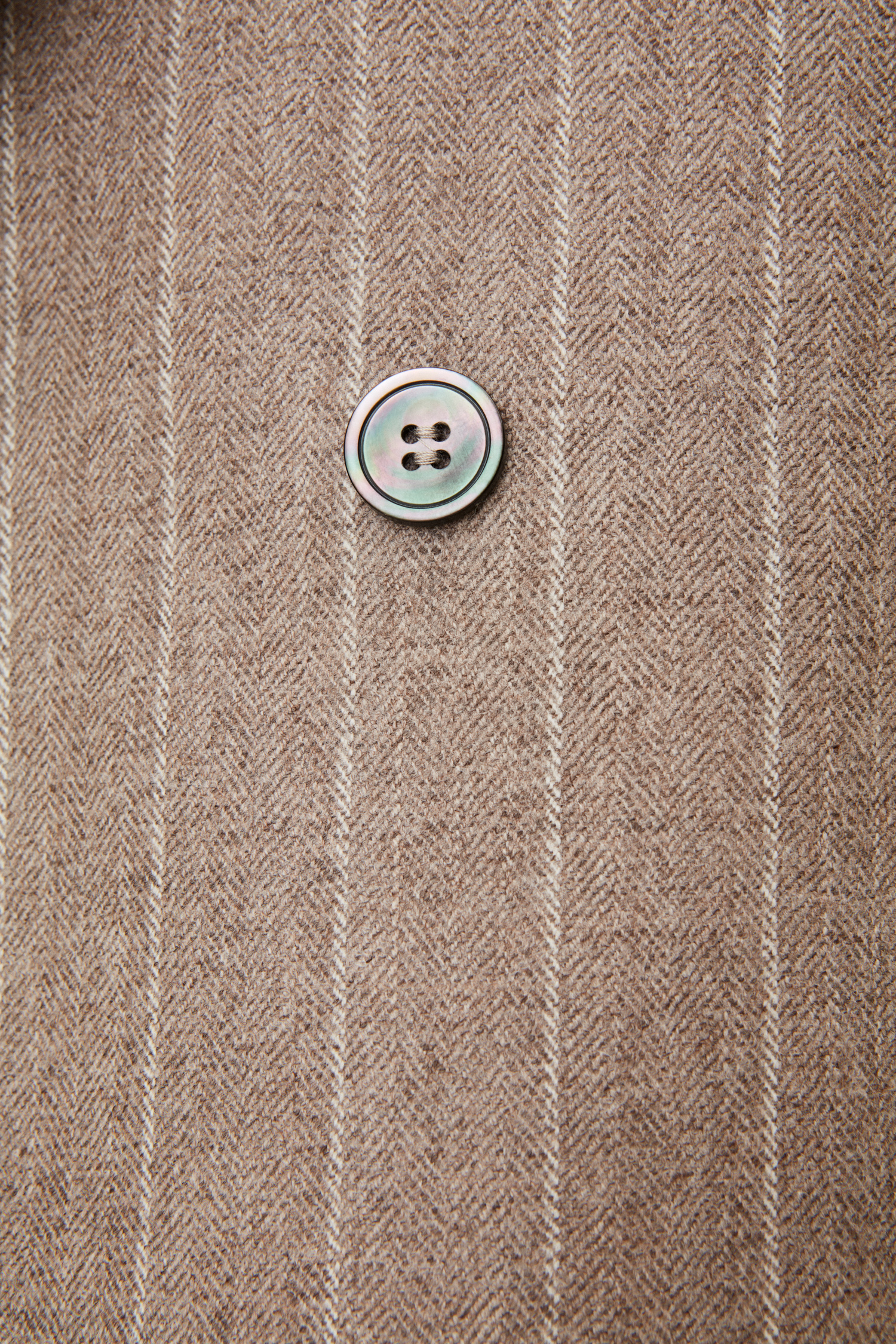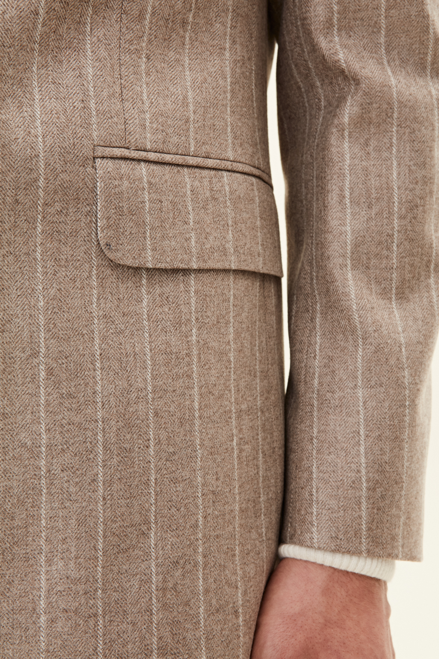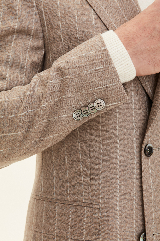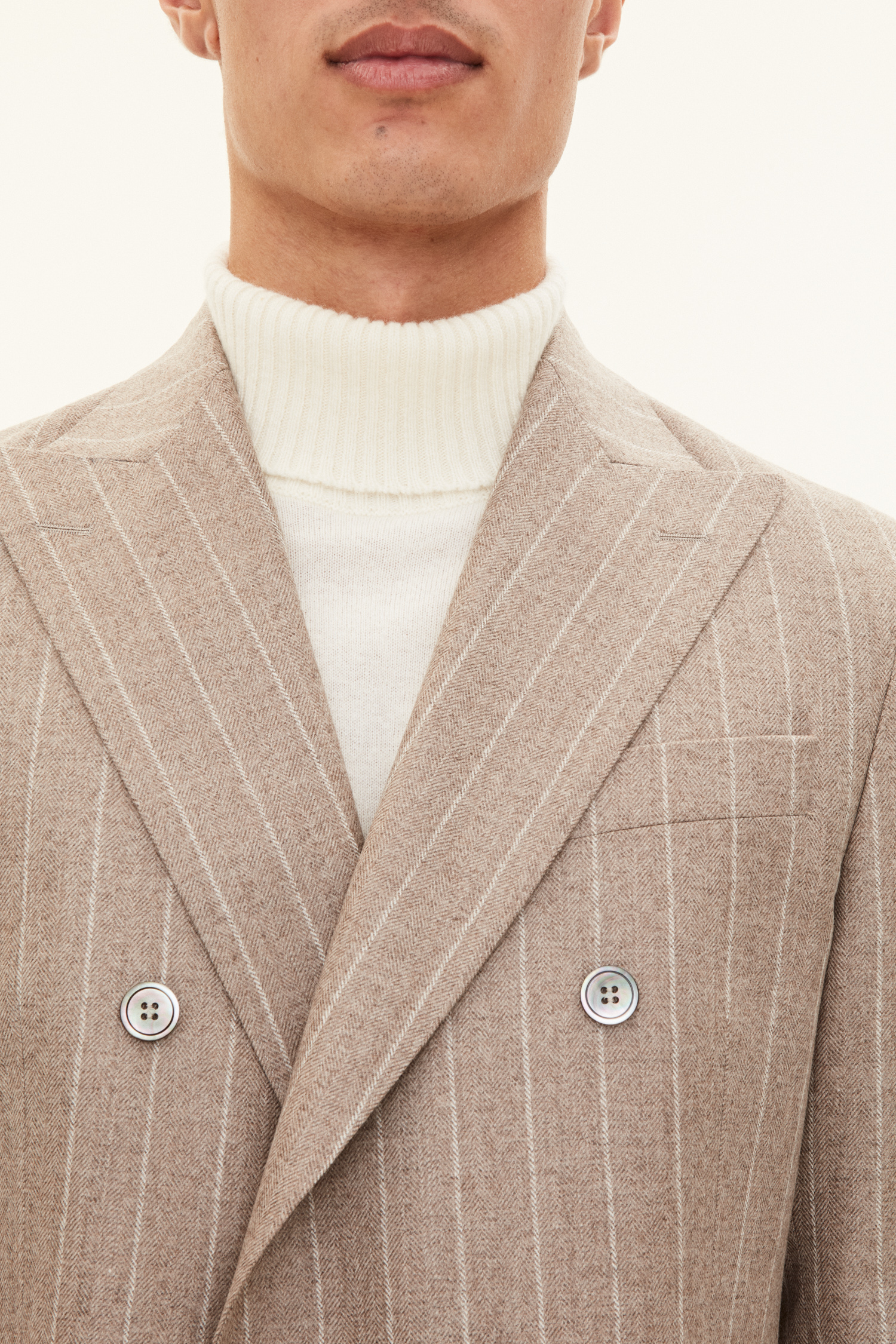 Farris-kavajen är en dubbelknäppt modell med spetsiga slag och fickor med lock, tillverkad i ett ljusbeige tyg med klassisk fiskbensdesign och benvita ränder. Tyget består av 100% Superfine Merino Wool "Zelander", vilket ger exceptionell mjukhet och hållbarhet. Zelander-ullens släta och fina fiberstruktur ger en lyxig känsla mot huden, och kavajens helfodrade design gör den både funktionell och elegant. Detta tidlösa plagg passar för både formella och avslappnade tillfällen.