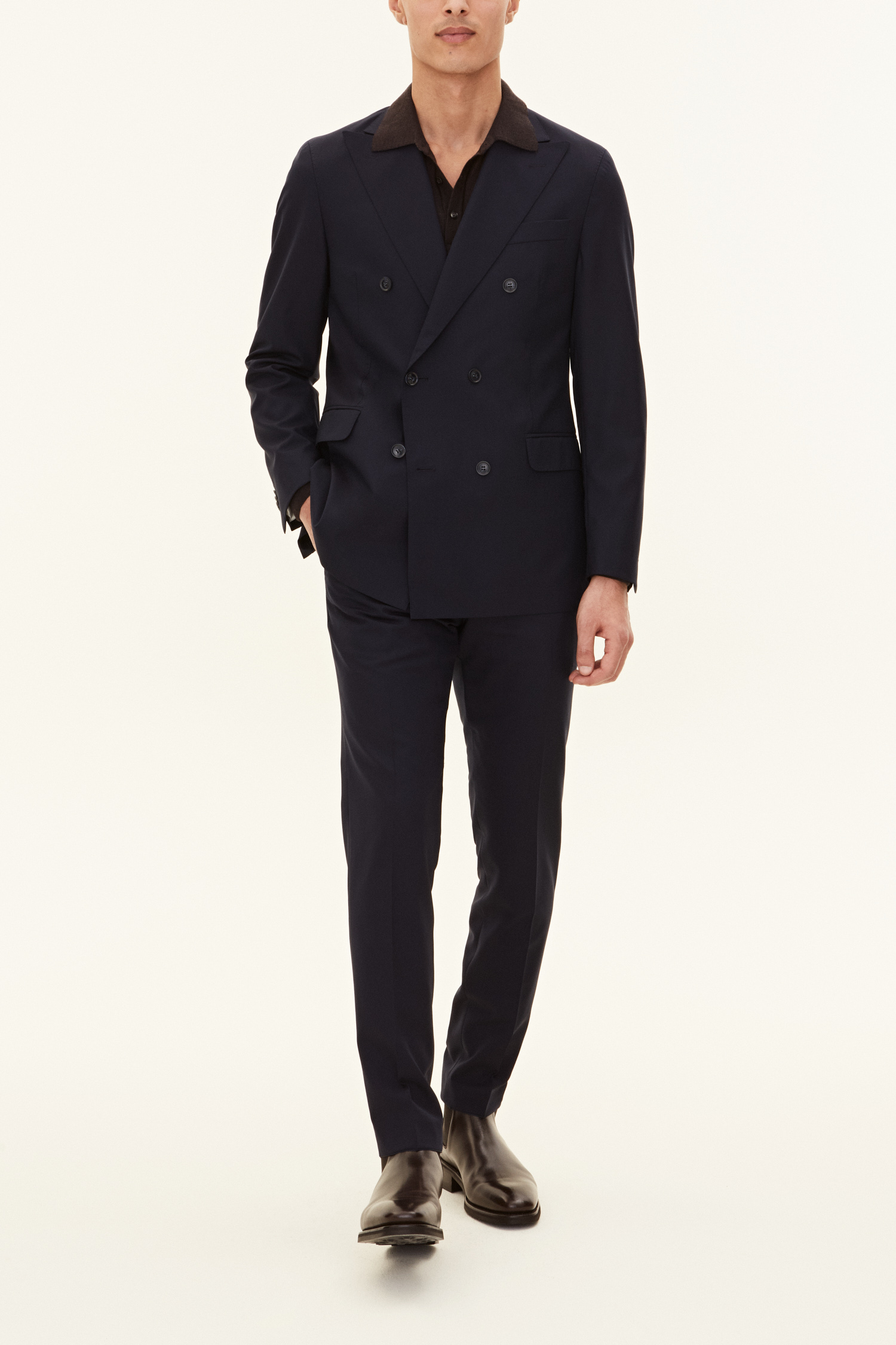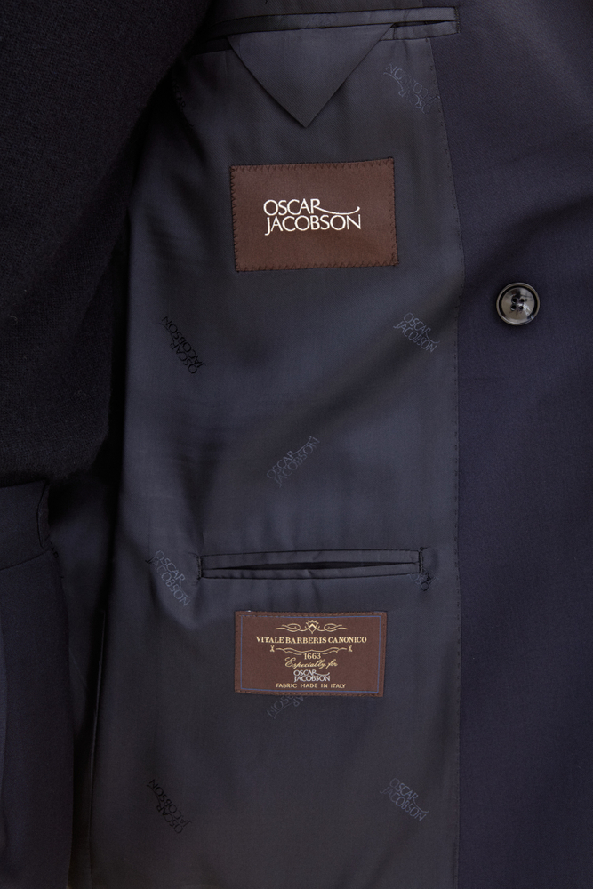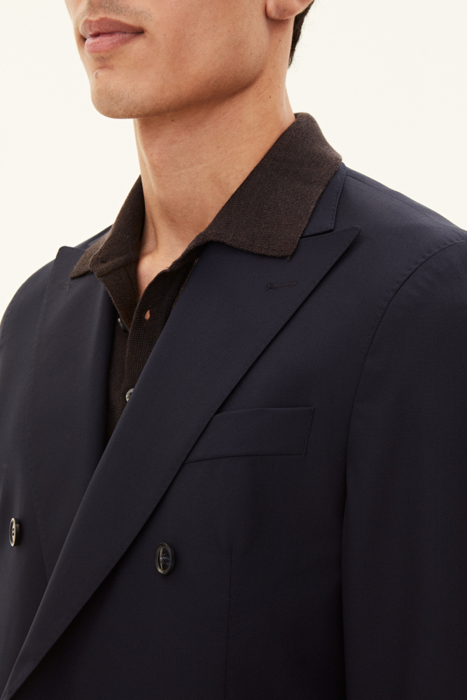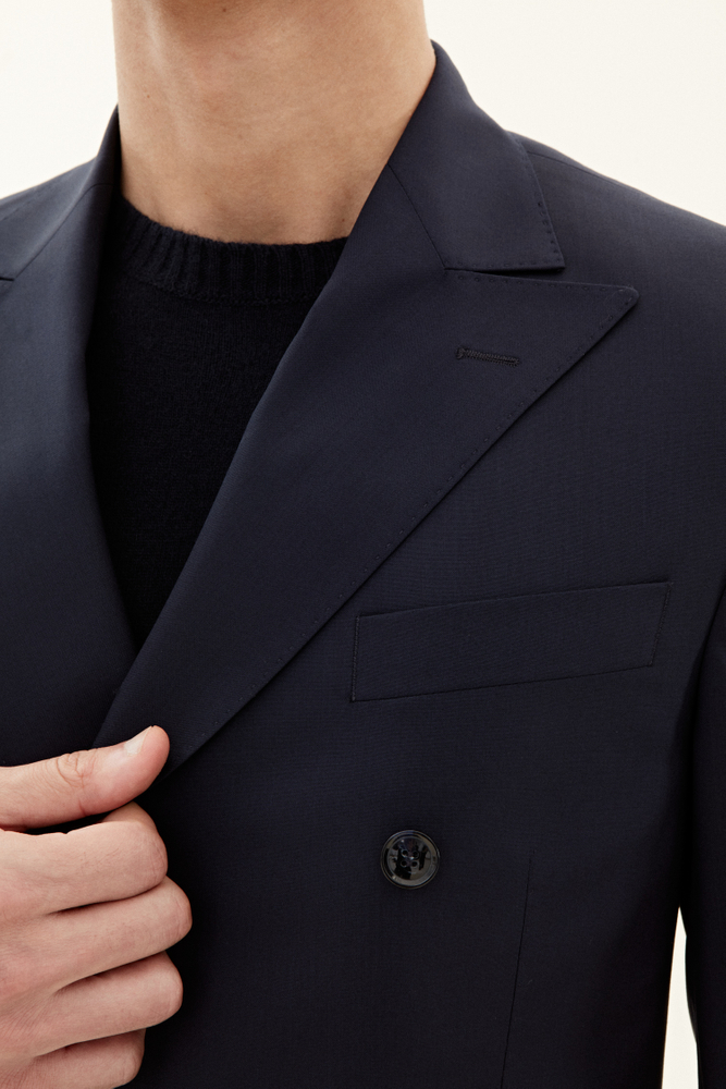 Klassisk dubbelknäppt kavaj i normal passform med spetsiga slag och mjuk konstruerad axel. Tillverkad i slät Super 120’S ull.