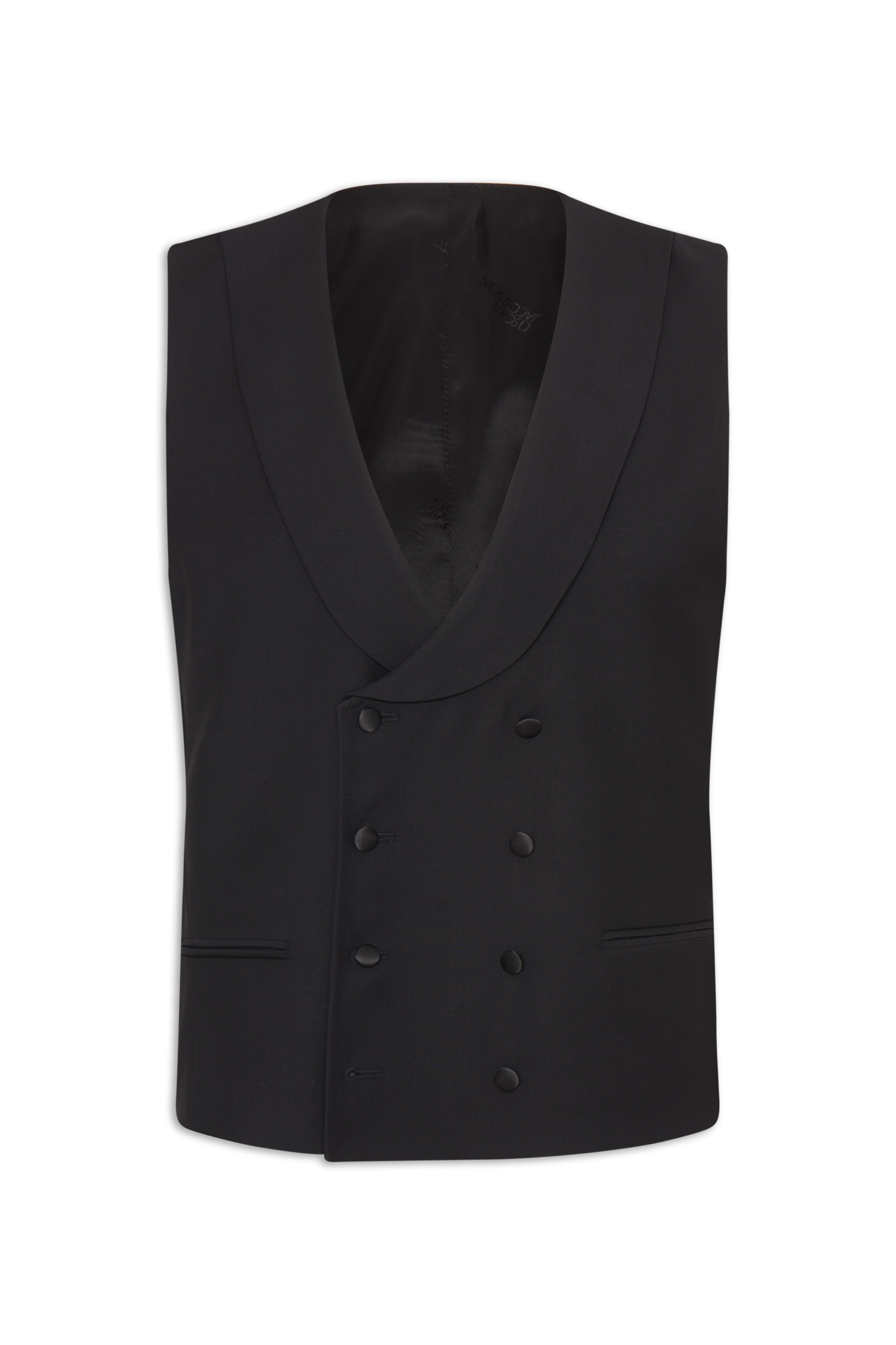 Dubbelknäppt smokingväst med sidenklädda knappar, framtagen i 100% ull.