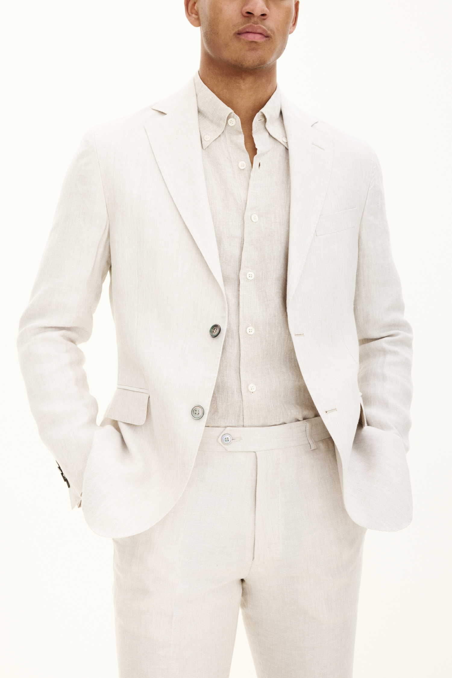Enkelknäppt kavaj med halvfodrad insida och ett mjukt konstruerat axelparti som bidrar till ökad komfort och ett ledigare uttryck. Här i vårt populäraste italienska linnetyg.