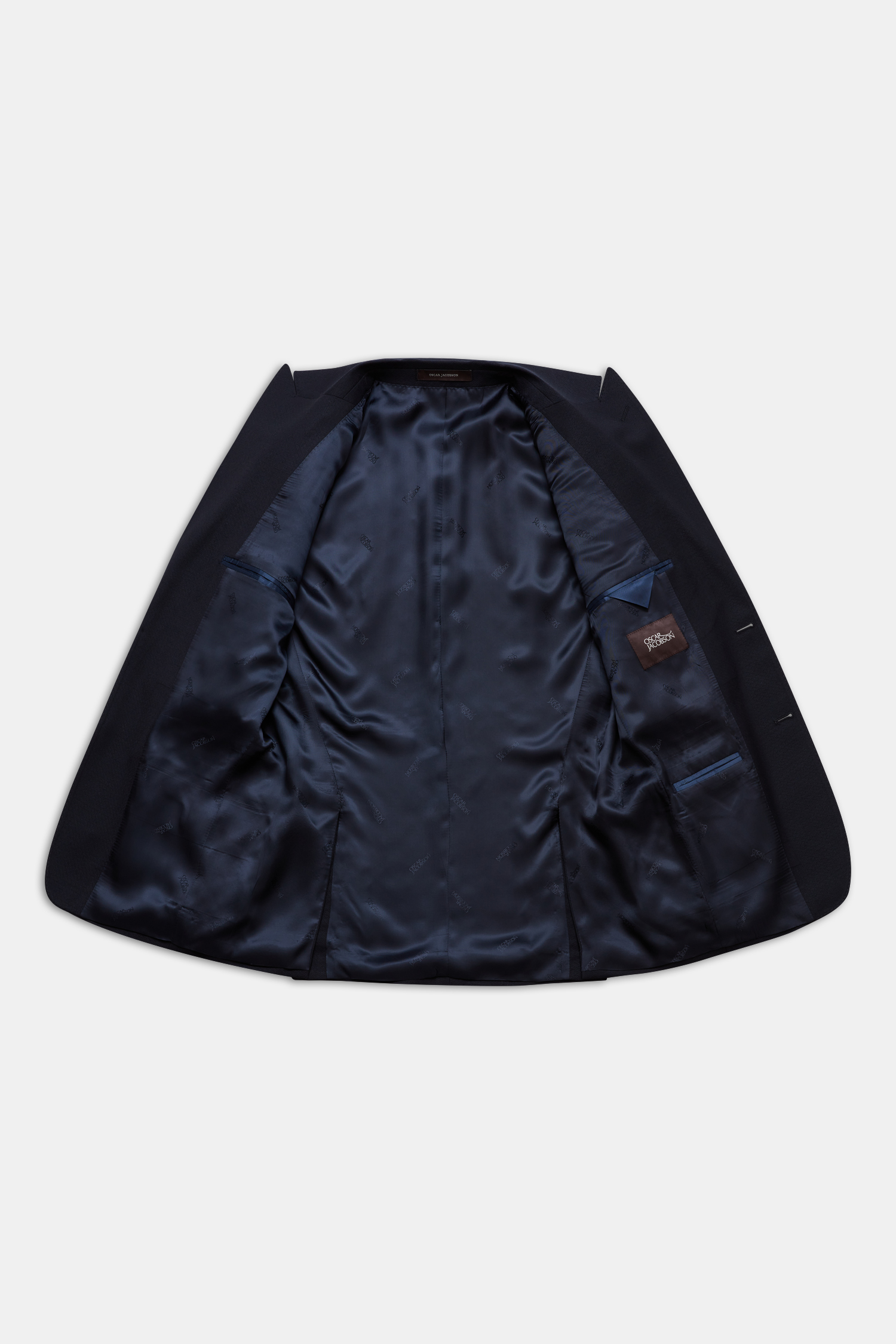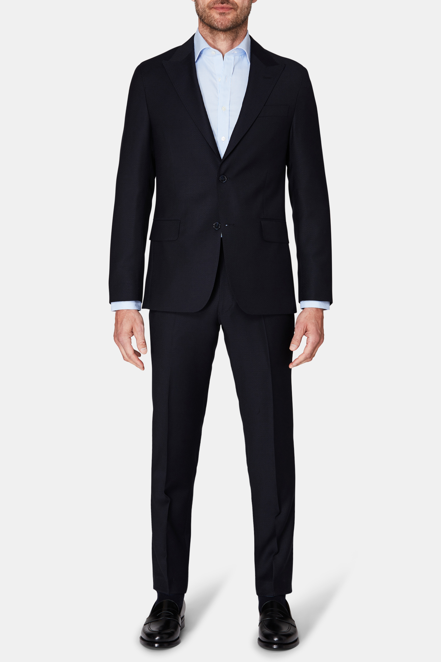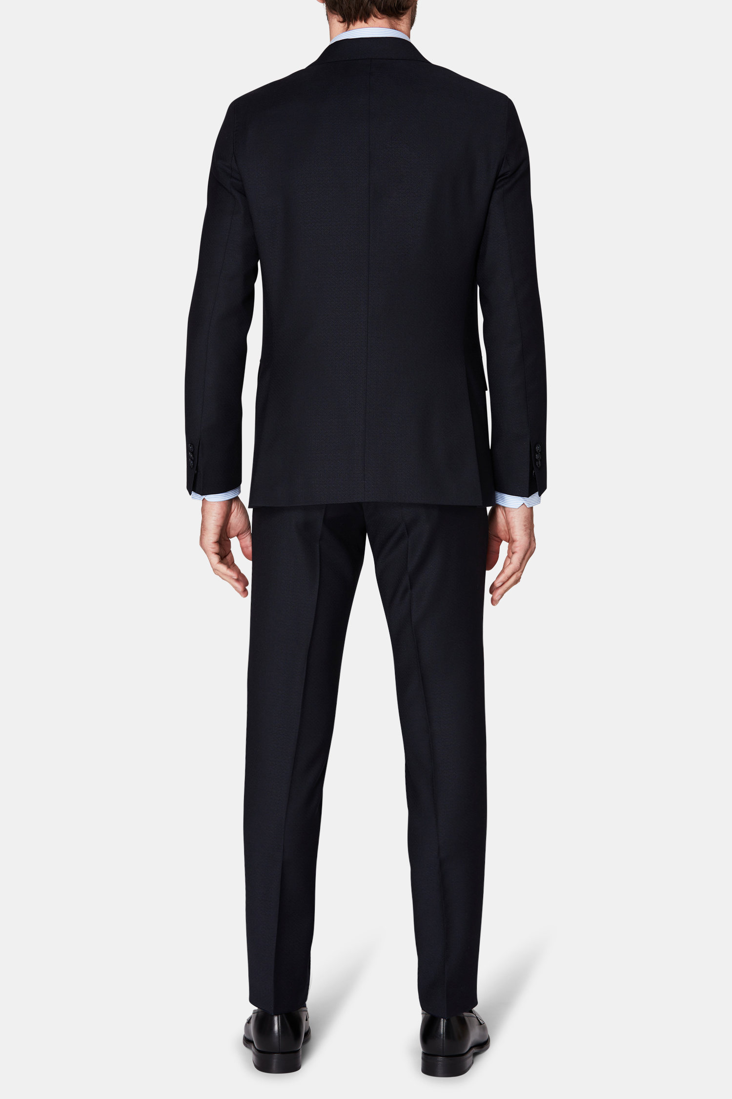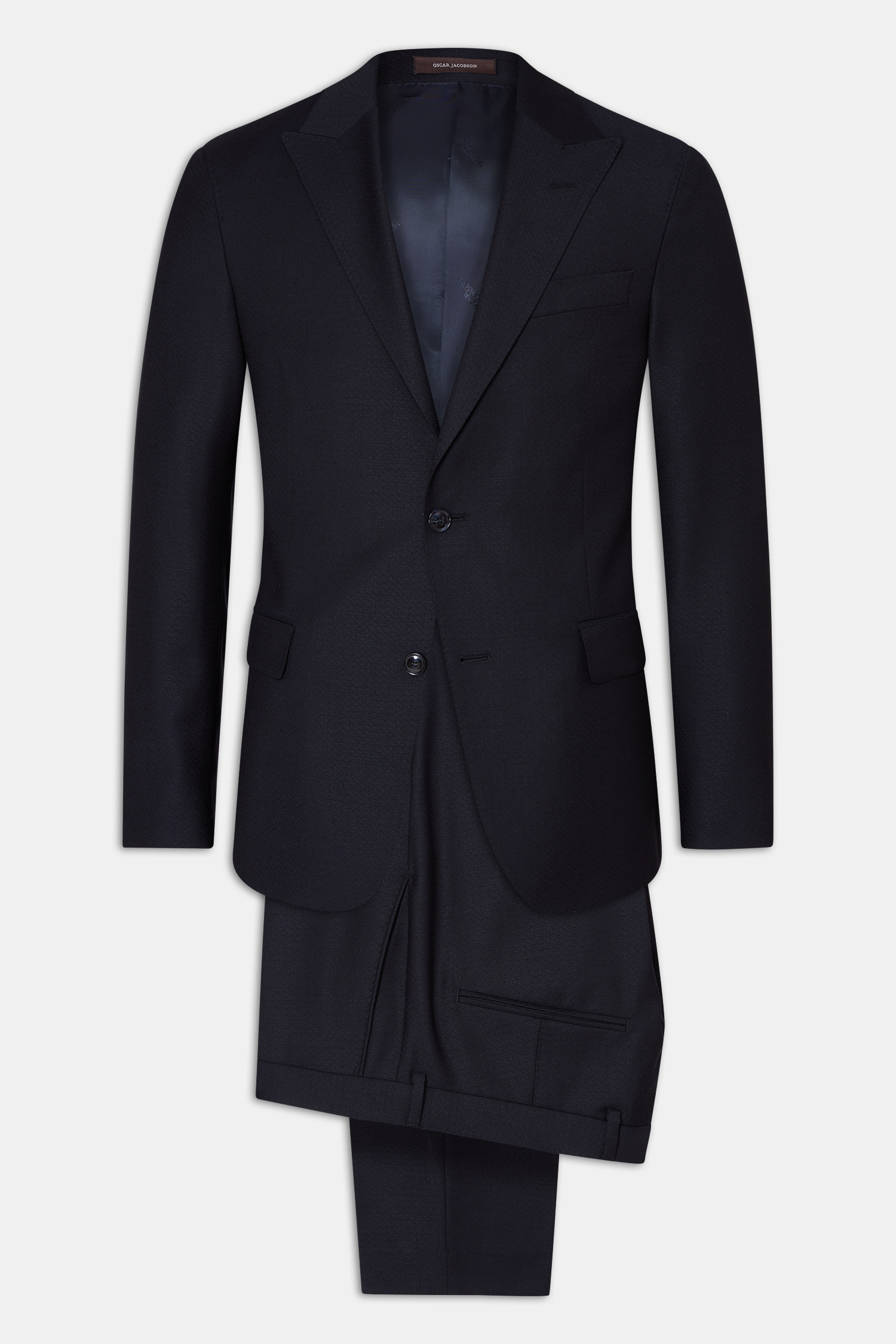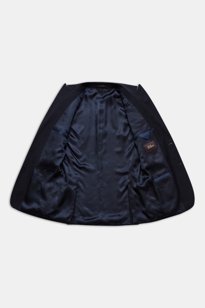 Helfodrad kostym med spetsiga slag i regular fit. Mjukt konstruerat axel- och bröstparti. Tillverkad i 100% ull med diskret mikrostruktur.