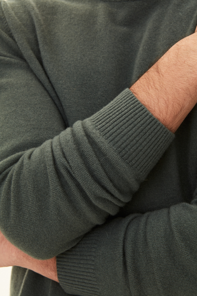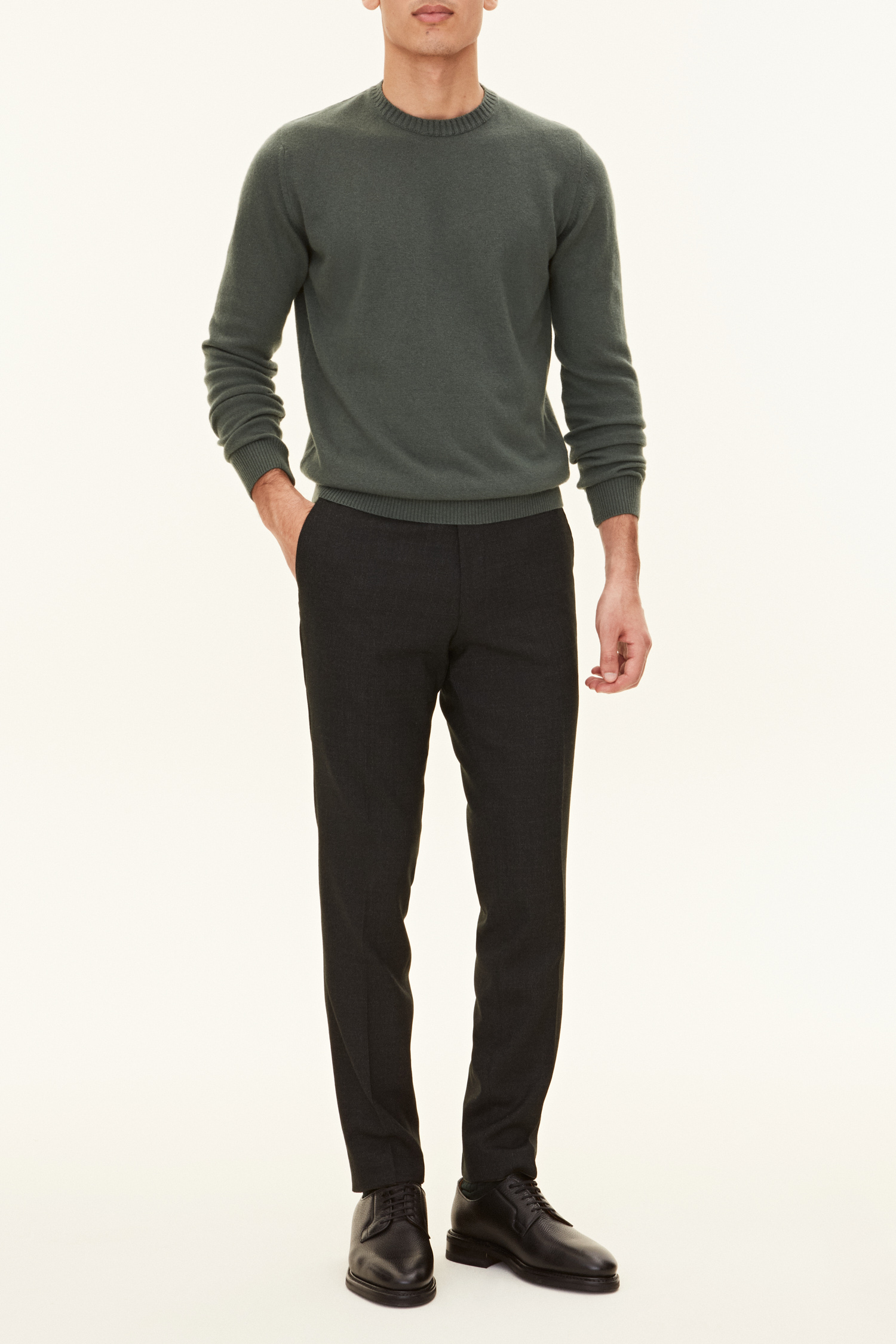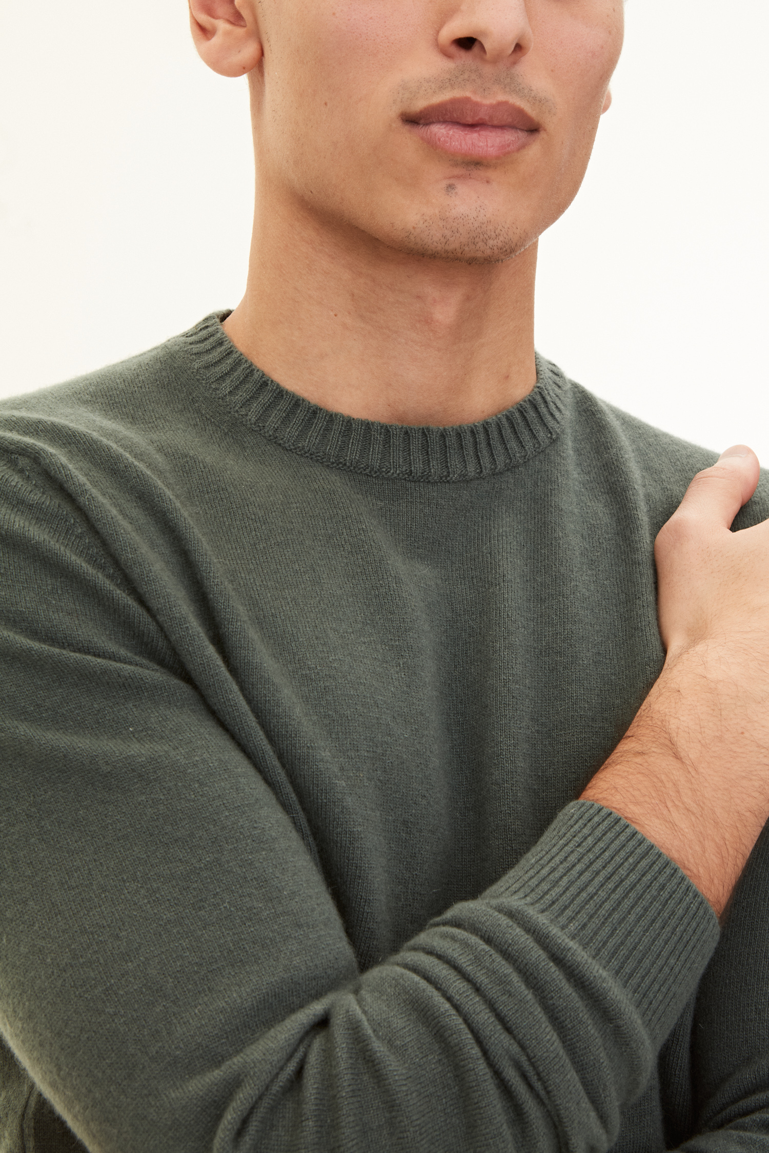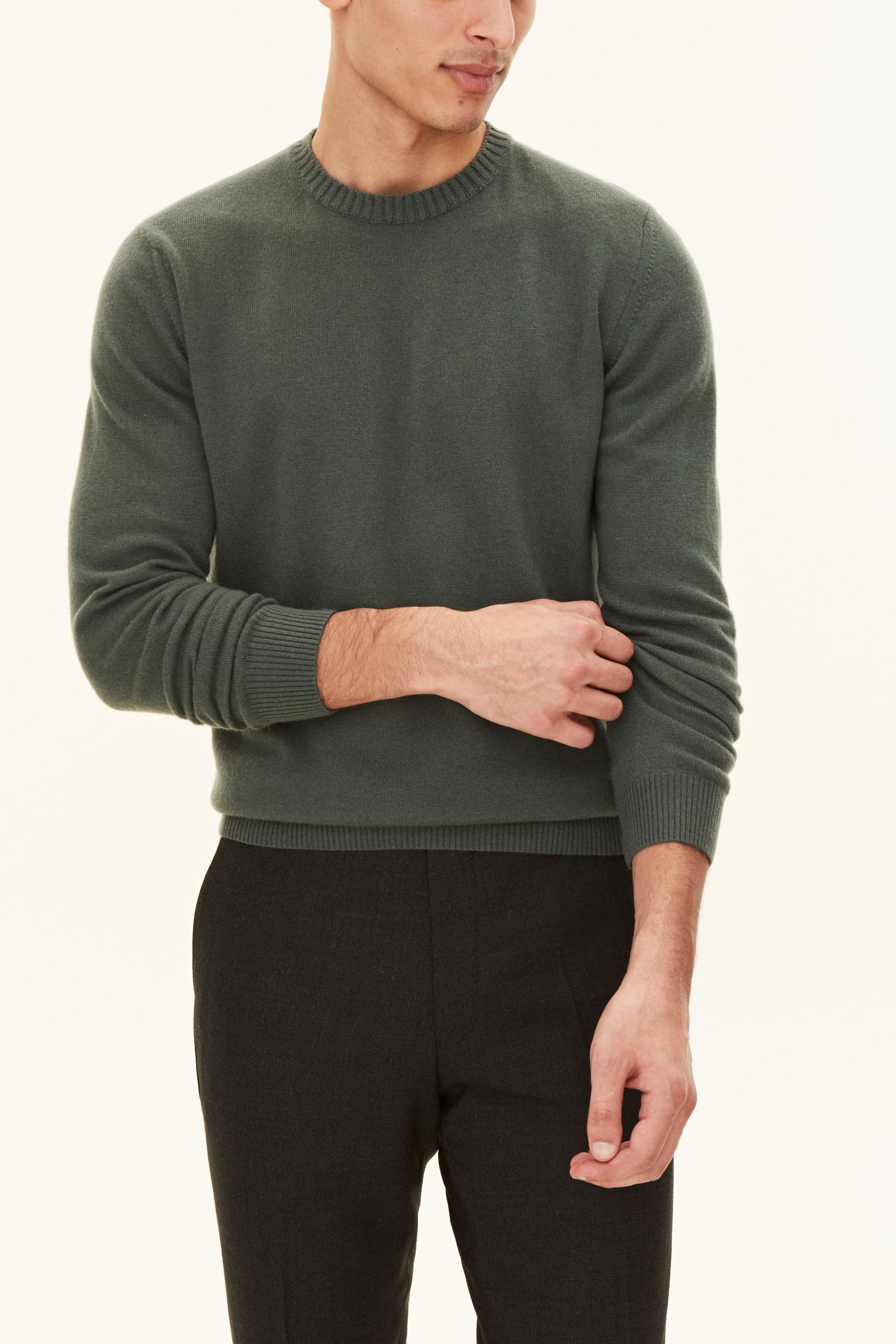 Rundhalsad tröja med ribbstickad krage tillverkad i 12gg ull, kashmir och viskos. Ett perfekt basplagg som kan matchas med det mesta i garderoben.