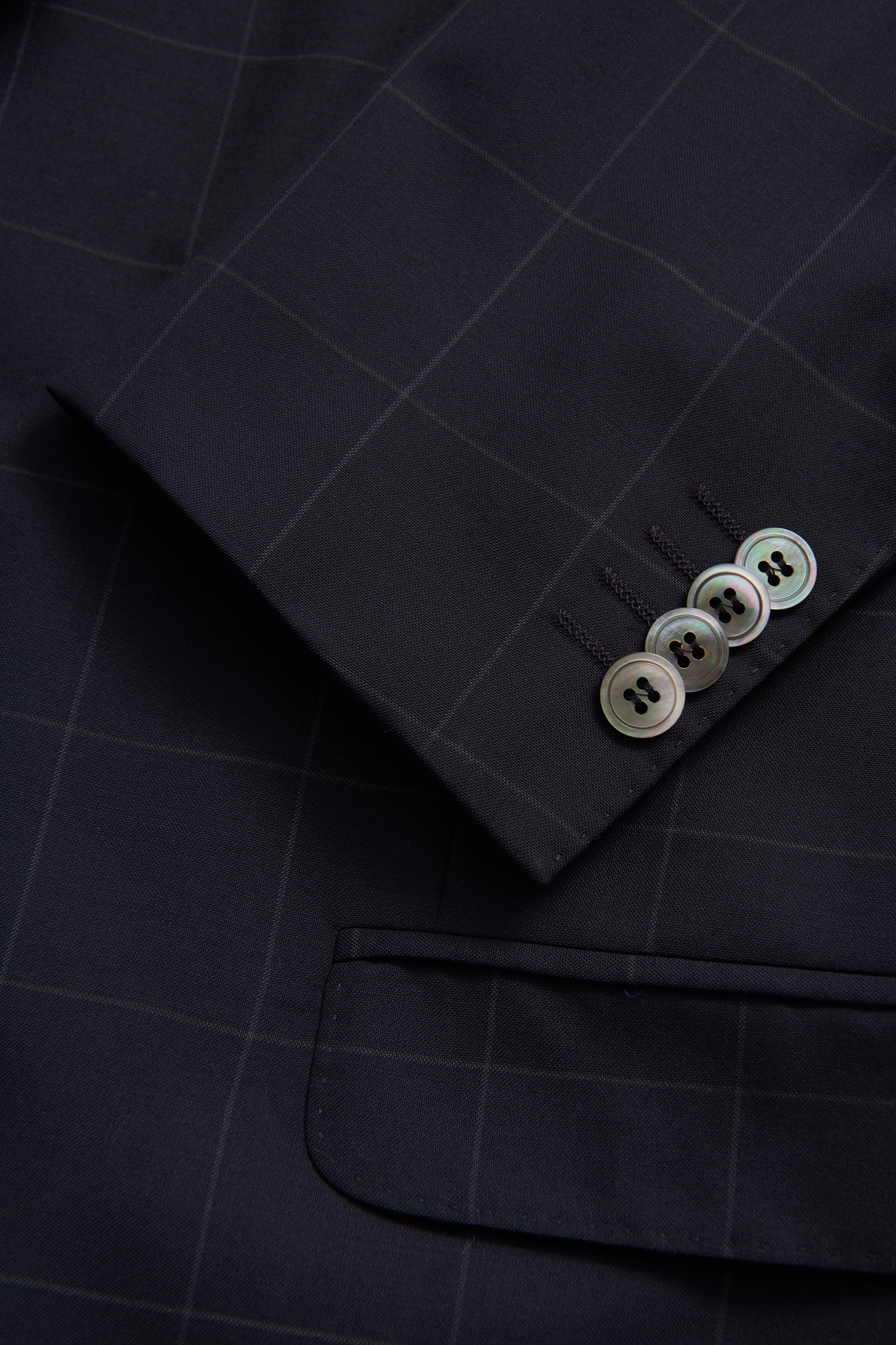 Formell kostym med mjuk uppbyggd axel, helfoder och rak siluett.