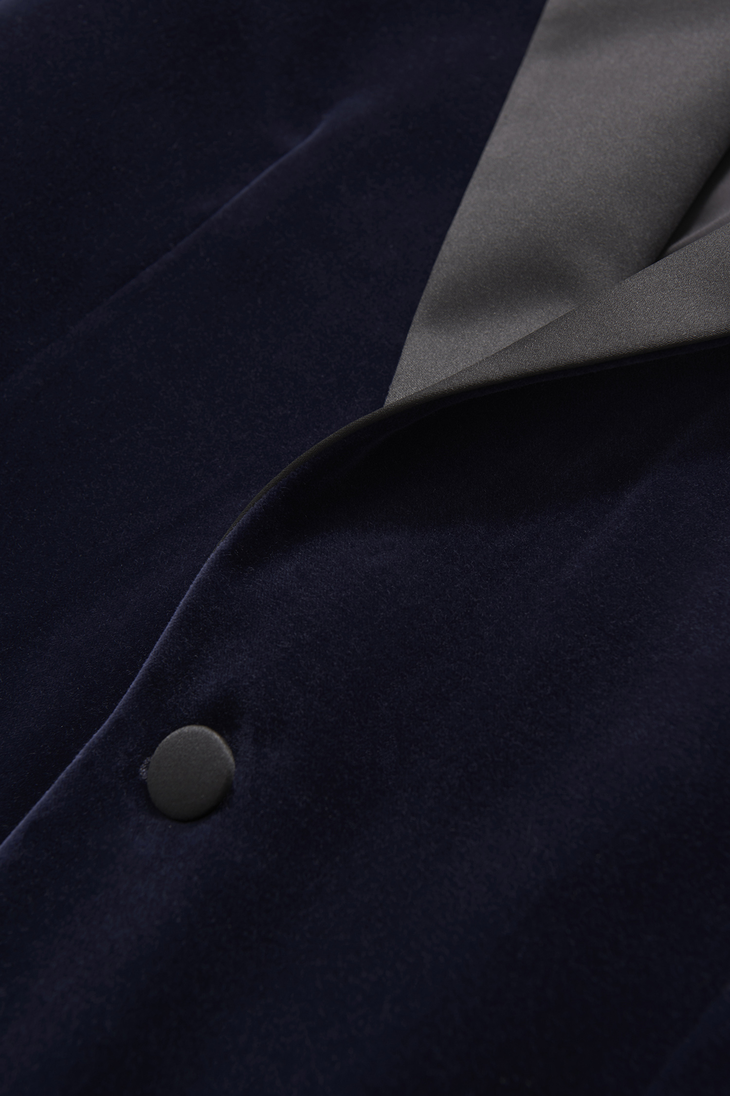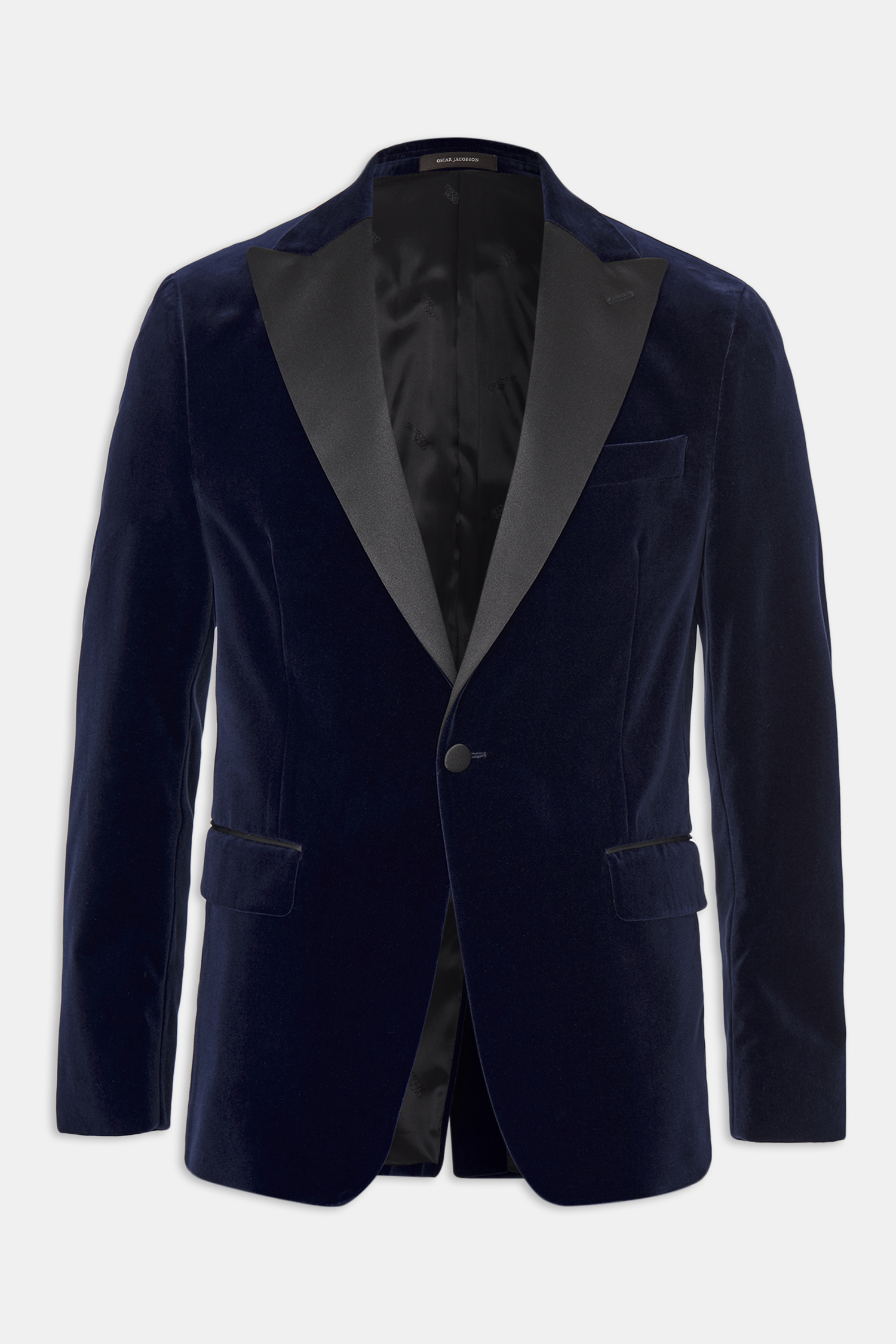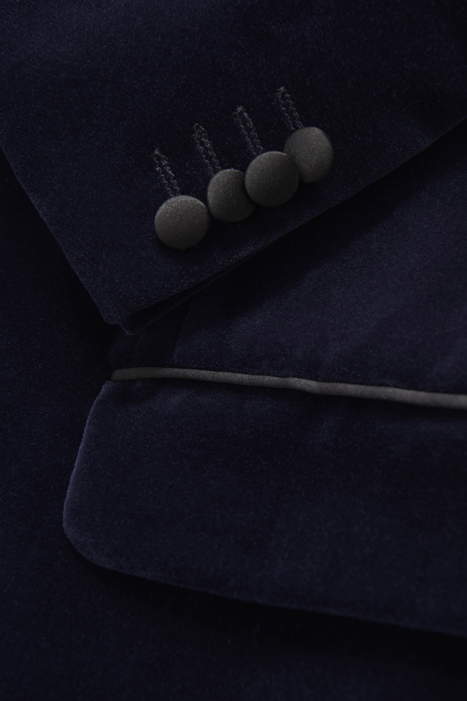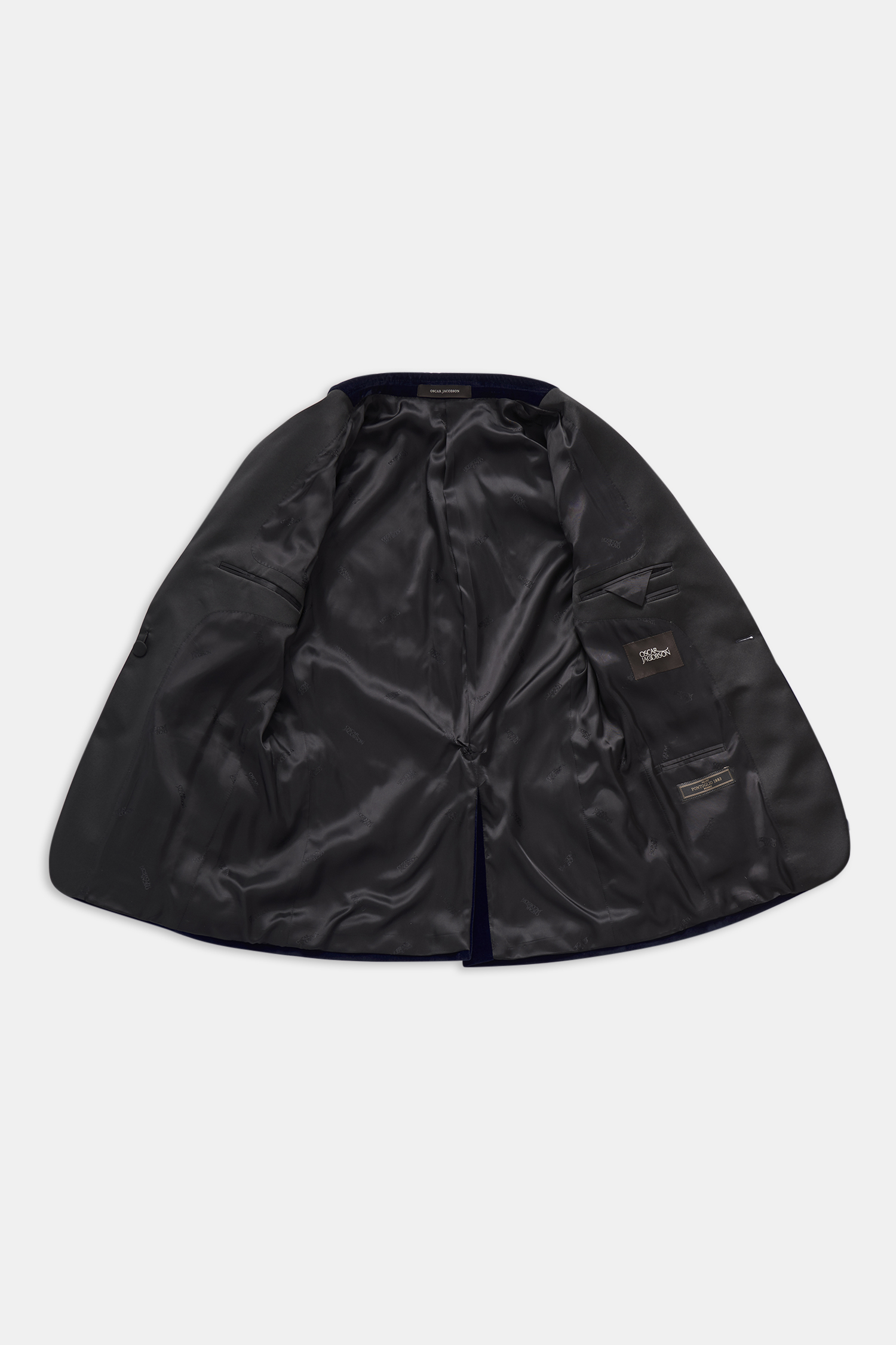 Smokingkavaj i sammet med spetsiga sidenslag. Tillverkad i bomull från vävare Pontoglio. Normal passform som ger en modern silhuett utan att kännas tajt. Helfodrad insida i viskos för ökad komfort och känsla.