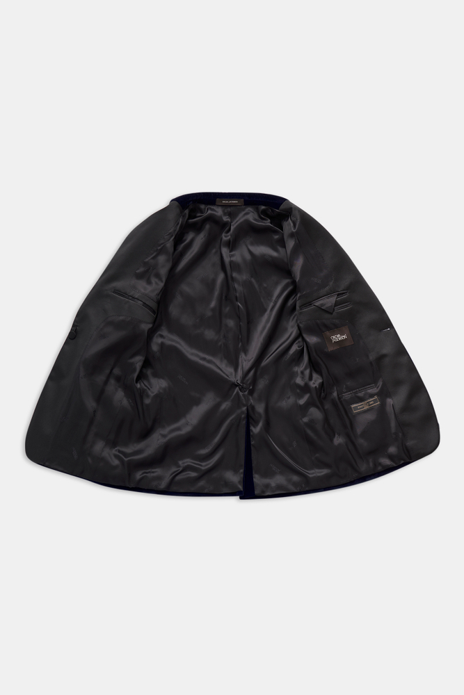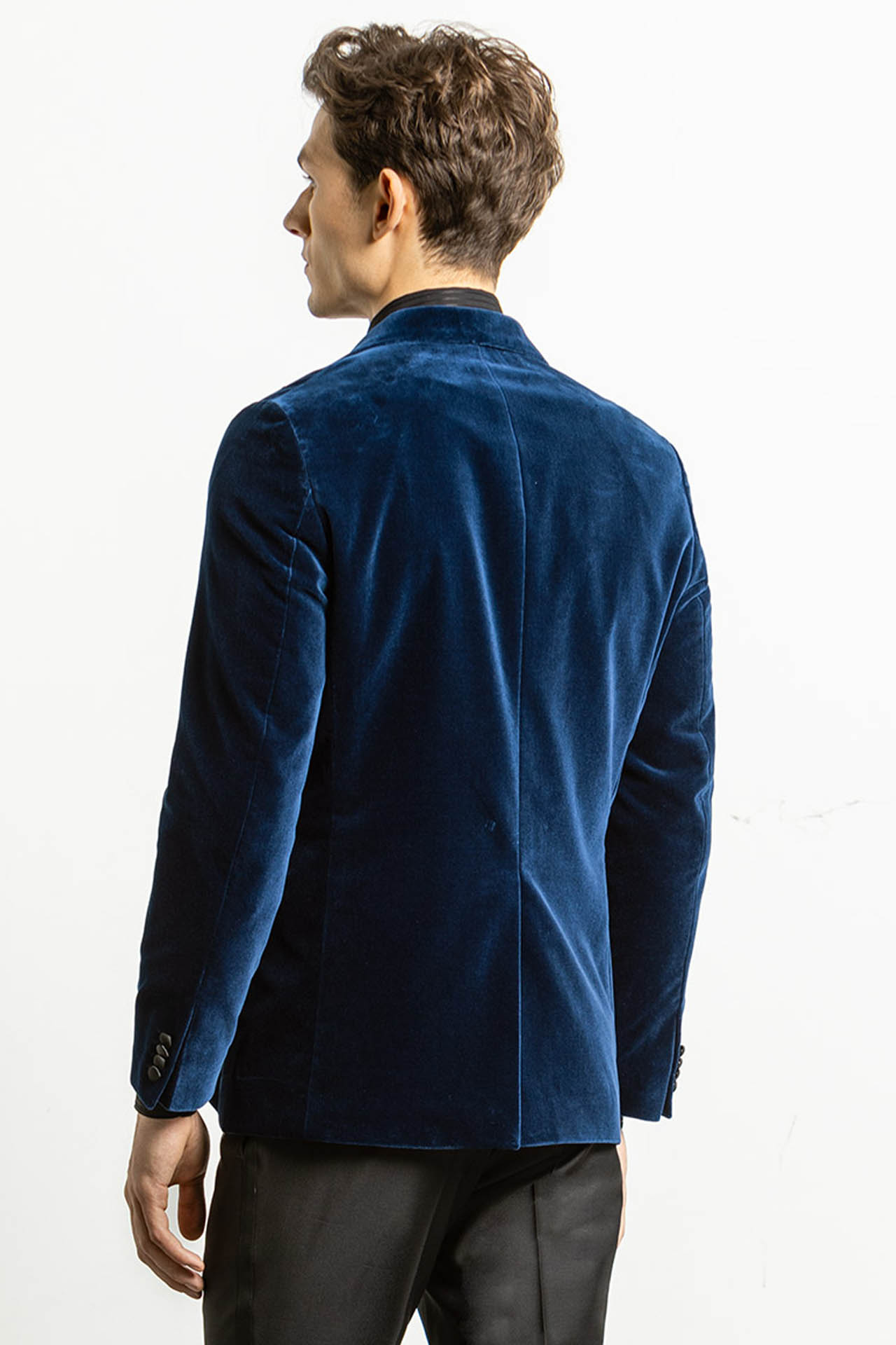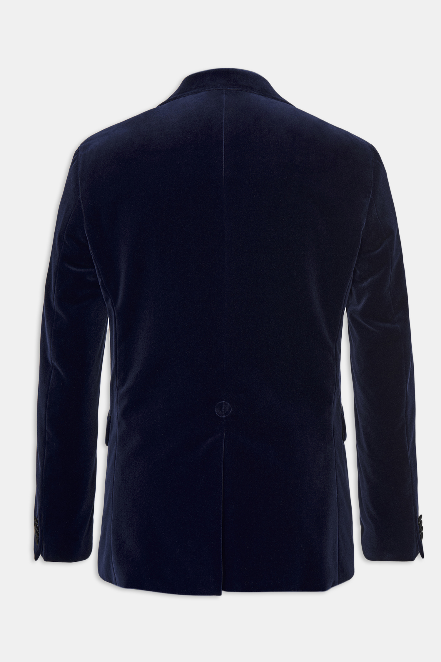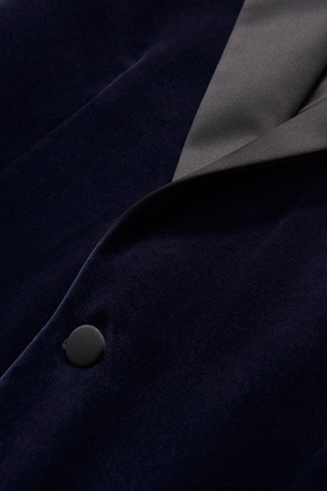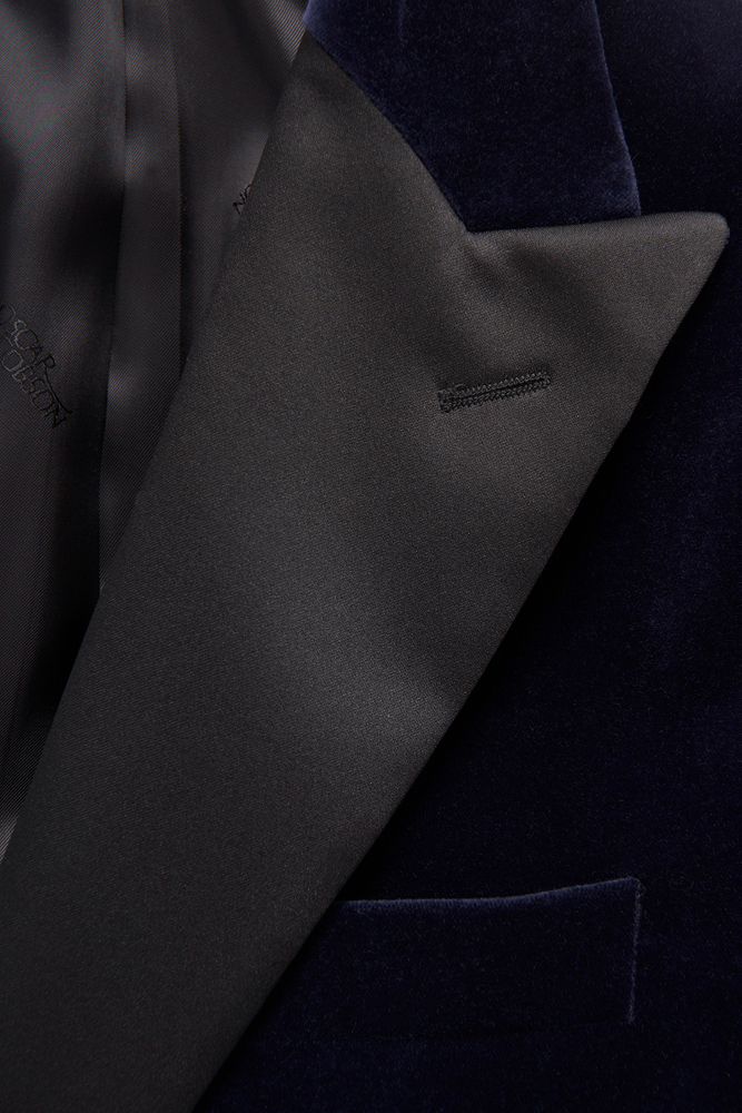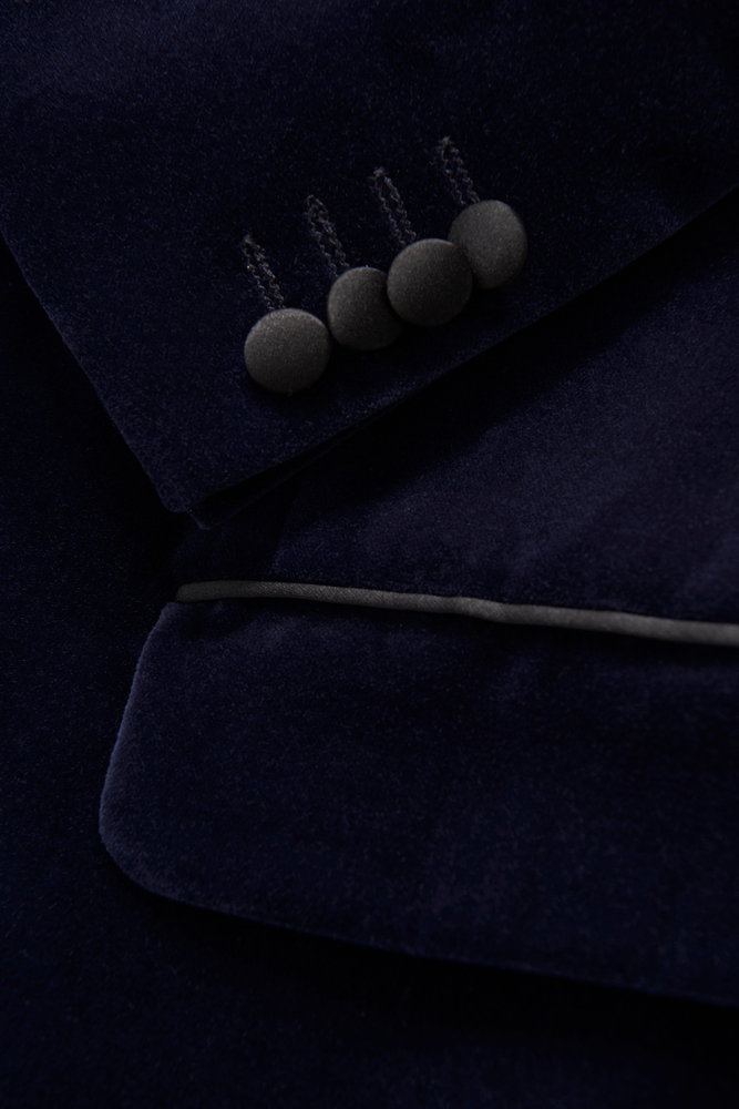 Smokingkavaj i sammet med spetsiga sidenslag. Tillverkad i bomull från vävare Pontoglio. Normal passform som ger en modern silhuett utan att kännas tajt. Helfodrad insida i viskos för ökad komfort och känsla.