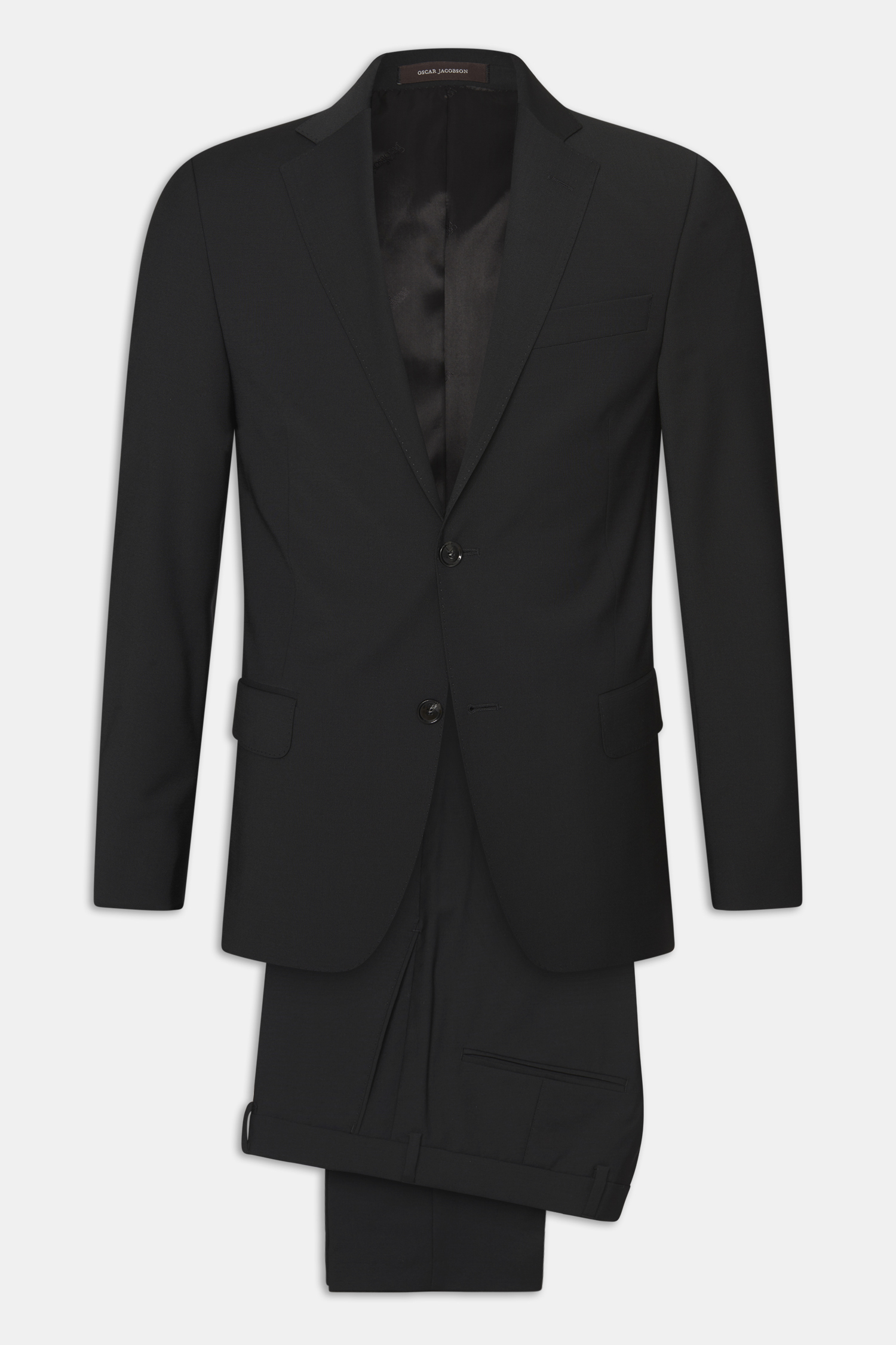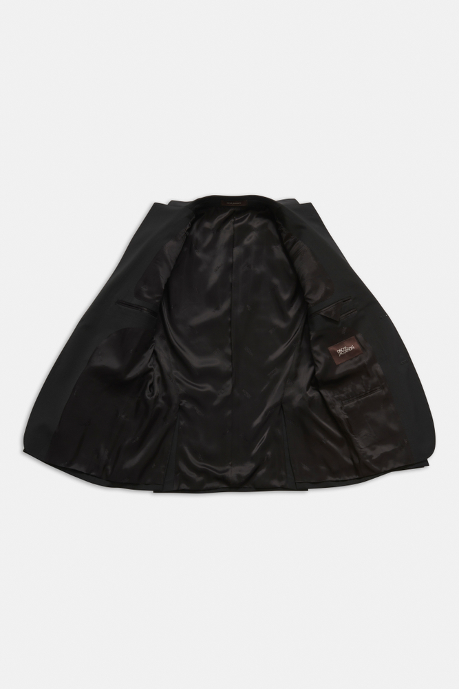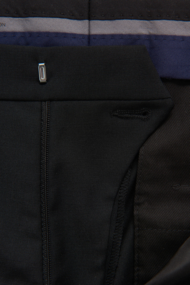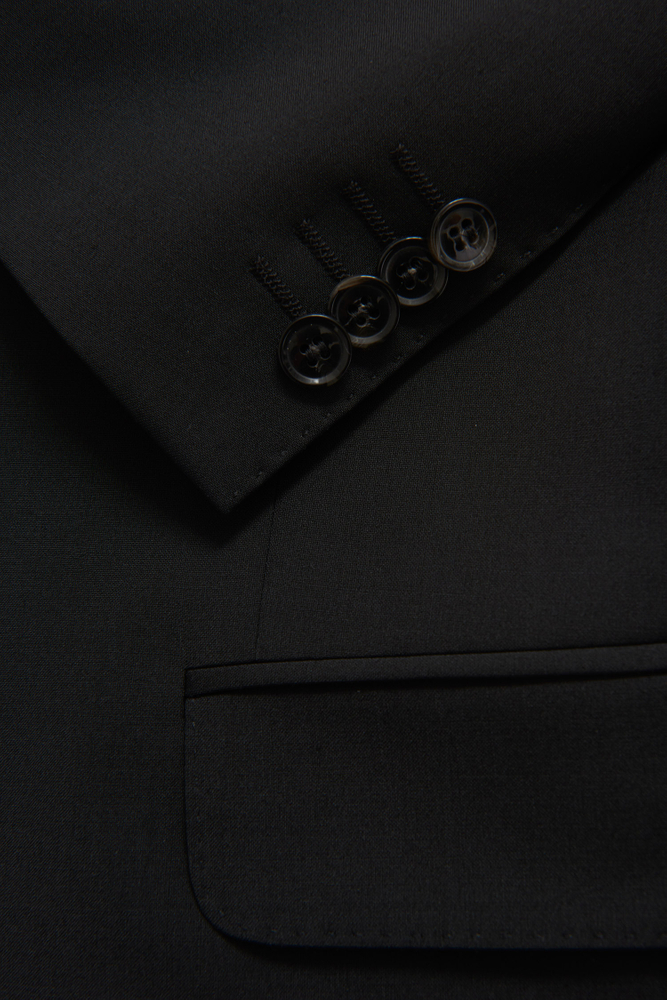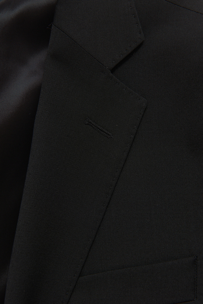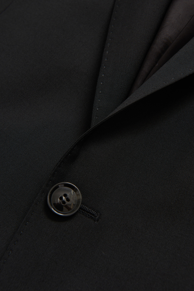 Klubbkostym i mörkblått ullgarn med struktur från italienska väveriet Marzotto. En mjuk konstruktion där mellanlägg och axeluppbyggnad är närmst obefintlig. Kavajen är fodrad och har fickor med ficklock. Tillhörande byxor har en klassisk, något avsmalnande passform och en normalhög midja.