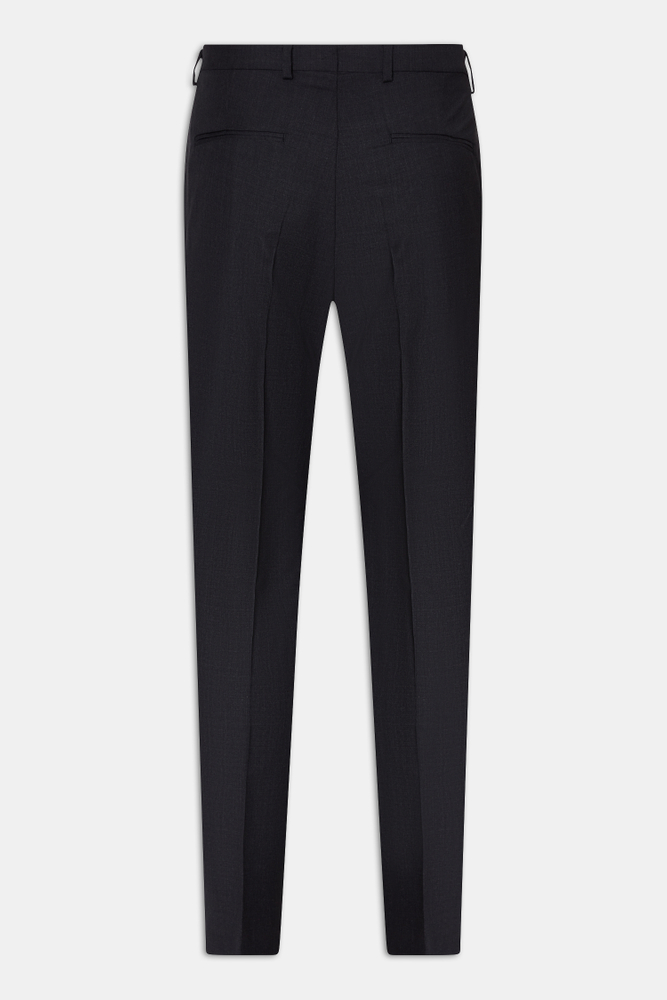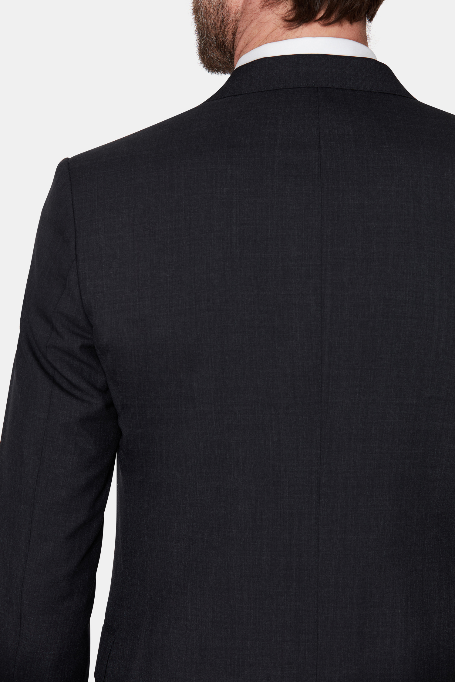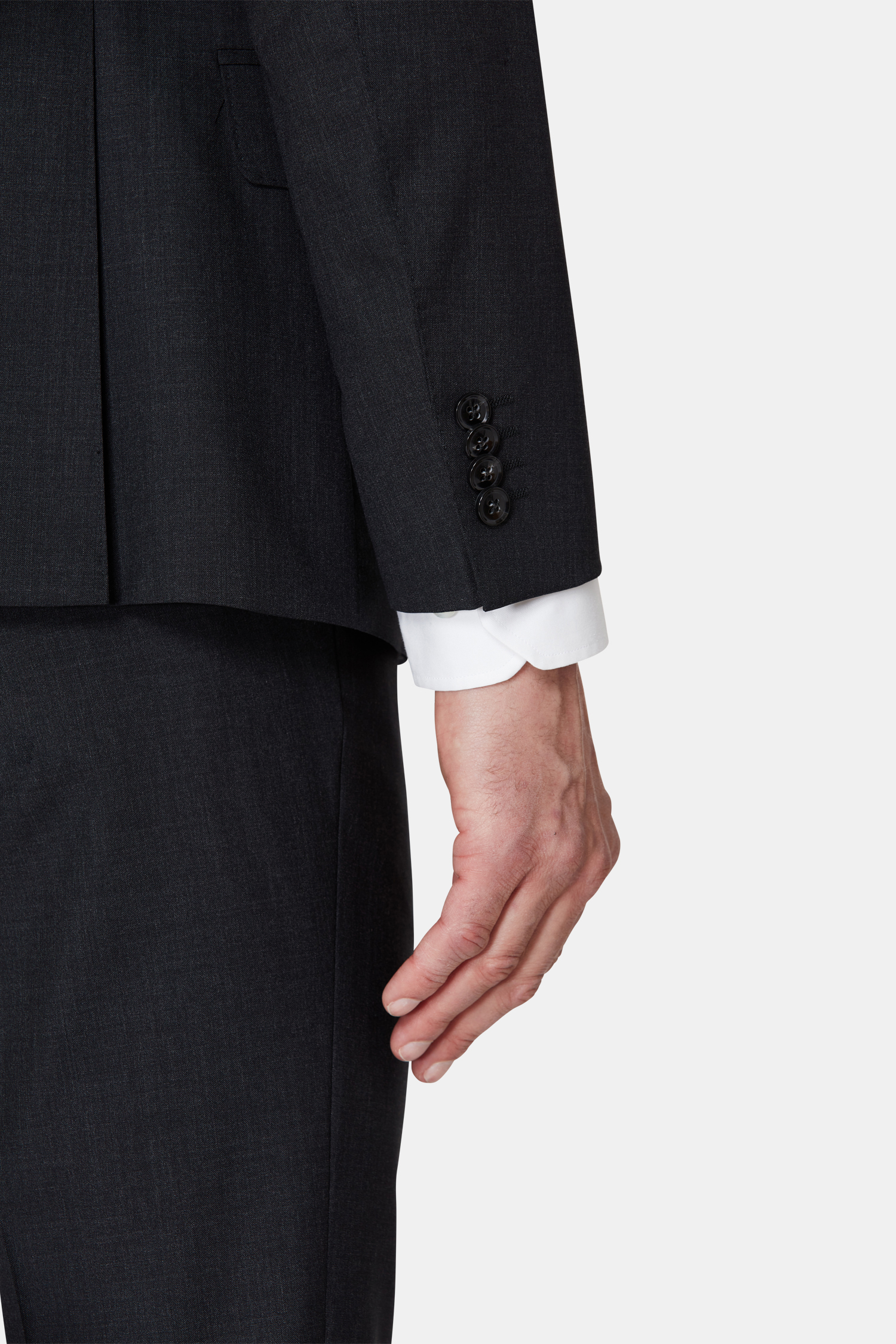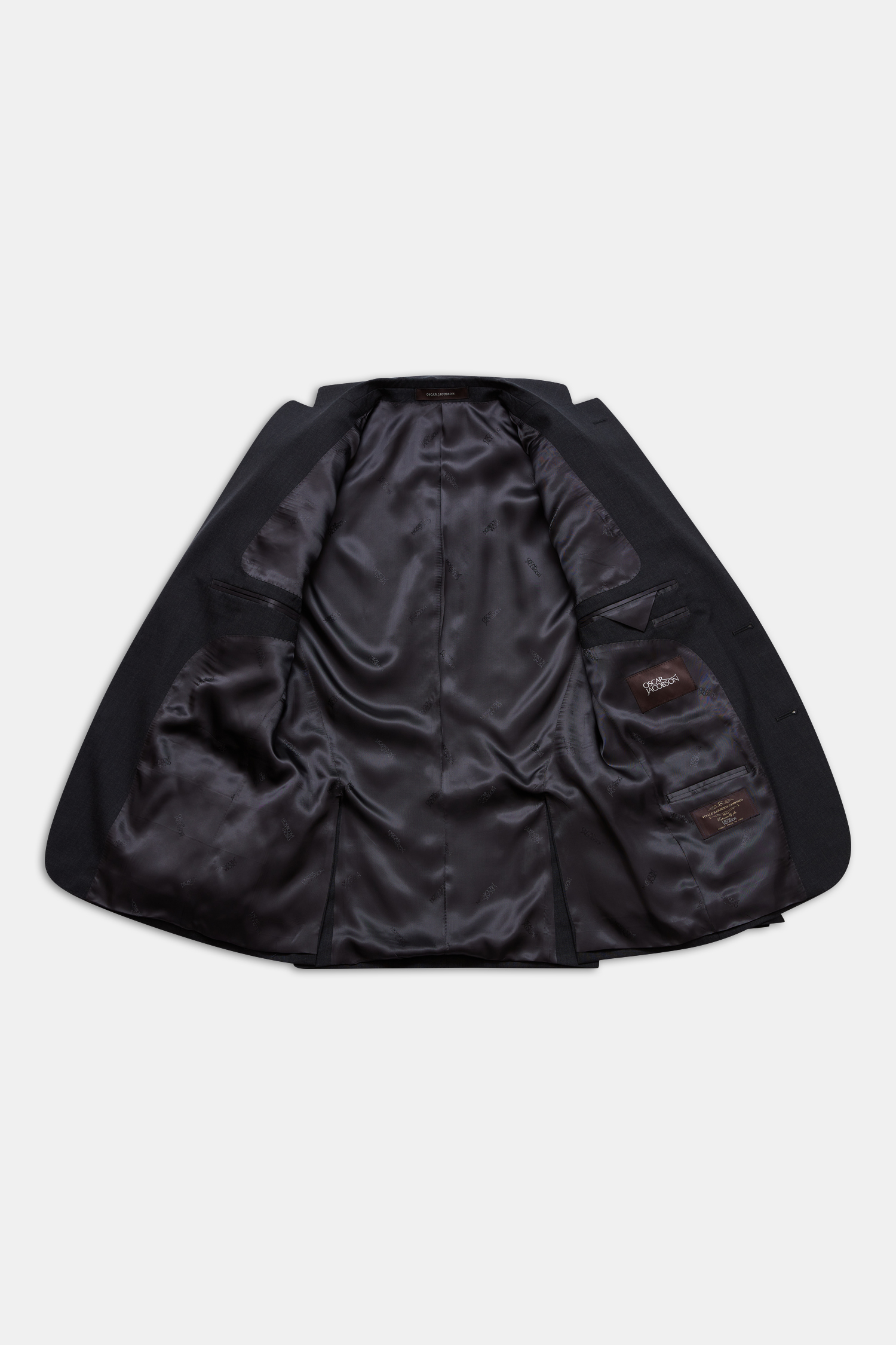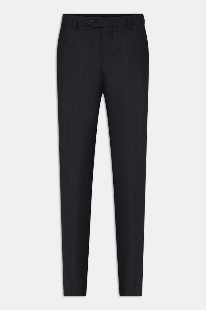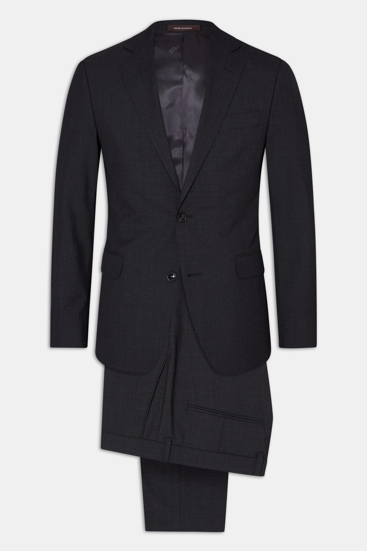 Klubbkostym i mörkblått ullgarn med struktur från italienska väveriet Marzotto. En mjuk konstruktion där mellanlägg och axeluppbyggnad är närmst obefintlig. Kavajen är fodrad och har fickor med ficklock. Tillhörande byxor har en klassisk, något avsmalnande passform och en normalhög midja.