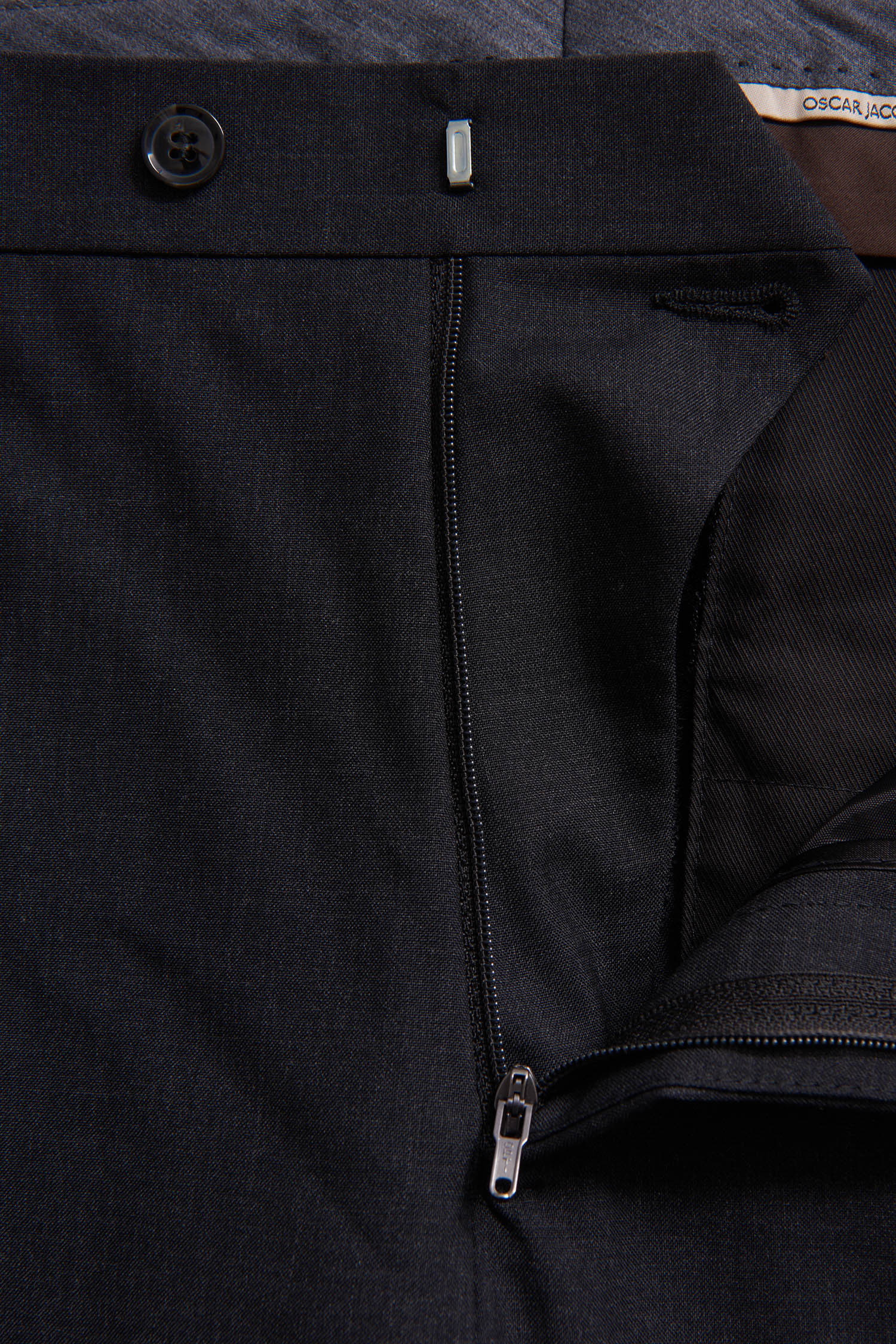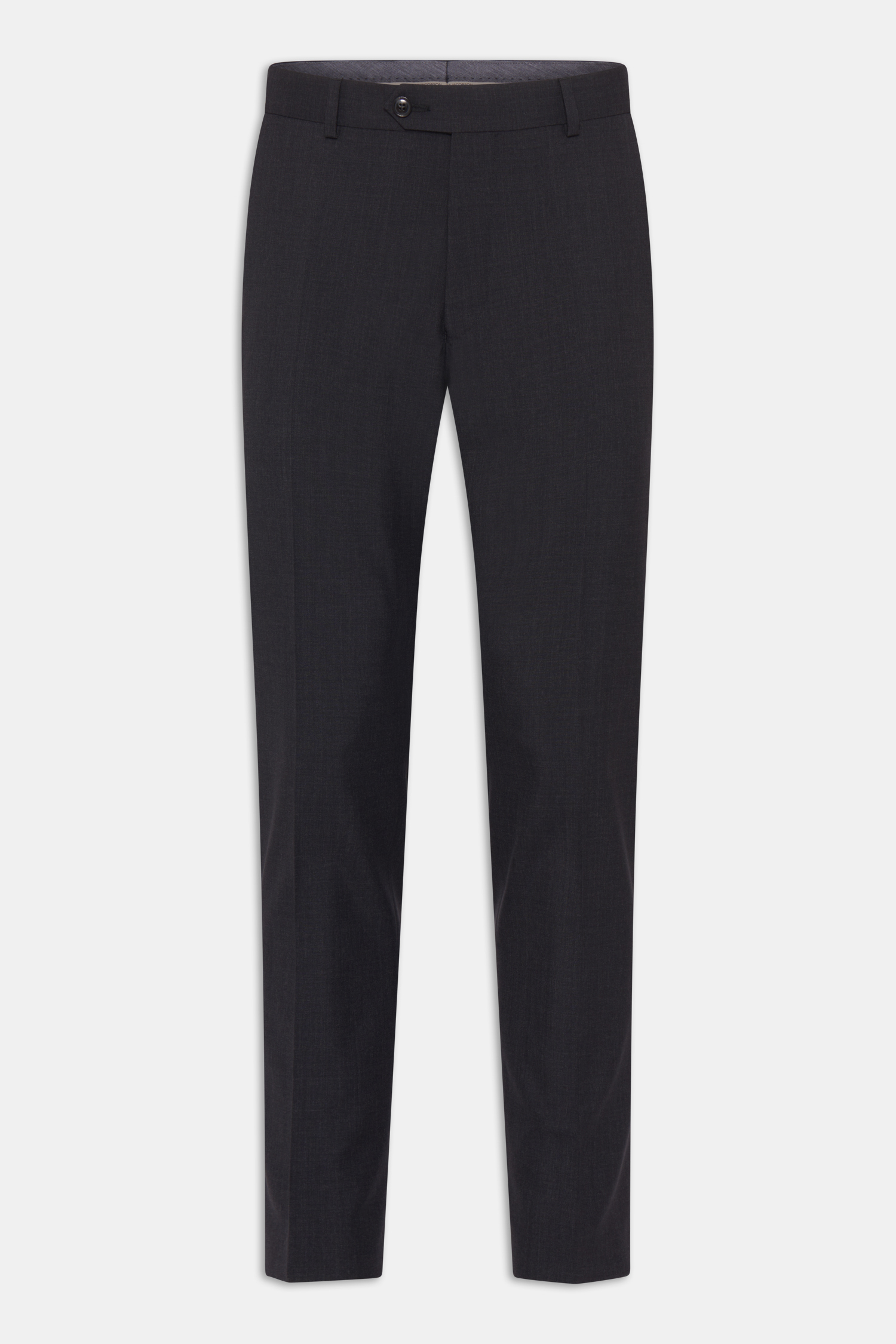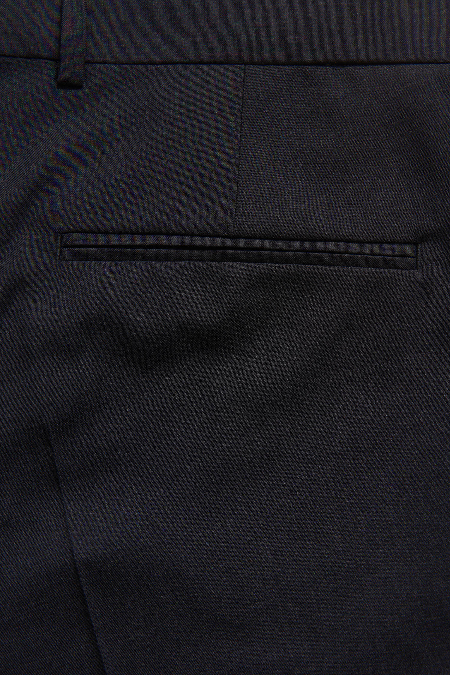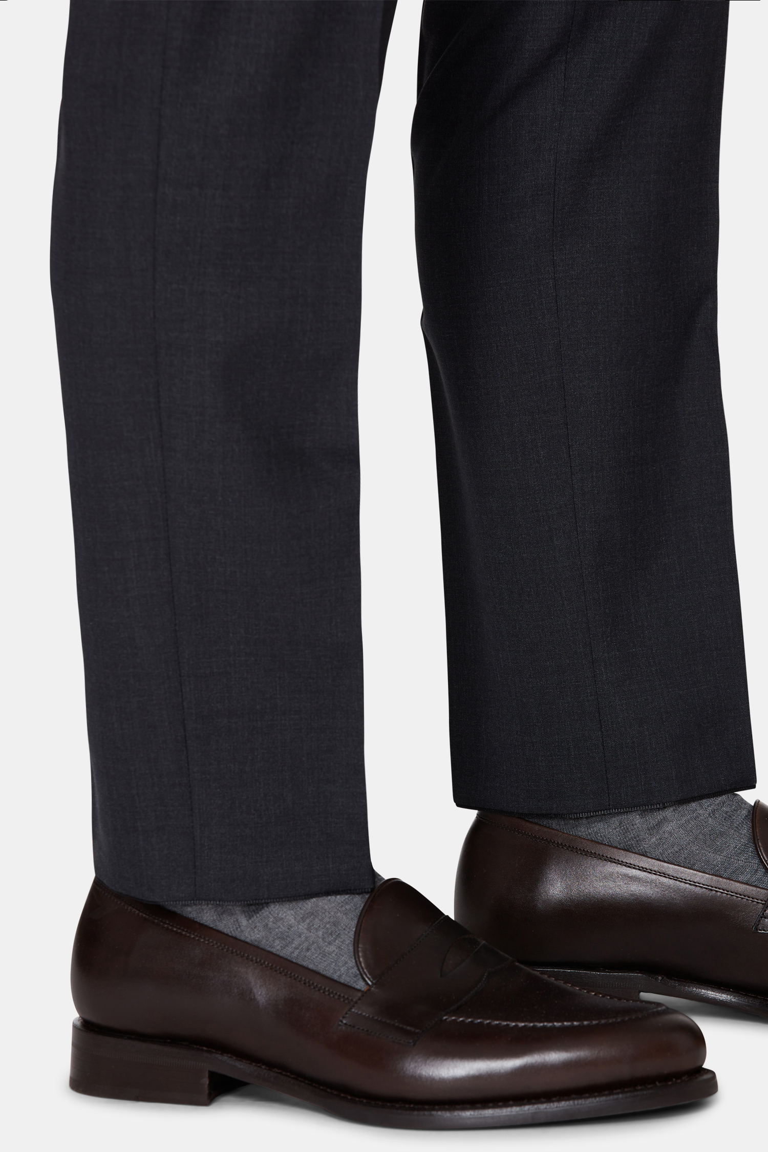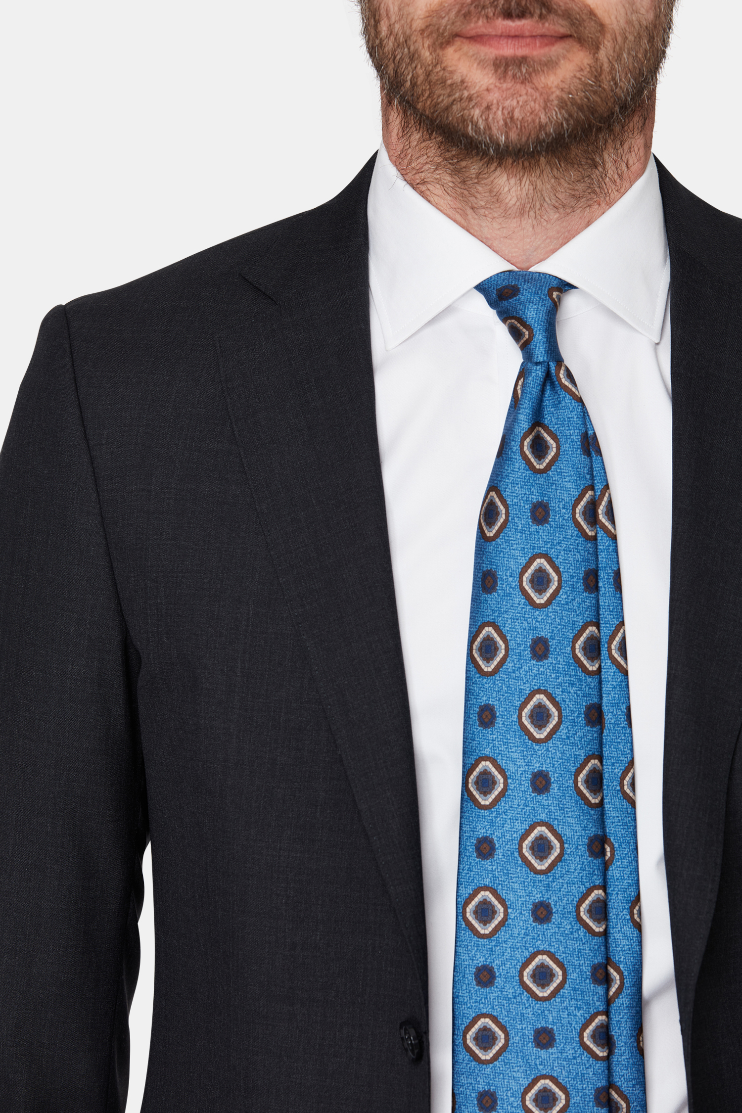Klubbkostym i mörkblått ullgarn med struktur från italienska väveriet Marzotto. En mjuk konstruktion där mellanlägg och axeluppbyggnad är närmst obefintlig. Kavajen är fodrad och har fickor med ficklock. Tillhörande byxor har en klassisk, något avsmalnande passform och en normalhög midja.