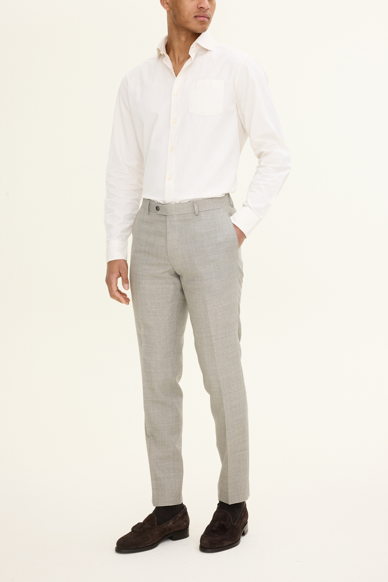 De här byxorna är tillverkade i en tropicalvävd ull med elegant mikrostruktur. Modellen har en avsmalnande passform och en benlängd som är något kortare än den klassiska kostymbyxans. En utmärkt uddabyxa till såväl skjorta som poloshirt!